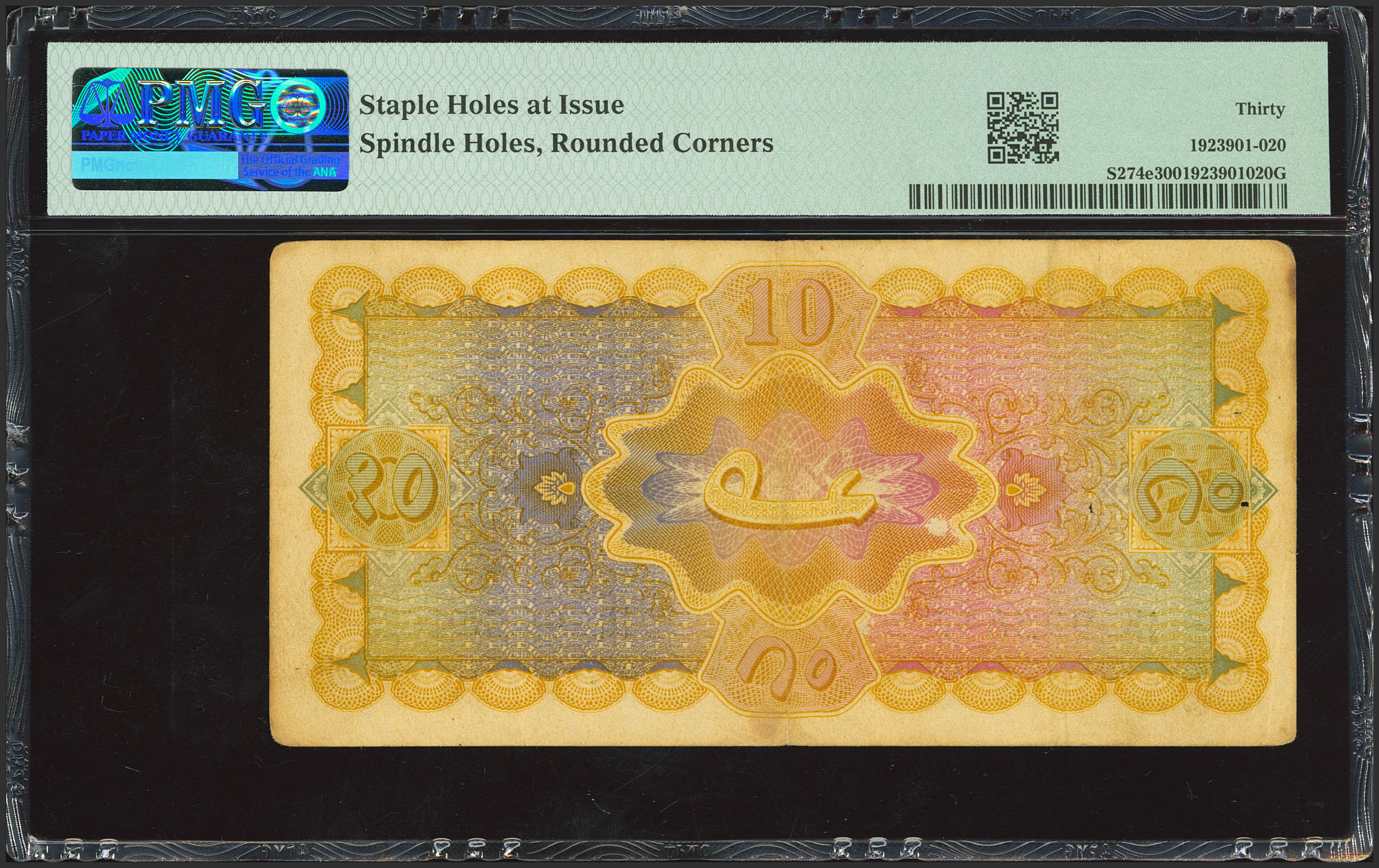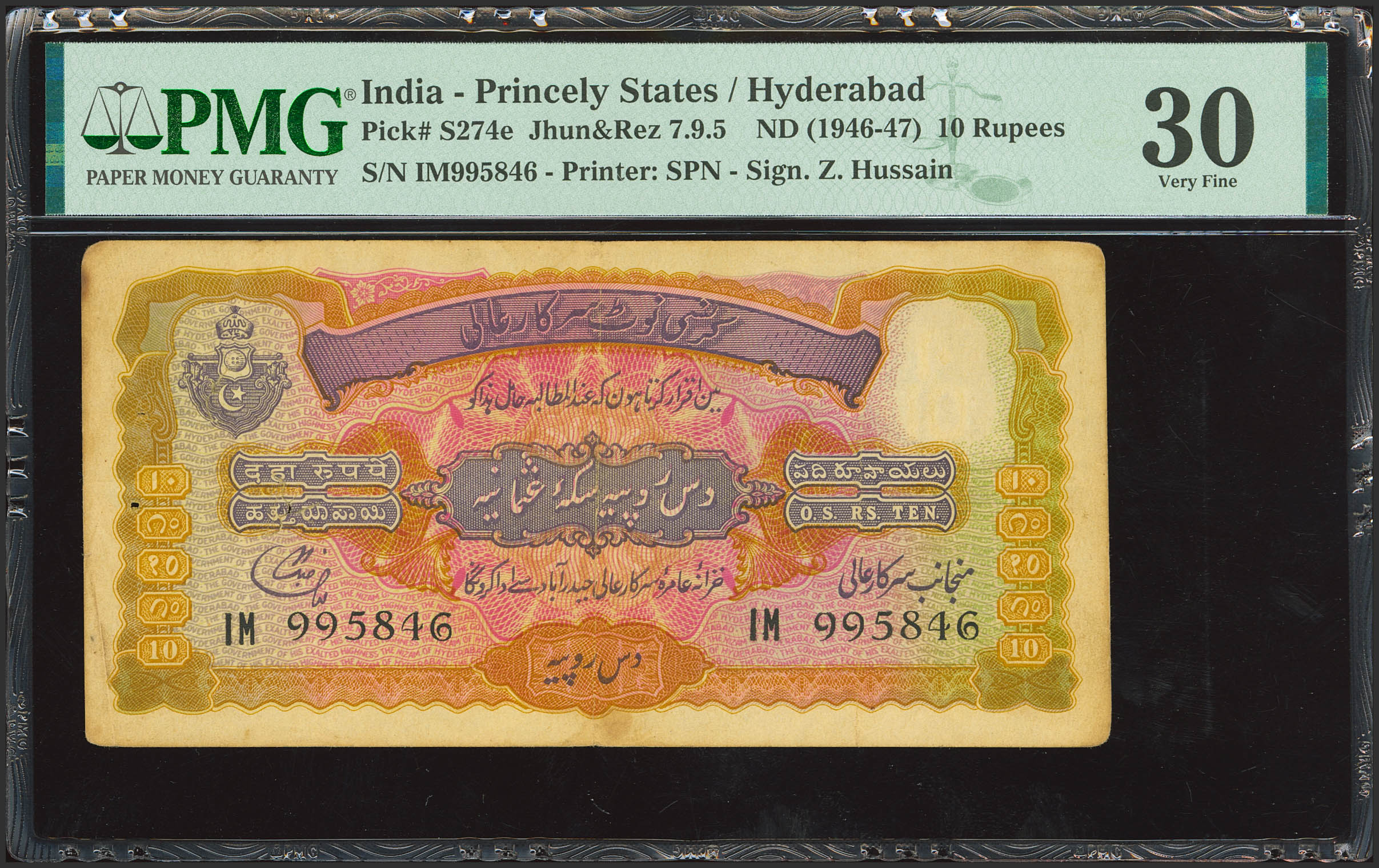 INDIA-PRINCELY STATES. 10 Rupees. (1946ca). Government of Hyderabad. Liaquat Jung. (Pick: S274e). PMG30 (staple holes at Issue, spindle holes, rounded corners).