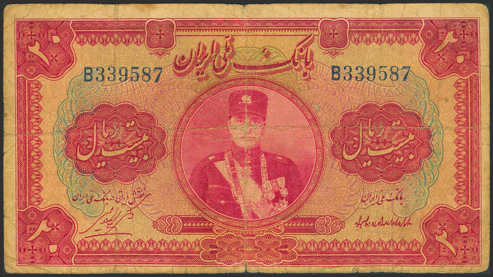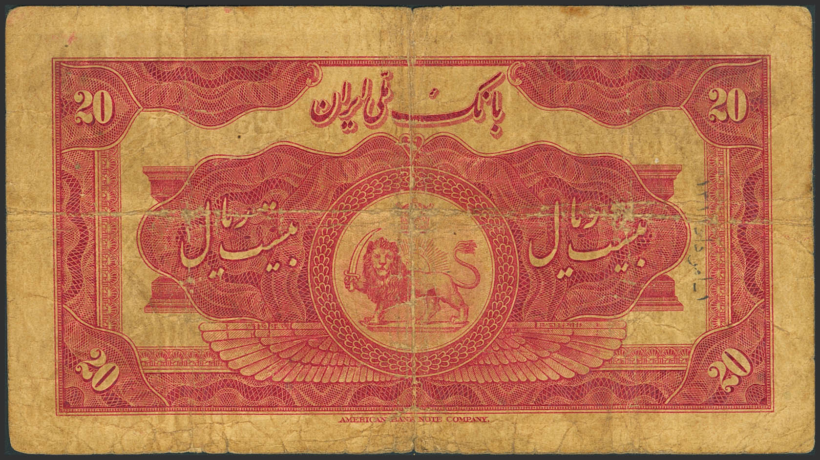 IRAN. 20 Rials. (1932ca). Bank Melli Iran. (Pick: 20a). Pinholes, tears. Fine.