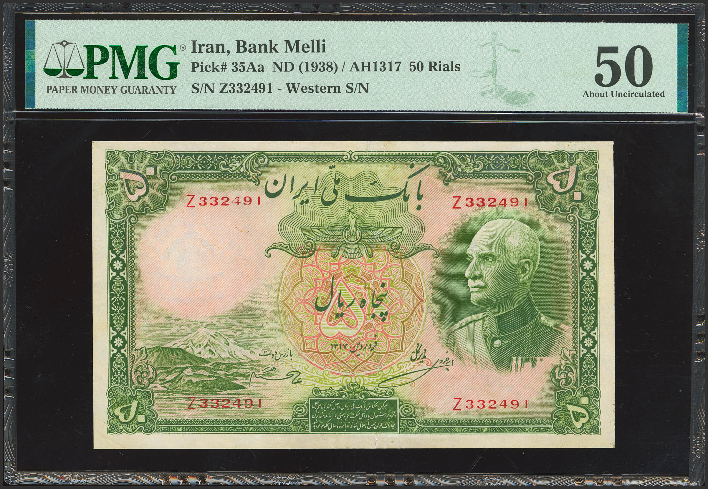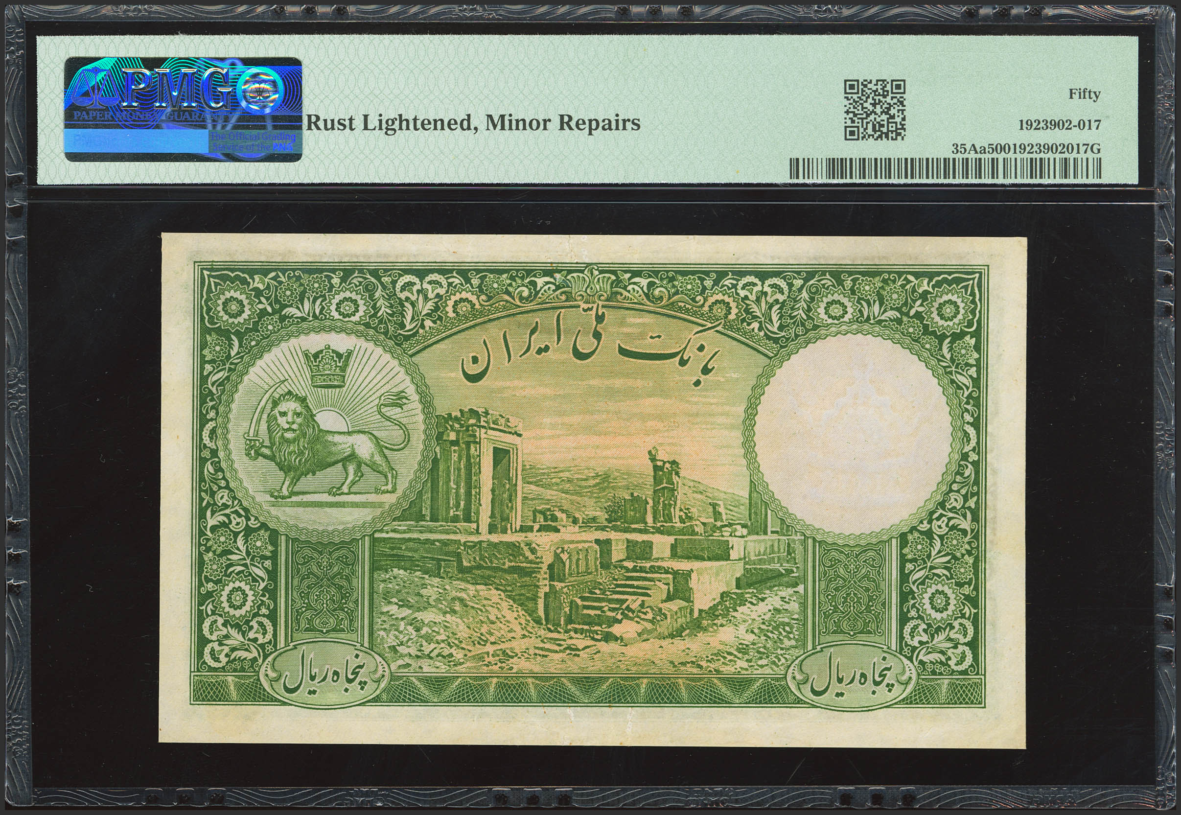 IRAN. 50 Rials. (1938ca). Bank Melli Iran. SH1317. (Pick: 35Aa). PMG50 (rust lightened, minor repairs).