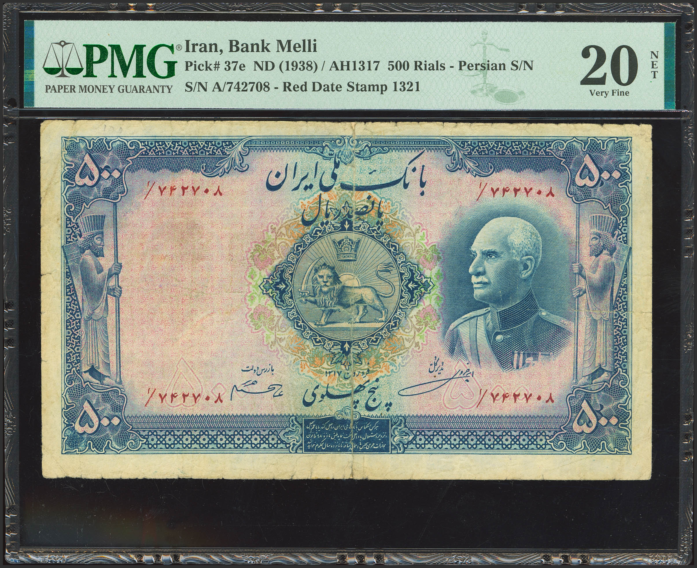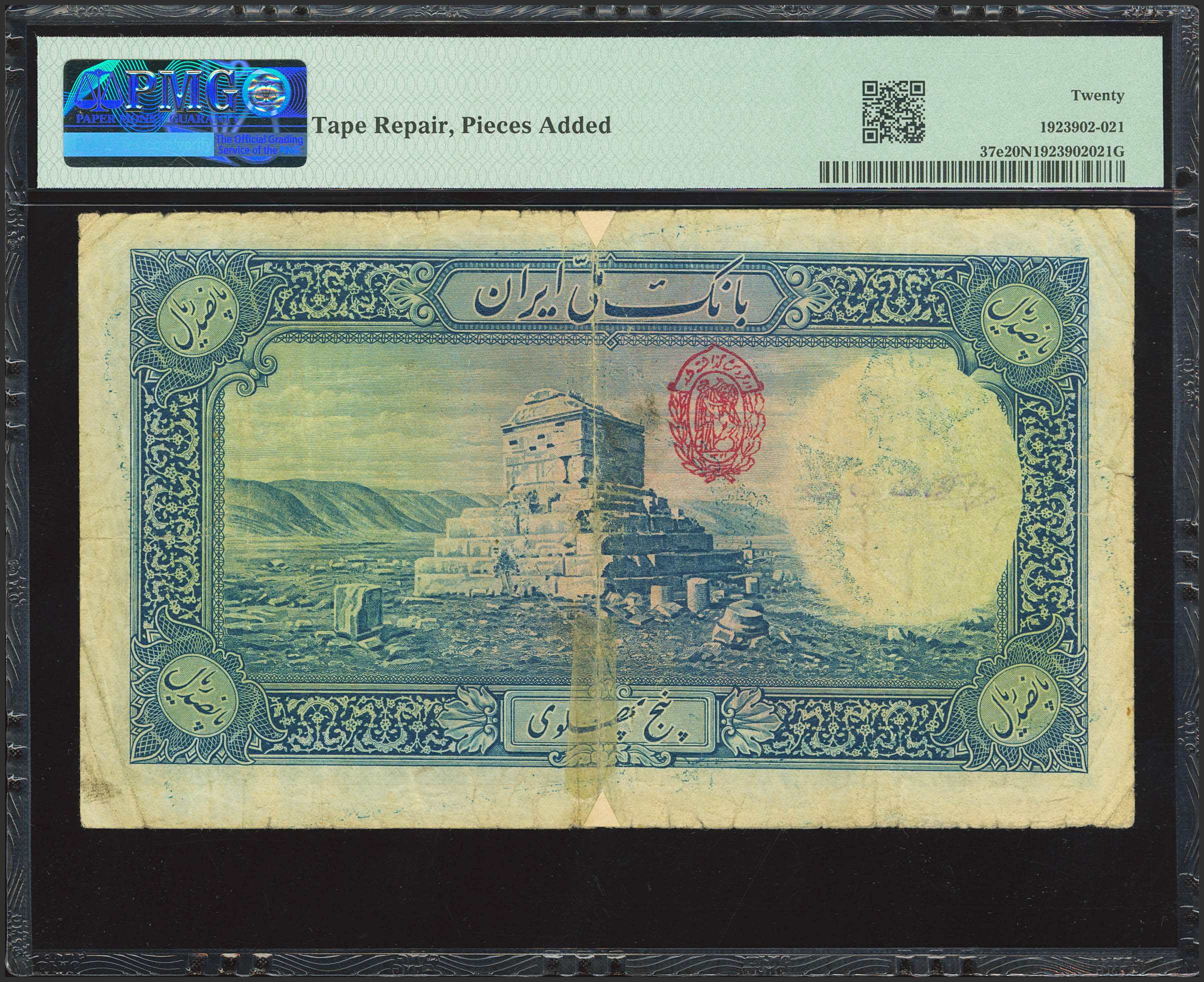 IRAN. 500 Rials. (1938ca). Bank Melli Iran. Red stamp on back with date SH1321. (Pick: 37e). PMG20NET (tape repair, pieces included).