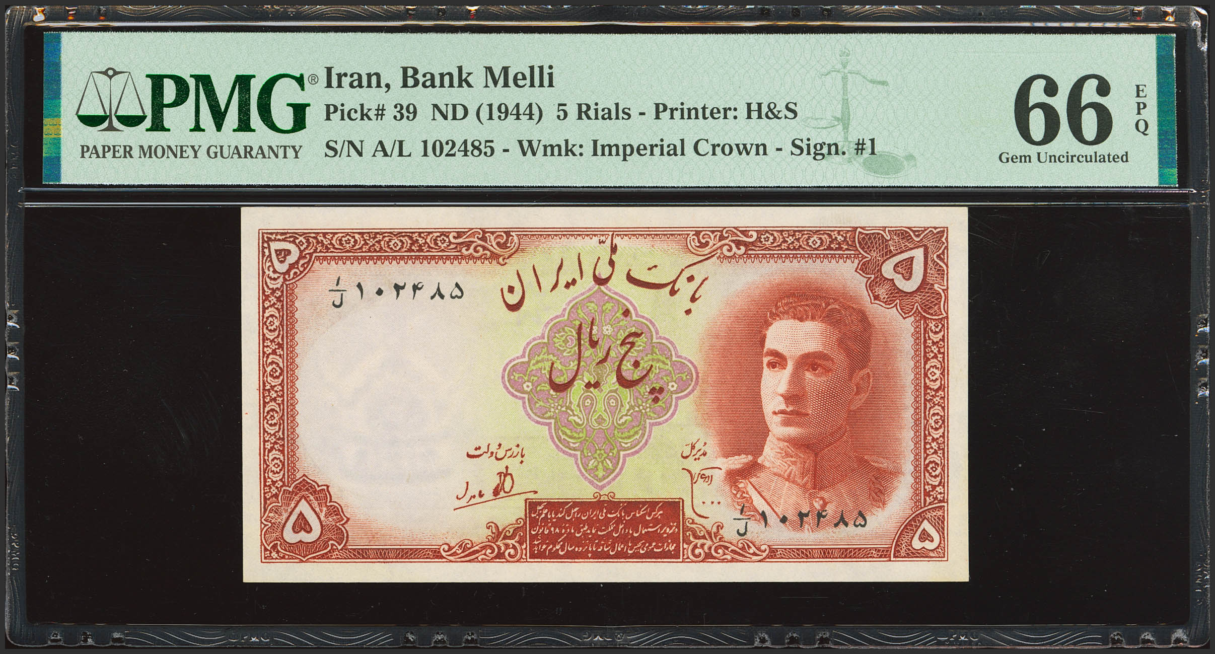 IRAN. 5 Rials. (1944ca). Bank Melli Iran. (Pick: 39). PMG66EPQ.