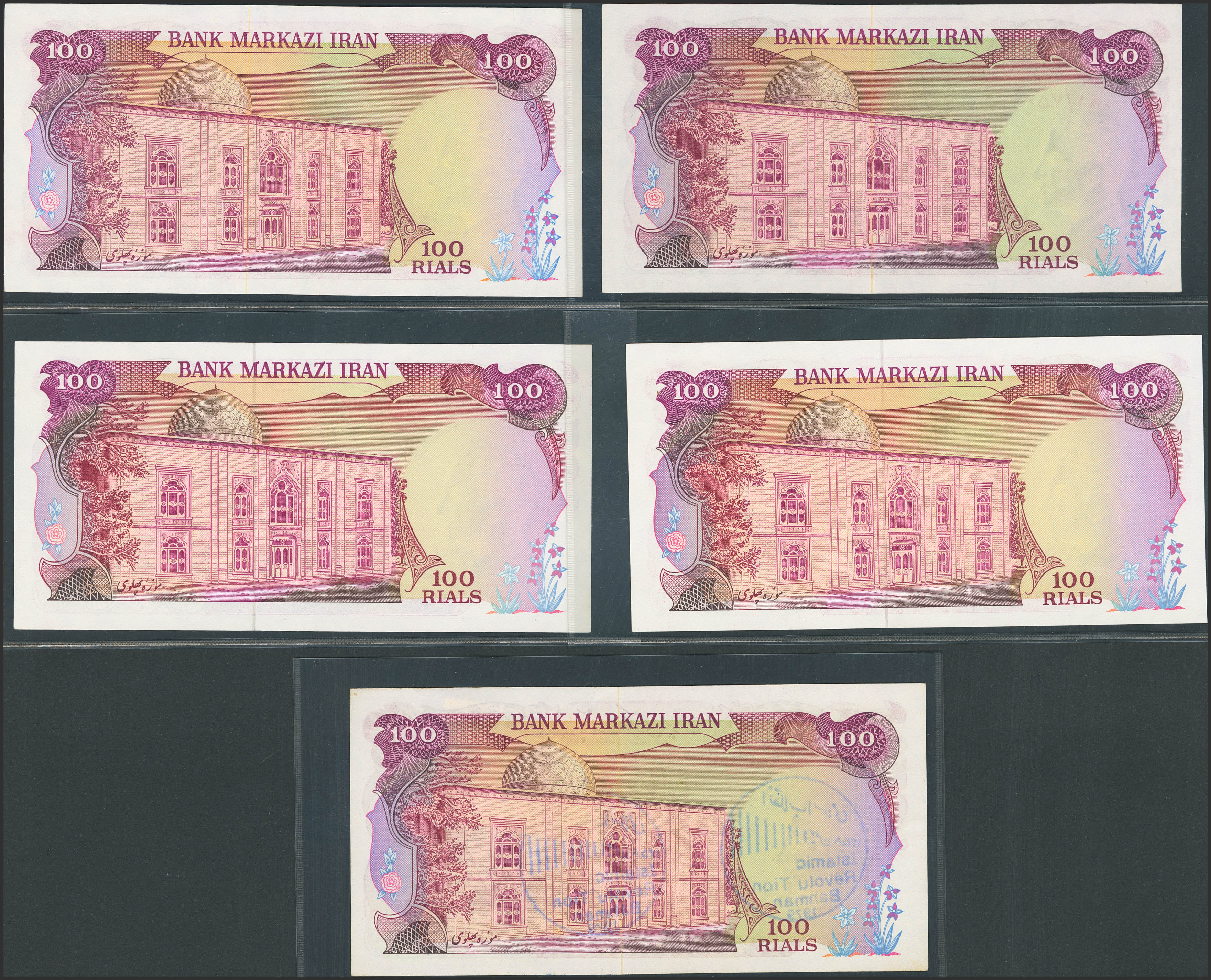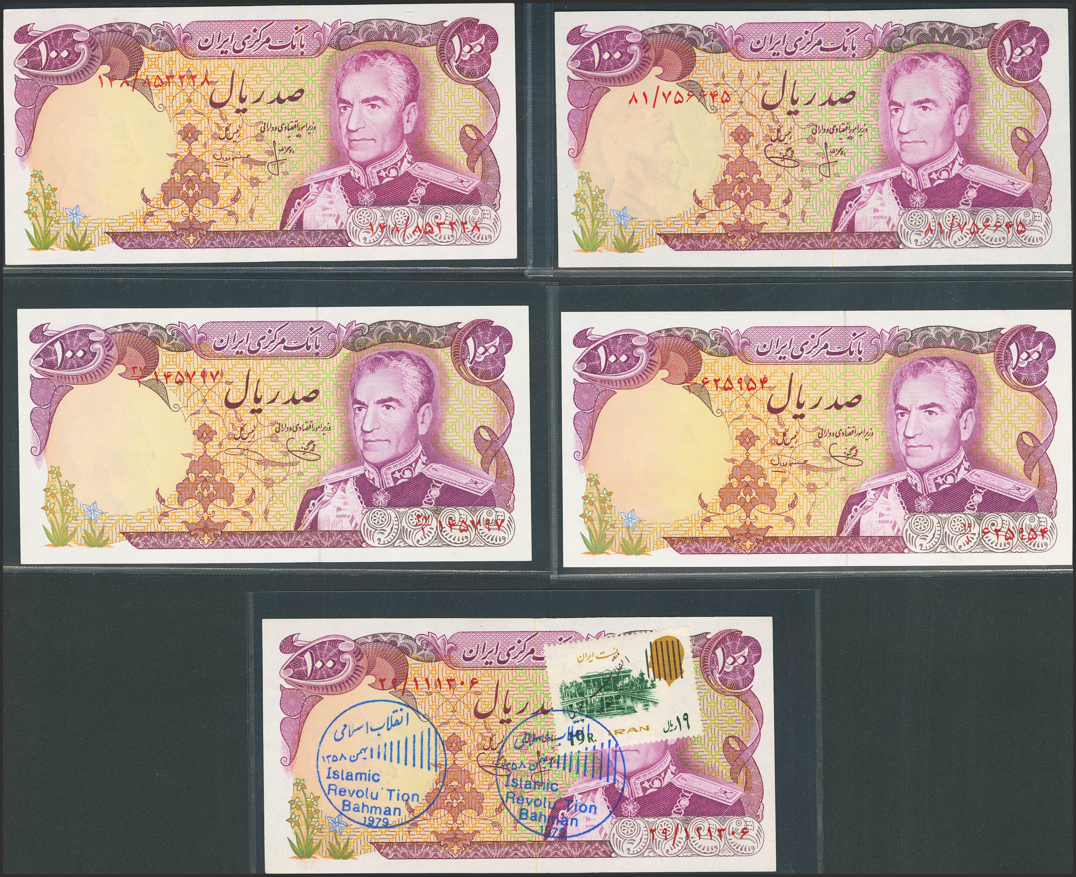 English IRAN. Lot of 5 notes of 100 Rials. (1947ca). Bank Markazi Iran. Including one with an ink stamp of the Islamic Revolution Bahman. (Pick: 102a, 102b, 102c, 102d, 102?). Uncirculated (4) and Less than Uncirculated (1).