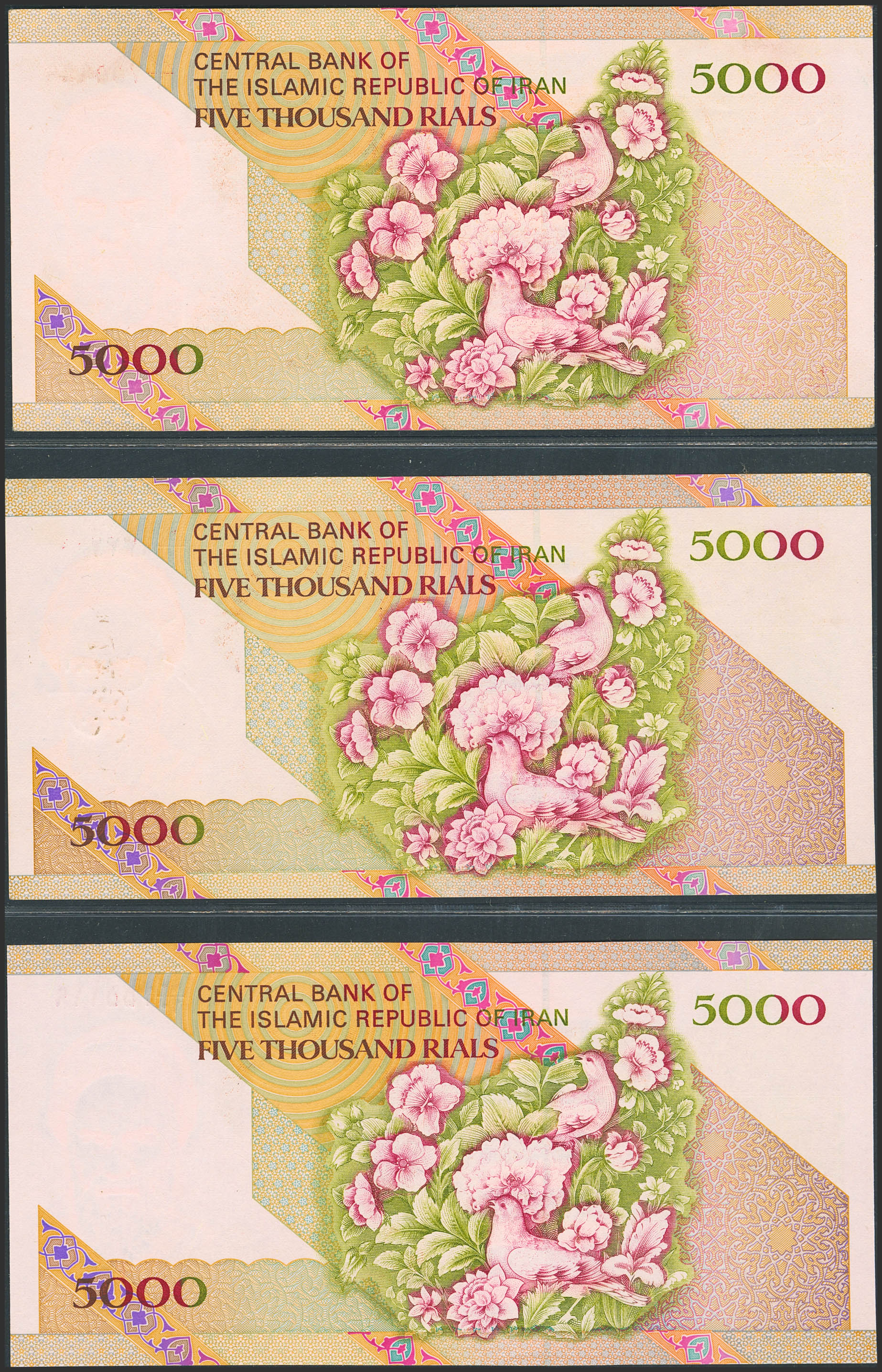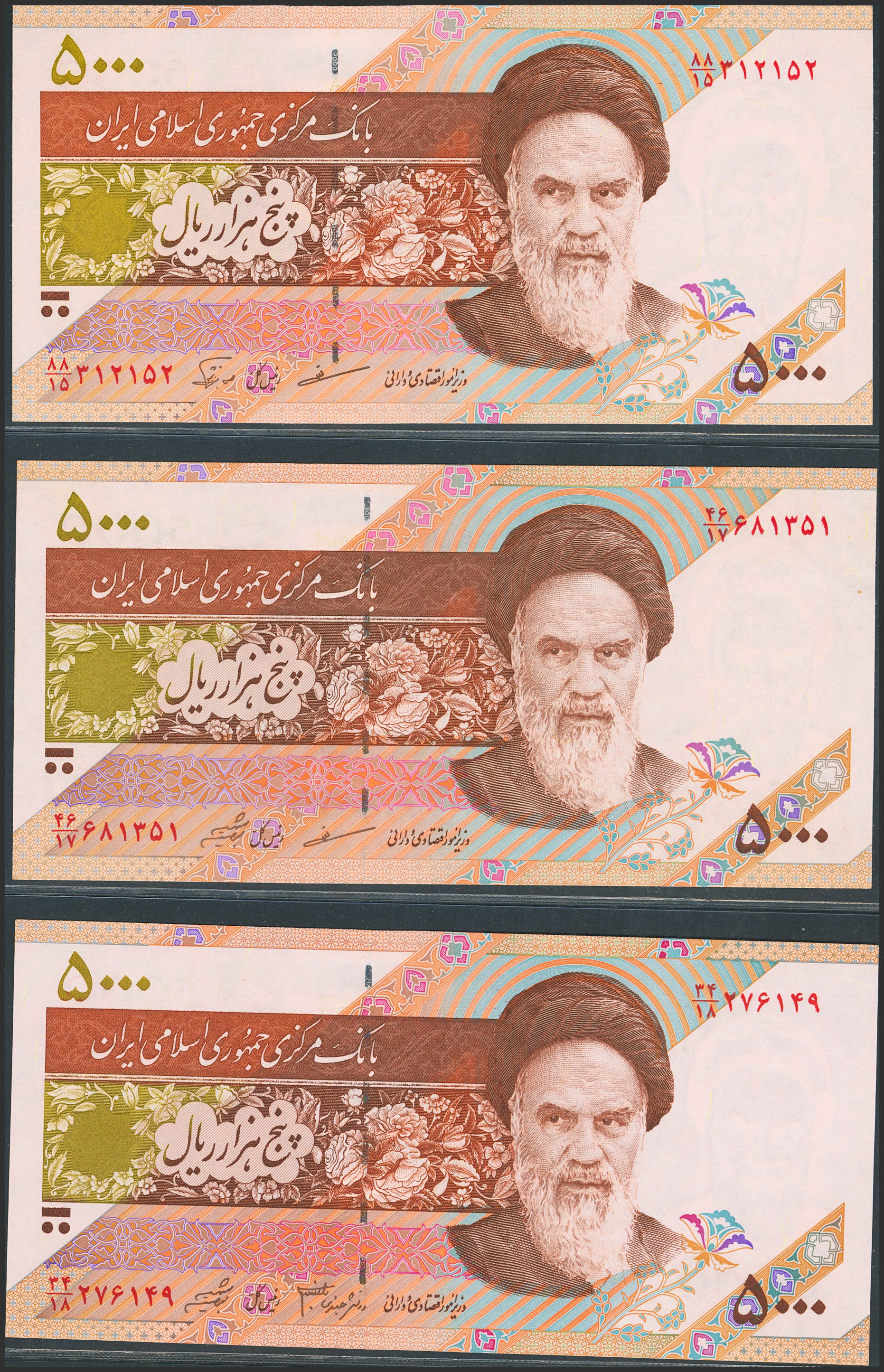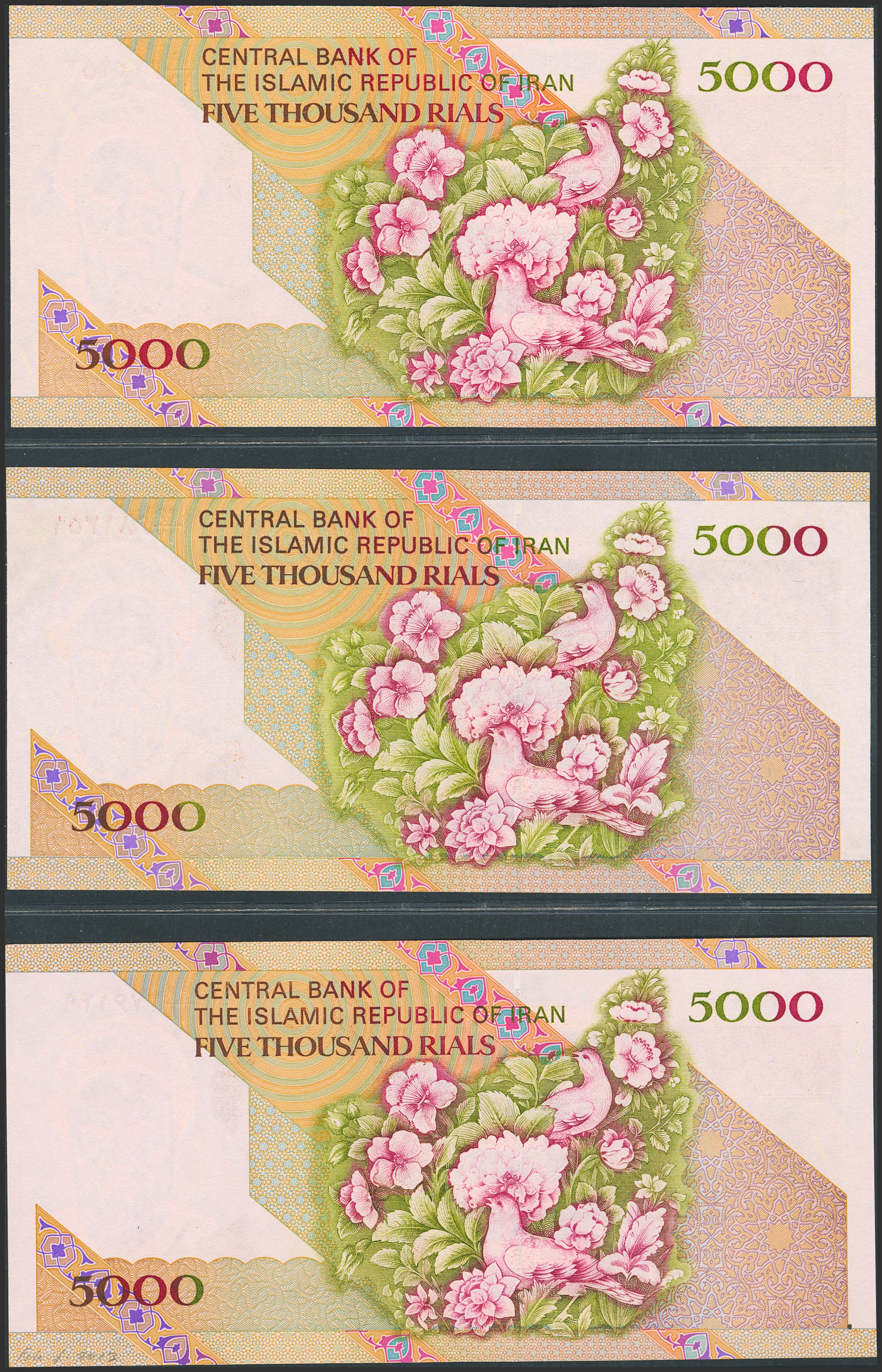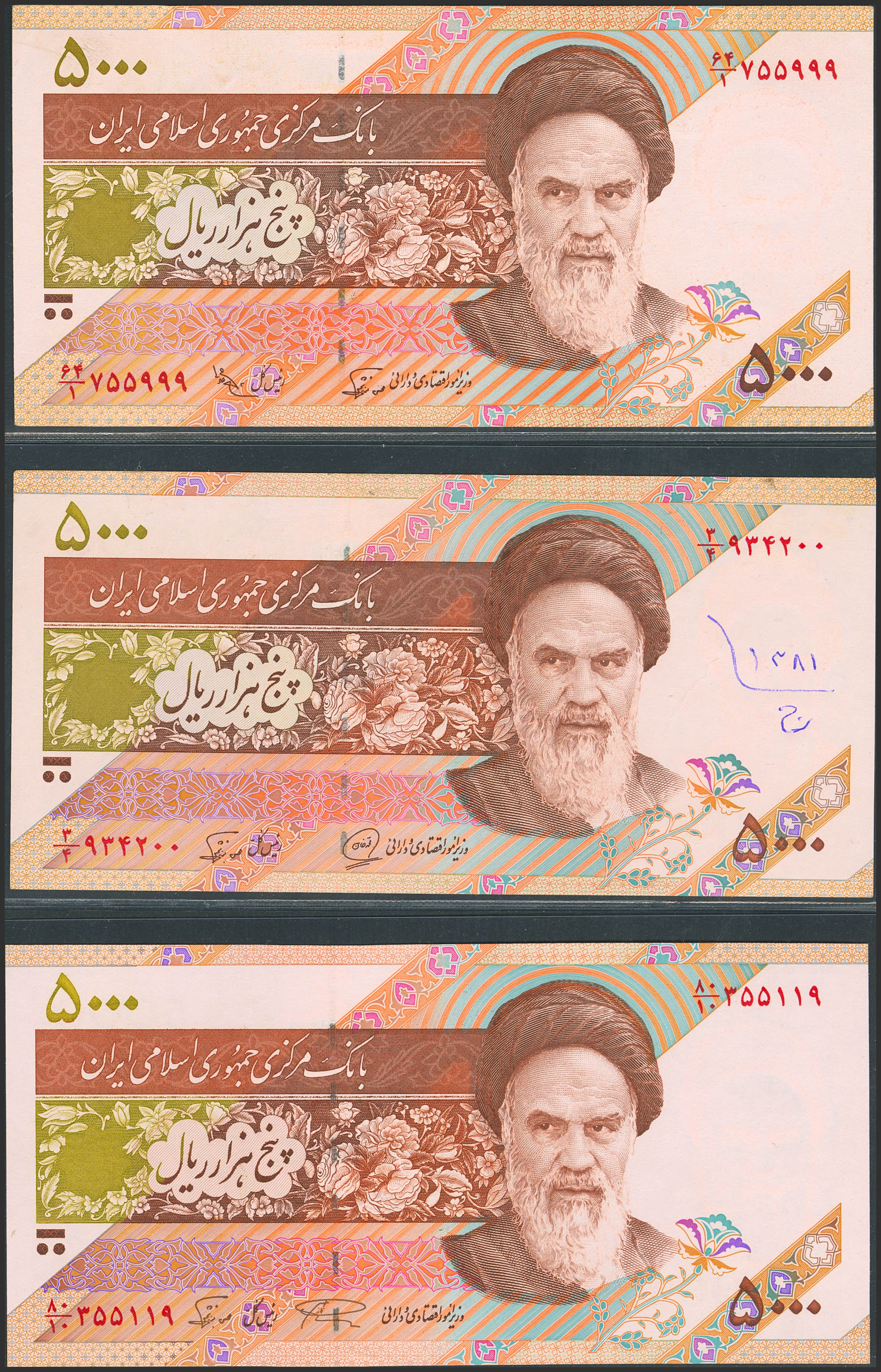 IRAN. Lot of 6 notes of 5000 Rials. (1993ca). Central Bank of the Islamic Republic. All subreferences of the reference. (Pick: 145a, 145b, 145c, 145d, 145e, 145f). One of them has pen writing. Uncirculated (5) and Less than Uncirculated (1).