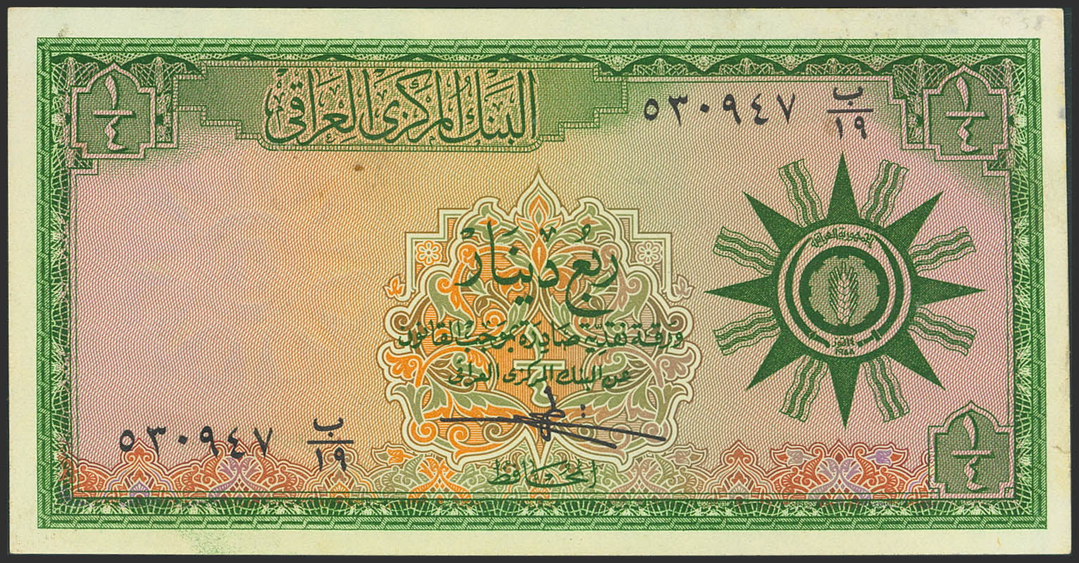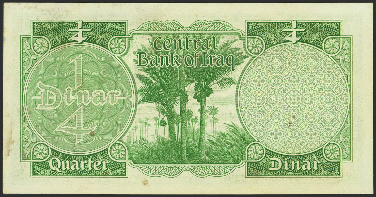 IRAQ. ¼ Dinar. (1959ca). Central Bank. (Pick: 51a). Stains and tears. Less than Uncirculated.