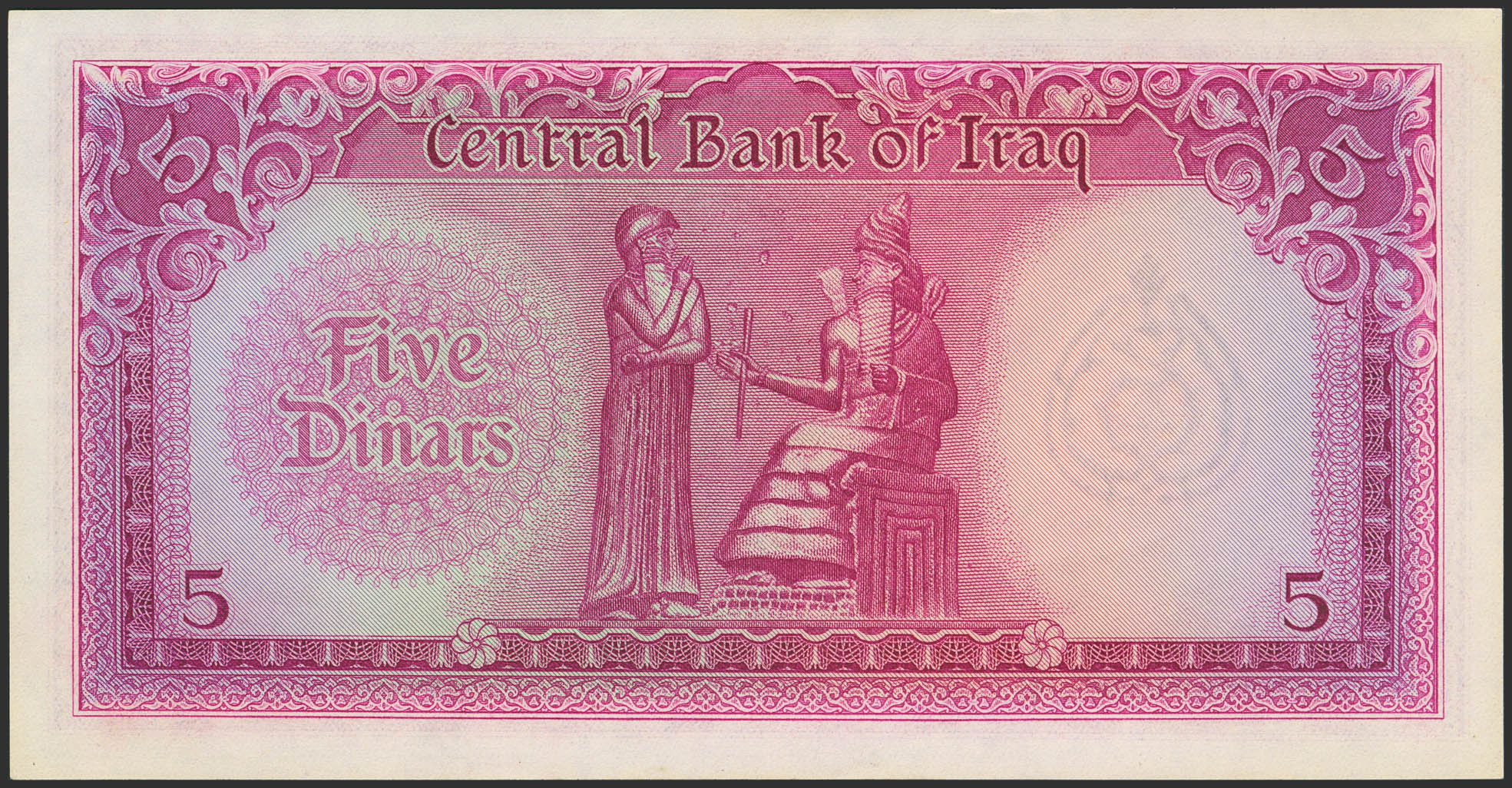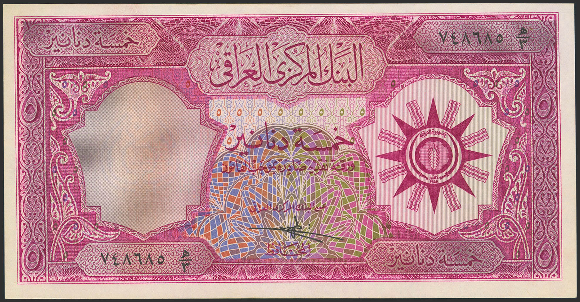 IRAQ. 5 Dinars. (1959ca). Central Bank. (Pick: 54a). No central fold, several counting marks and signs of handling. Almost Uncirculated.