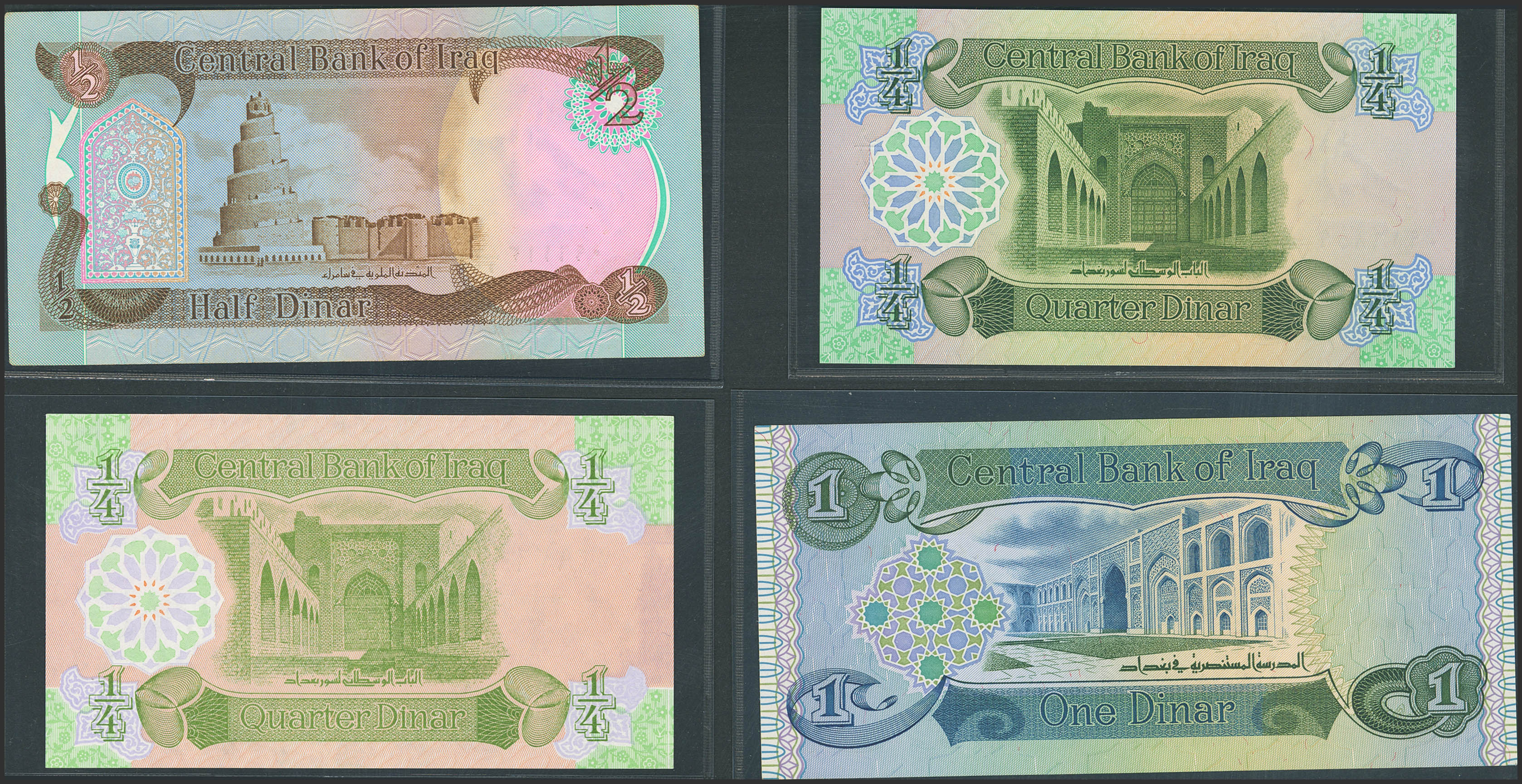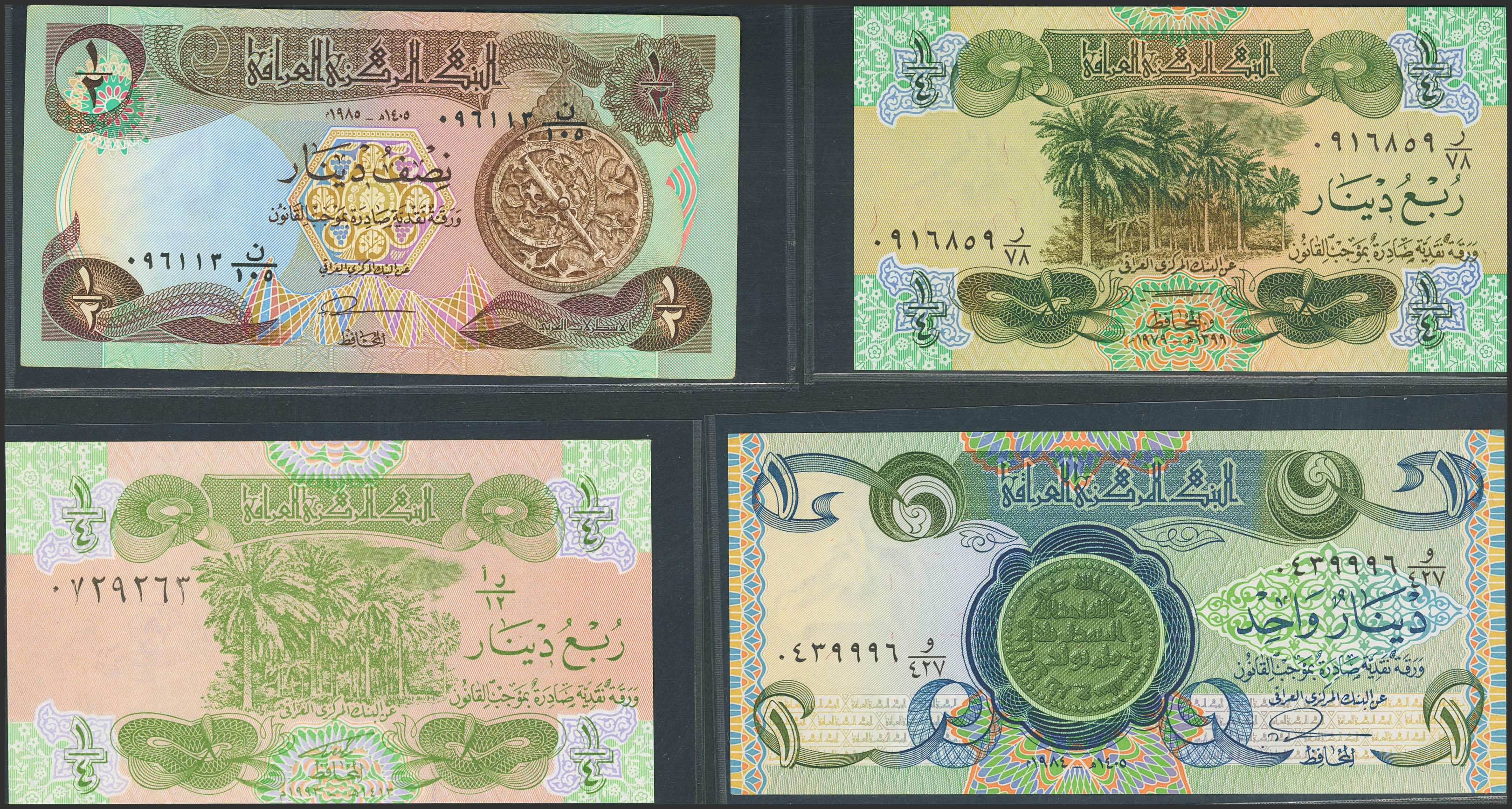IRAQ. Lot of 4 notes from ¼ at 1 Dinar. (1979ca). Central Bank. (Pick: 67a, 68a, 69a, 77). Uncirculated (3) and Less than Uncirculated (1).