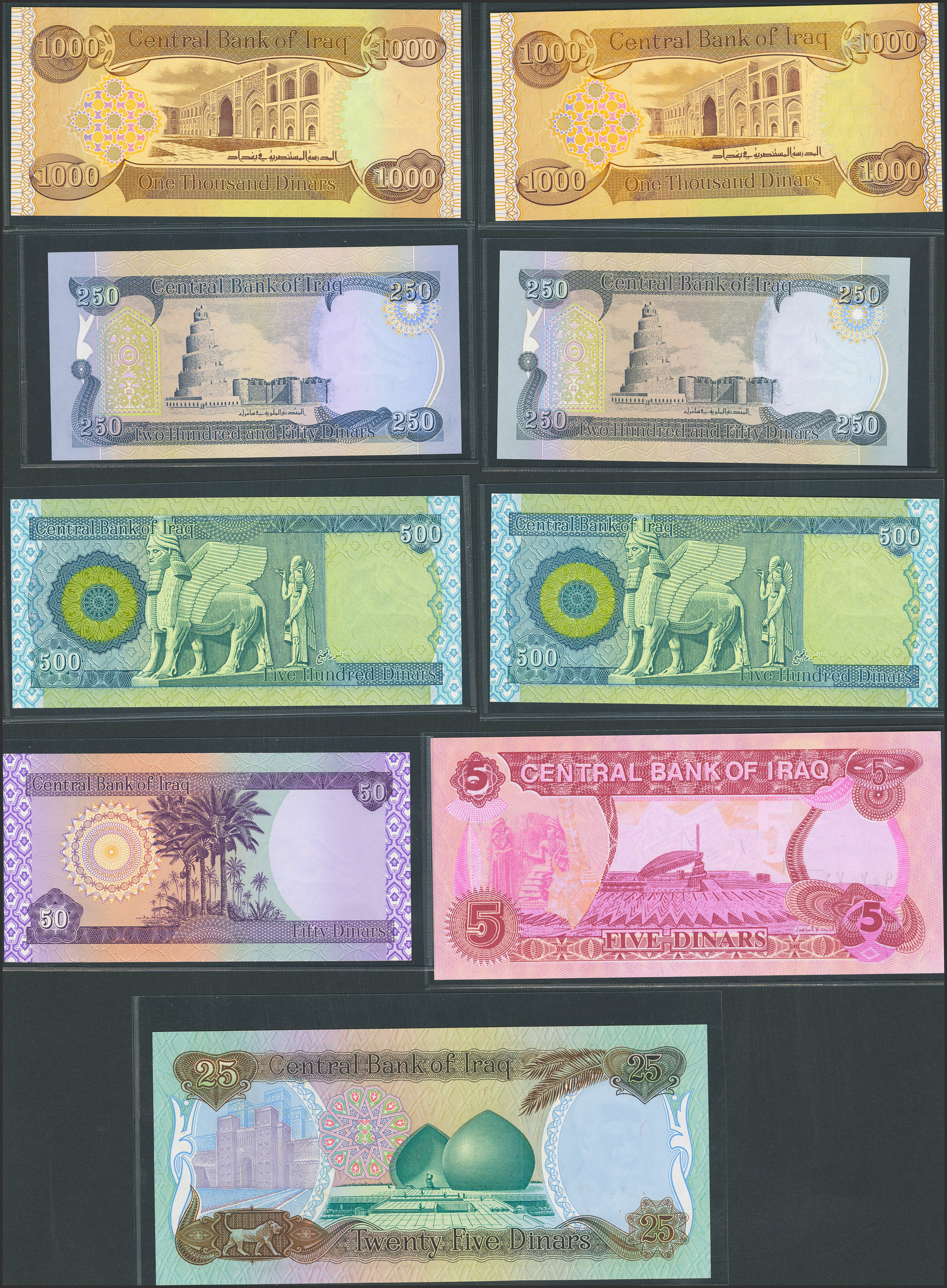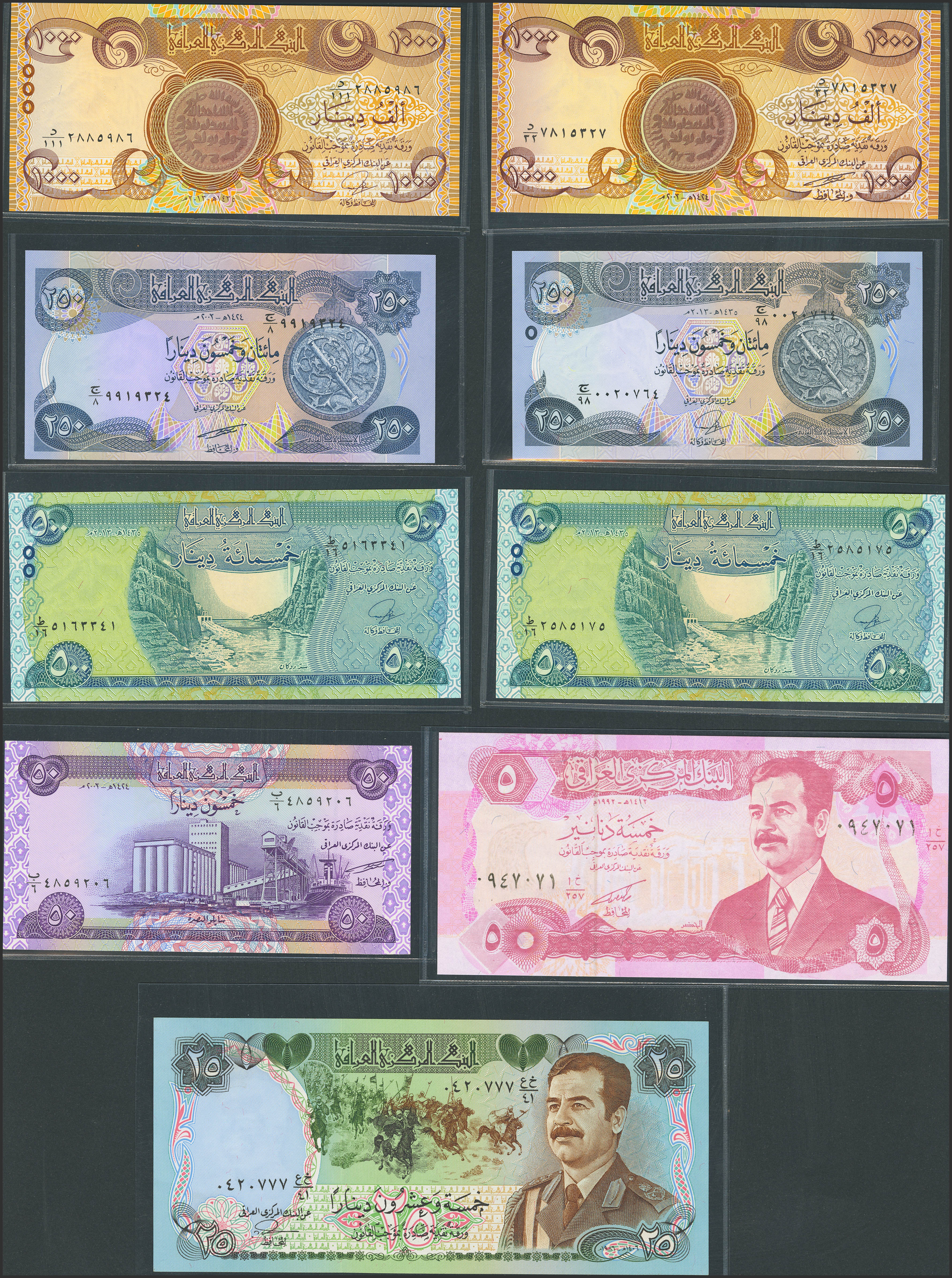 IRAQ. Lot of 9 notes from 50 to 1000 Dinars. (1986ca). Central Bank. (Pick: 73, 80b, 90, 93a, 93c, 91a, 97, 98(2)). Less than Uncirculated (2) and Uncirculated (7).