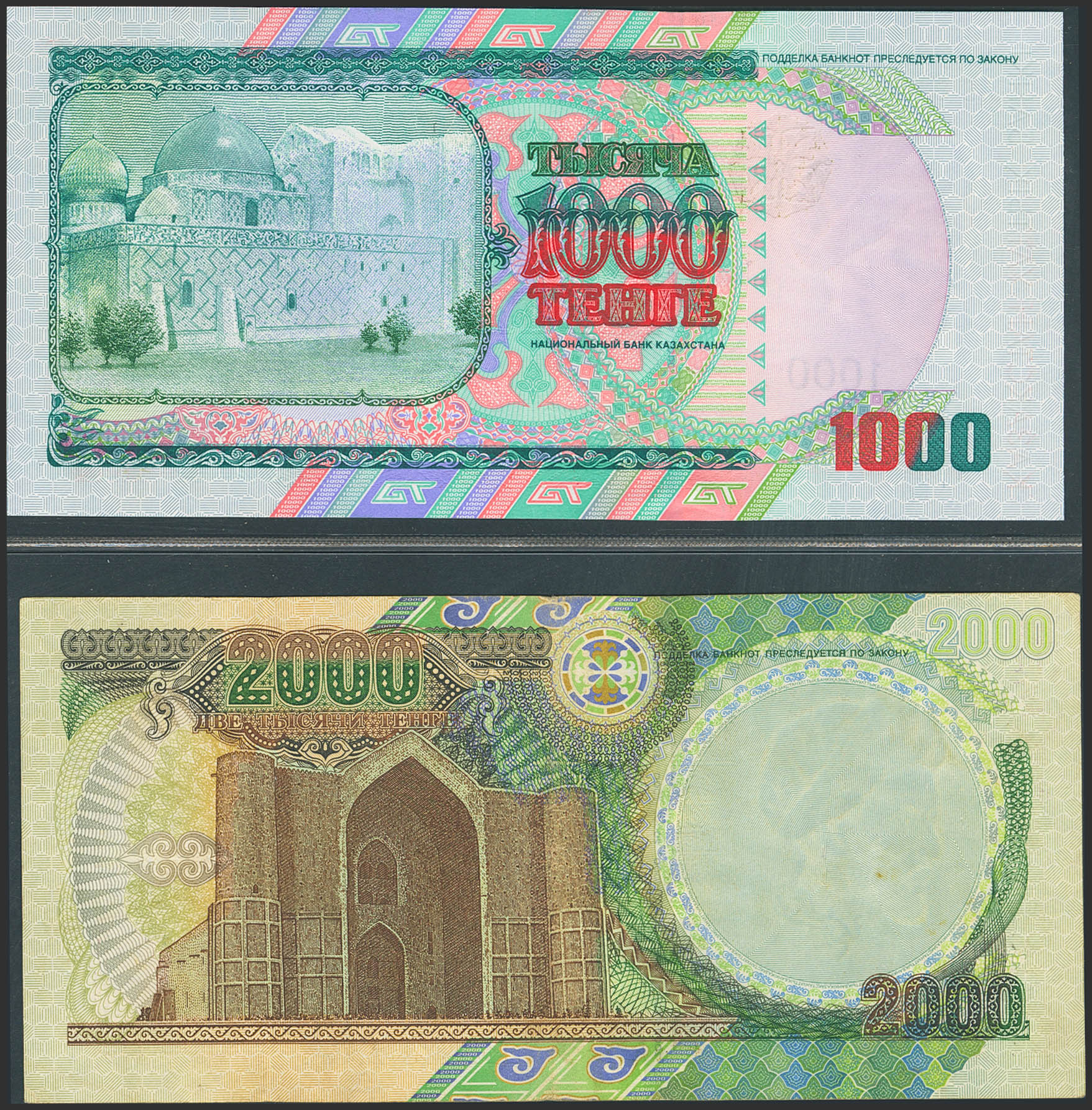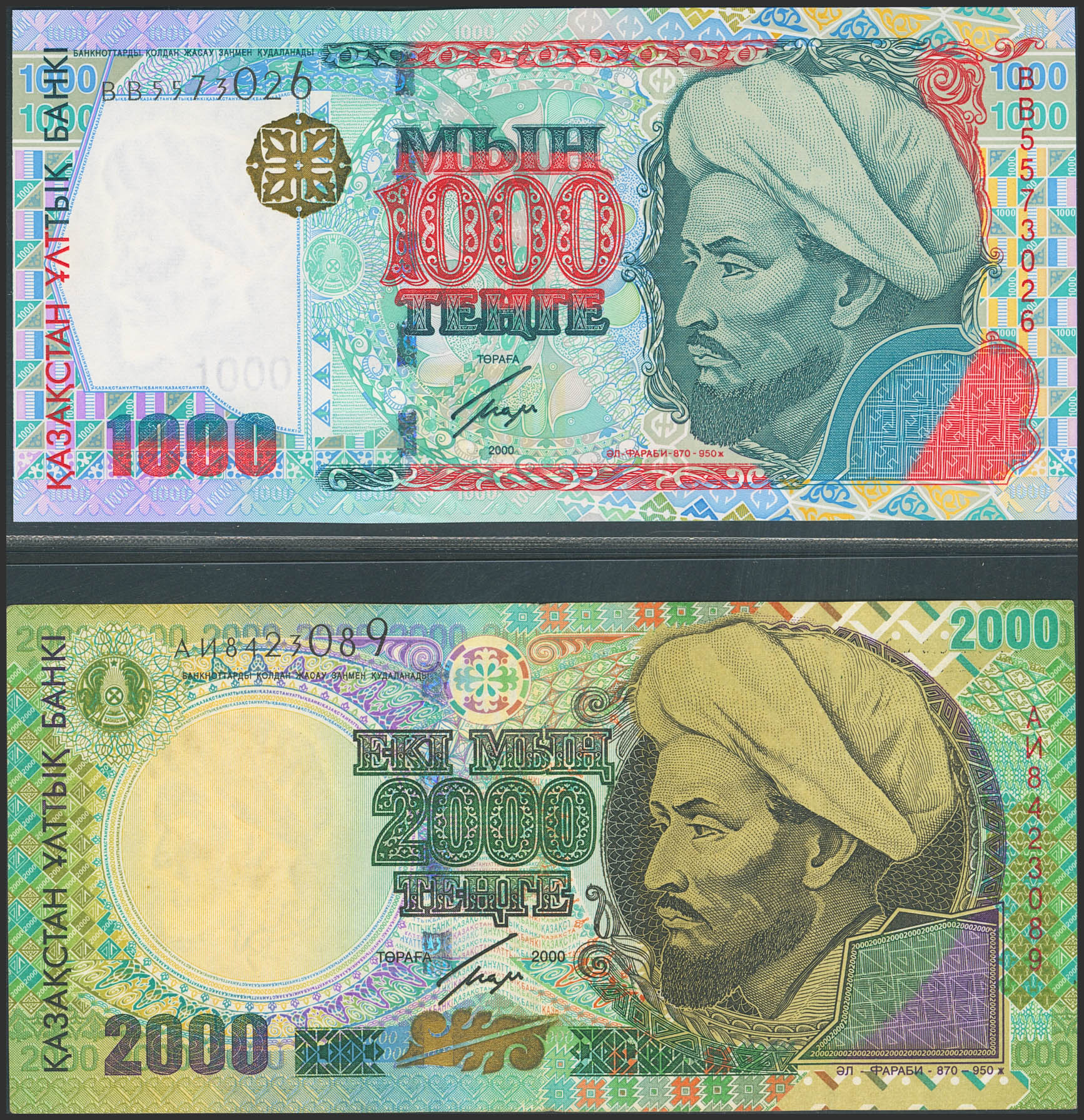 KAZAKHSTAN. Lot of 2 notes of 1000 and 2000 Tenge. 2000. National Bank. (Pick: 22, 23). Uncirculated (22) and More than Extremely Fine (23).
