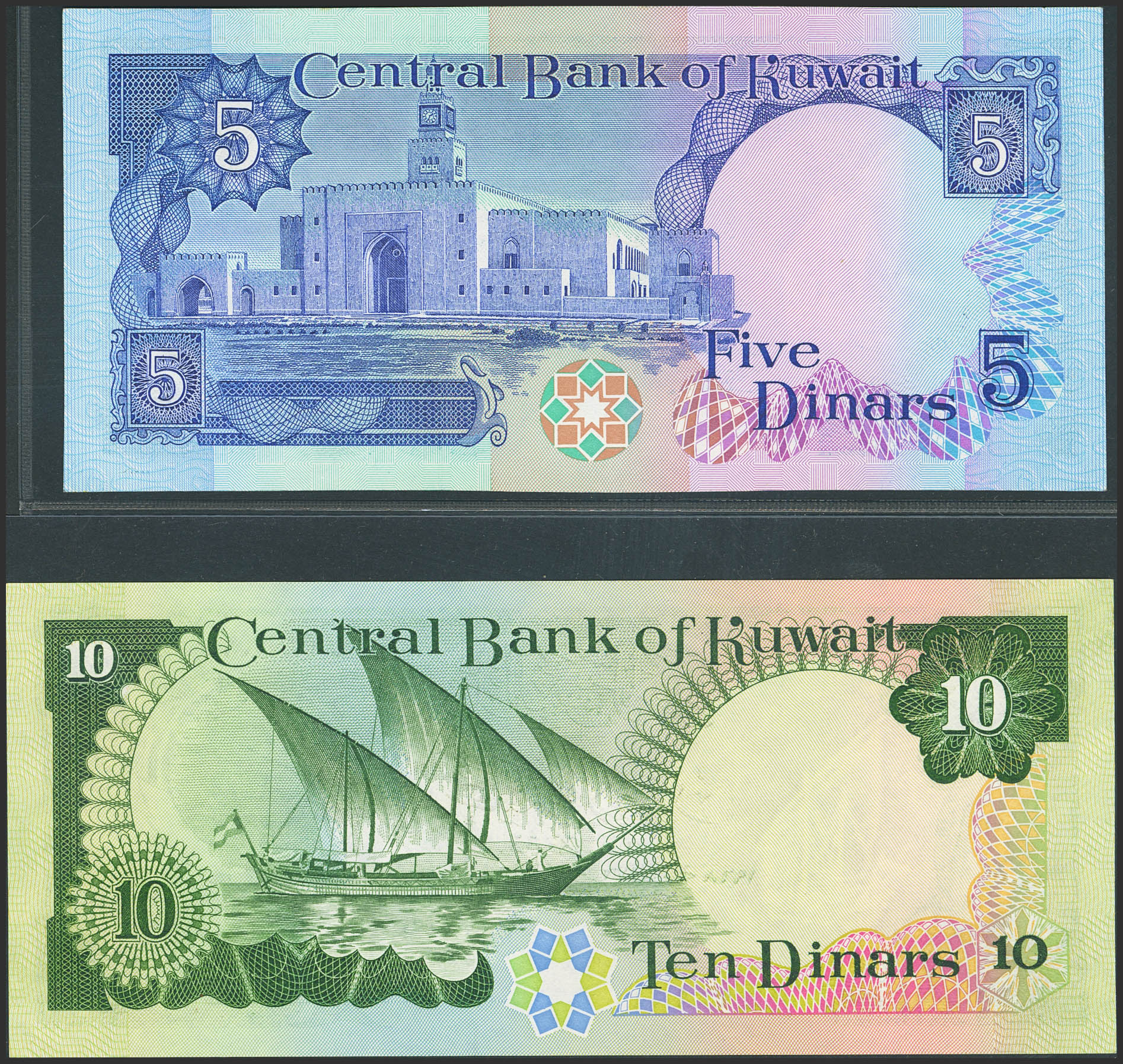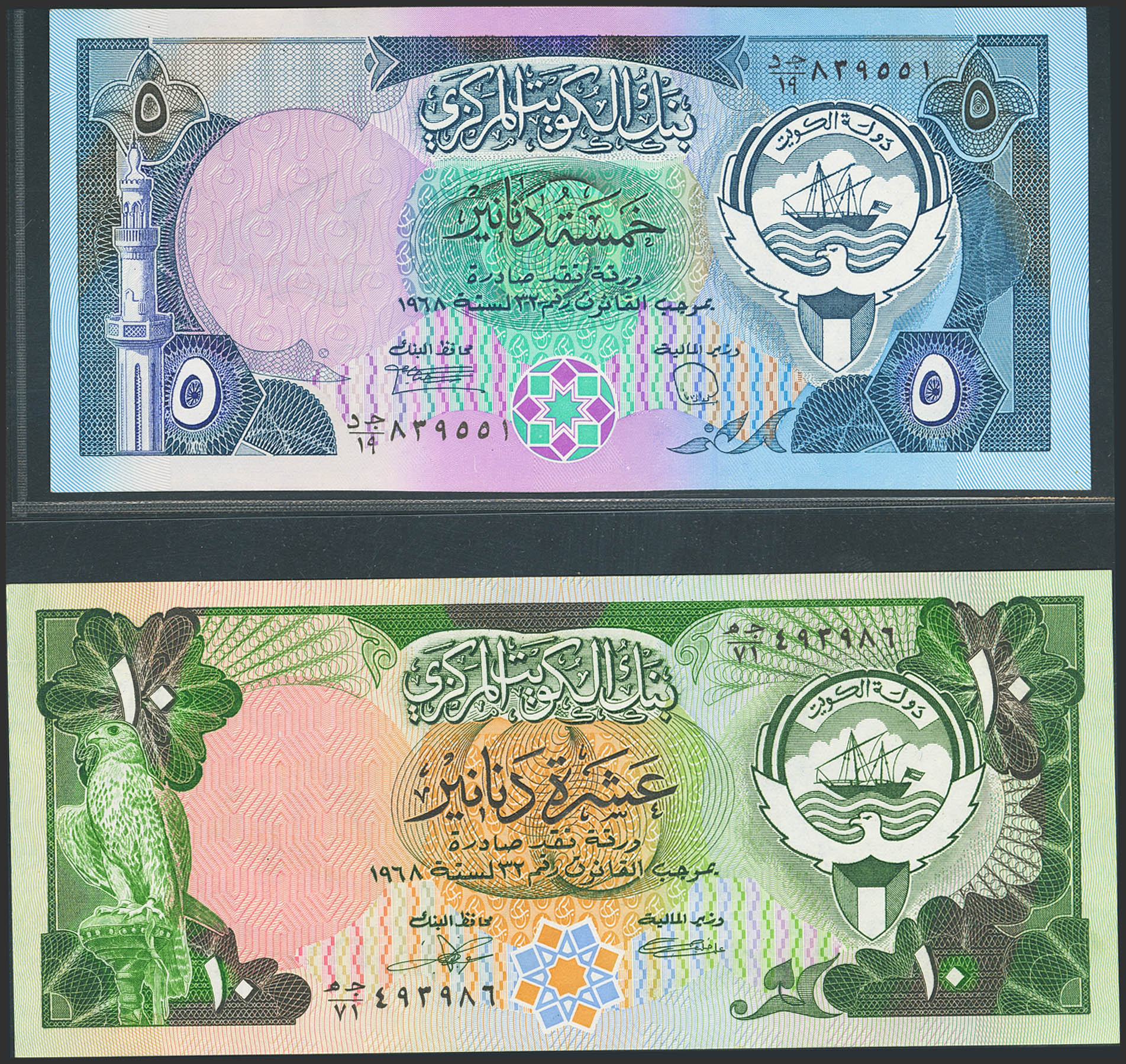 English KUWAIT. Lot of 2 notes of 1 and 5 Dinar. 1968. Central Bank. (Pick: 14d, 15d). Uncirculated.