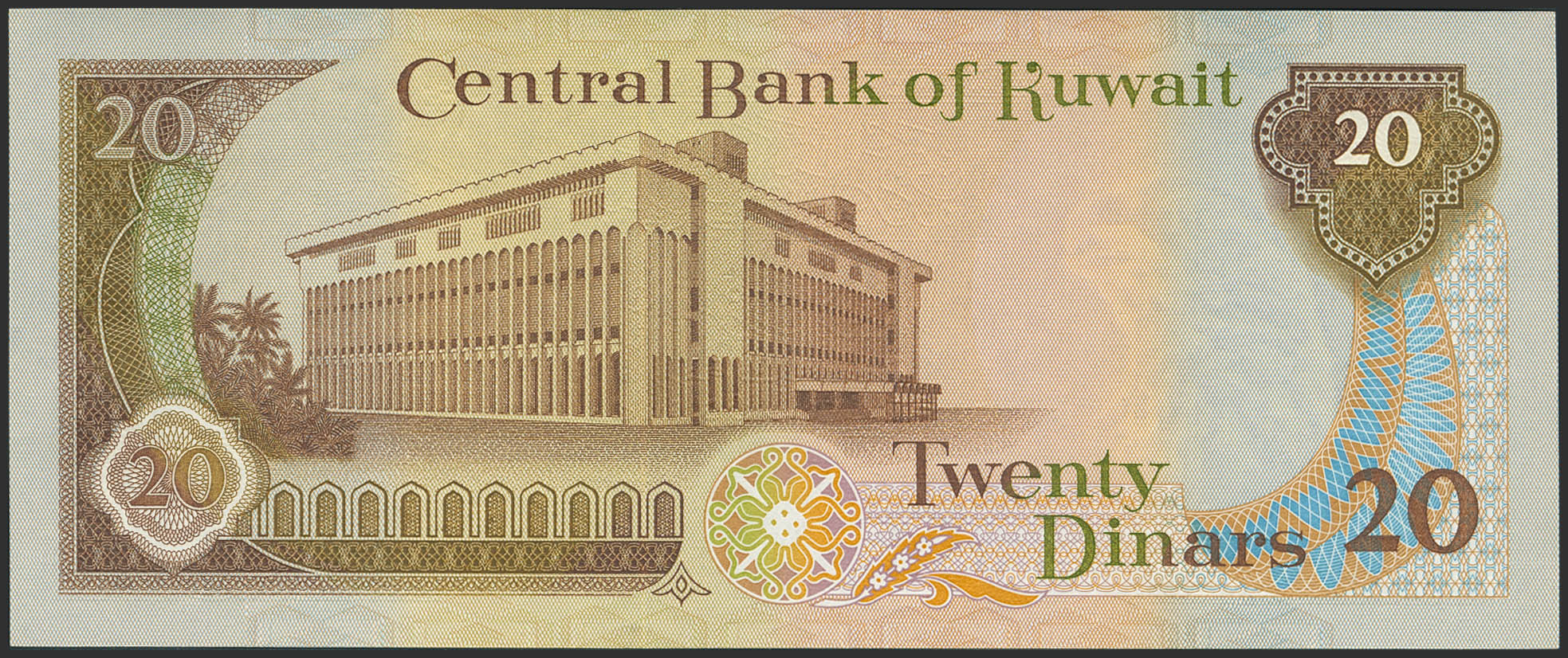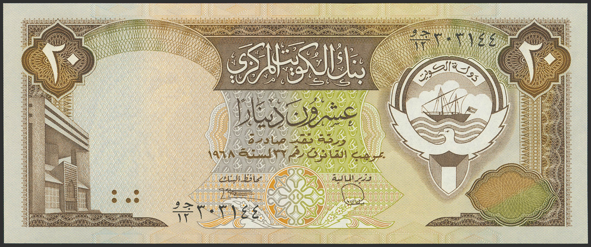 English KUWAIT. 20 Dinars. 1968. Central Bank. This prefix was stolen by the Iraqi forces during the invasion in 1990. (Pick: 16b). Uncirculated.
