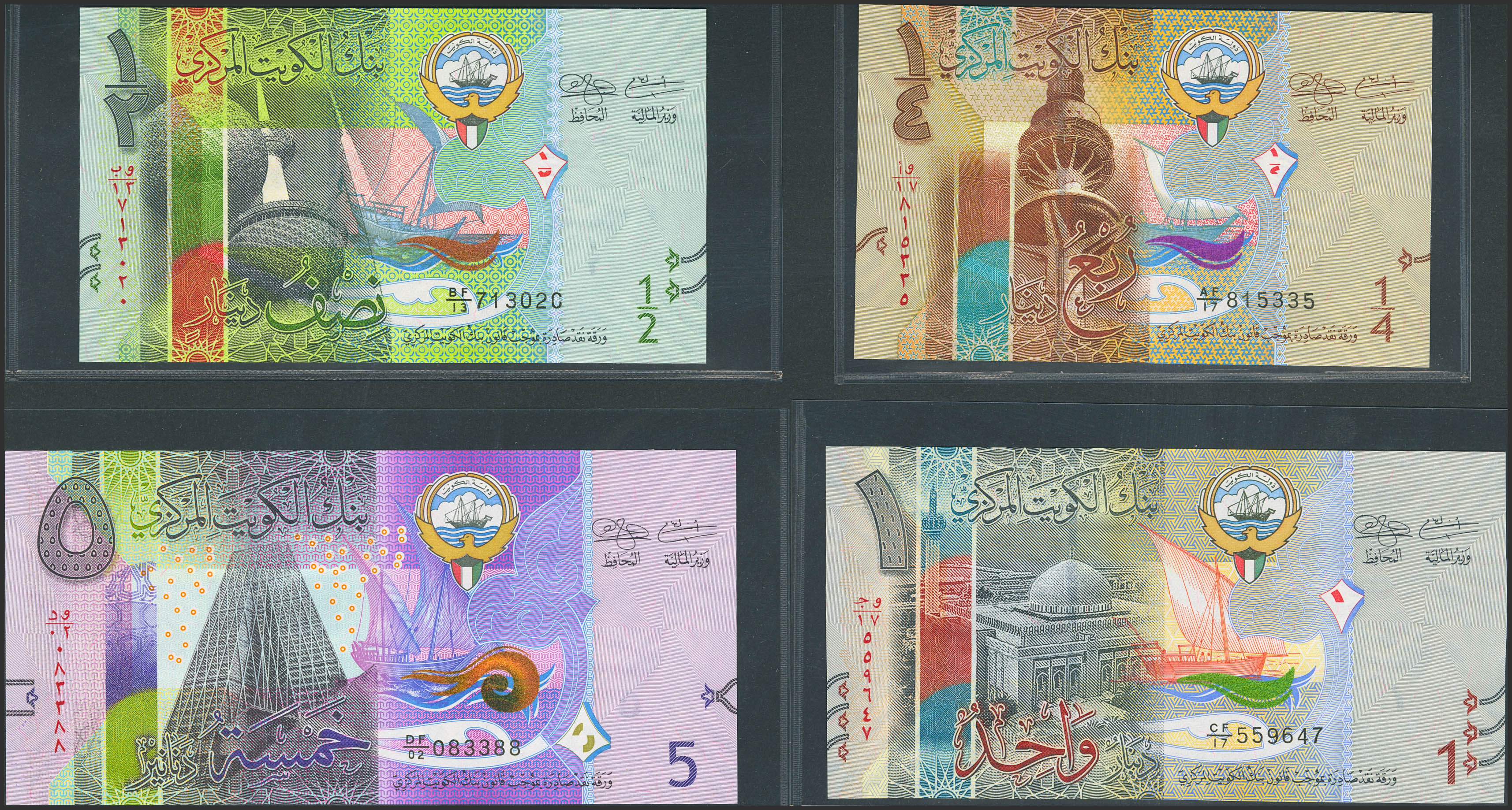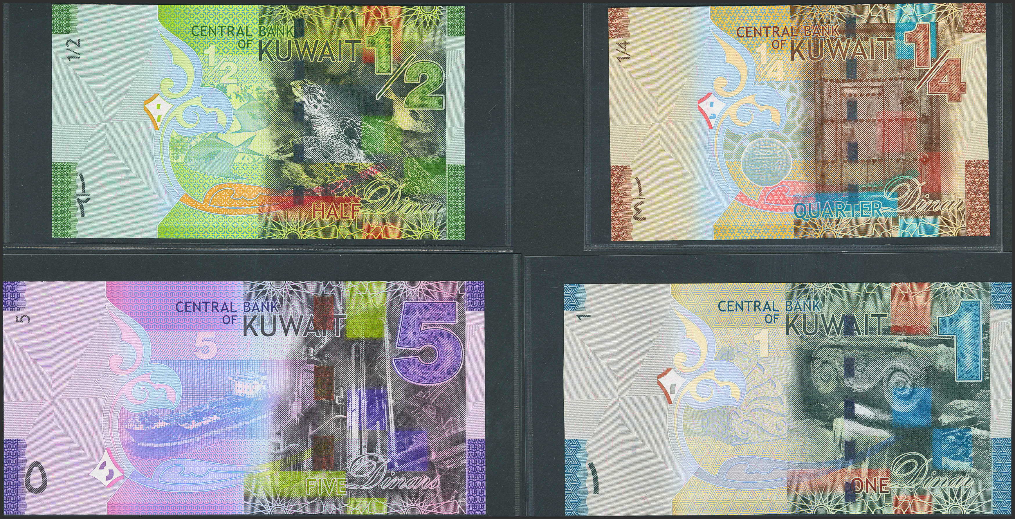 English KUWAIT. Lot of 4 notes from ¼ at 5 Dinars. (2014ca). Central Bank. (Pick: 29a, 30a, 31a, 32a). Uncirculated.