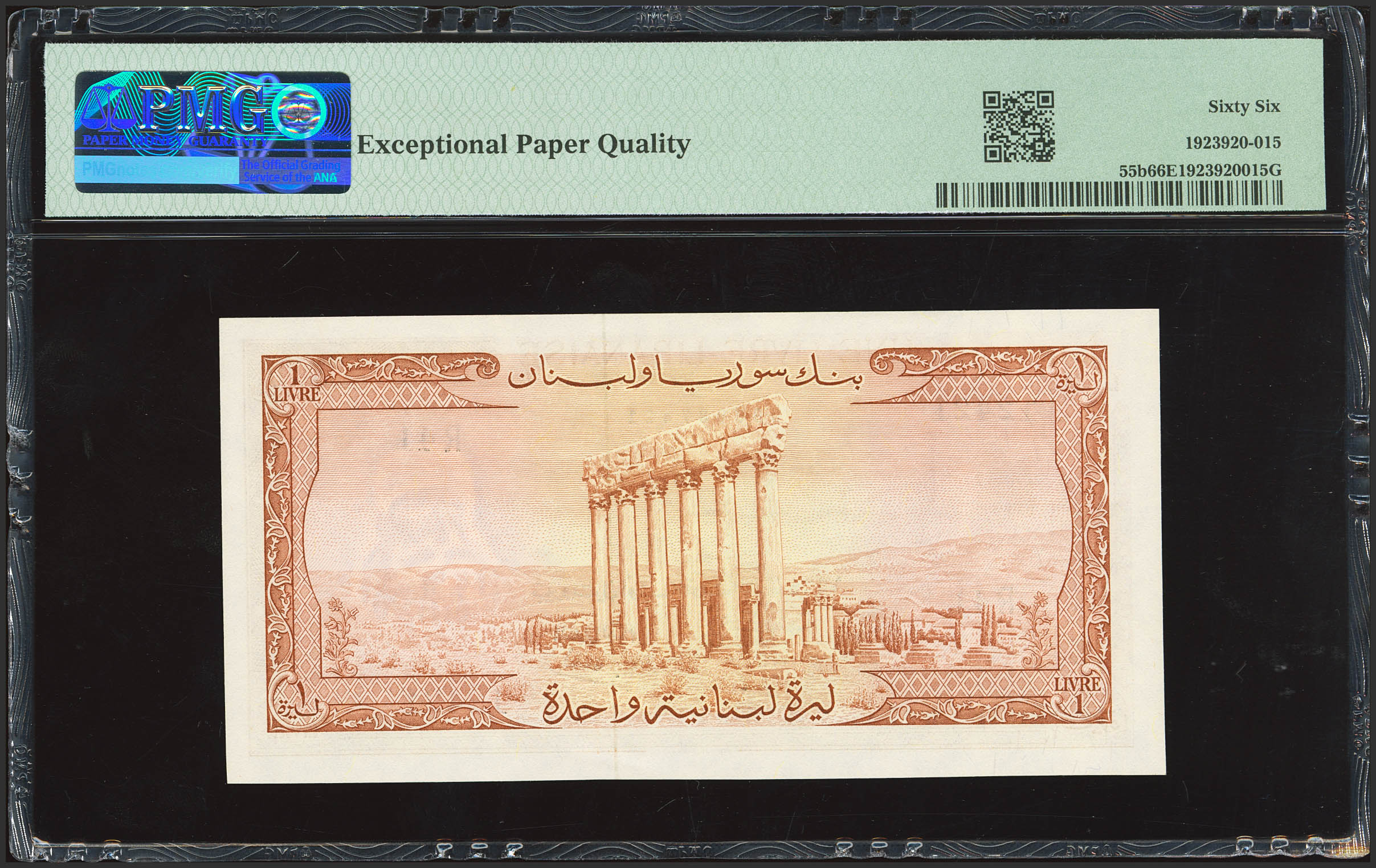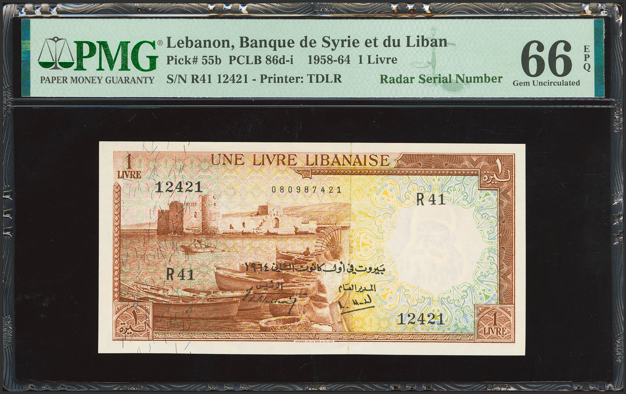 LEBANON. 1 Livre Libanaise. 1964. Banque de Syrie et du Liban. (Pick: 55b). PMG66EPQ (radar serial number).