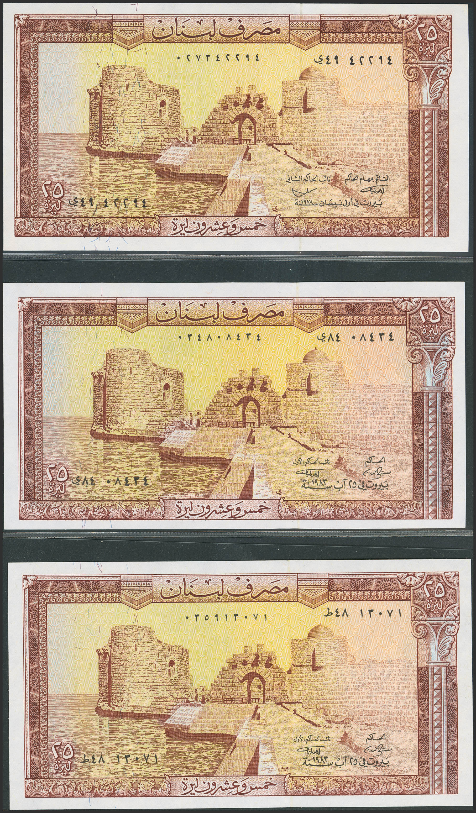 English LEBANON. 25 Livres. 1978 and 1983. Banque Du Liban. (Pick: 64b, 64c(2)). Less than Uncirculated and Uncirculated (2).