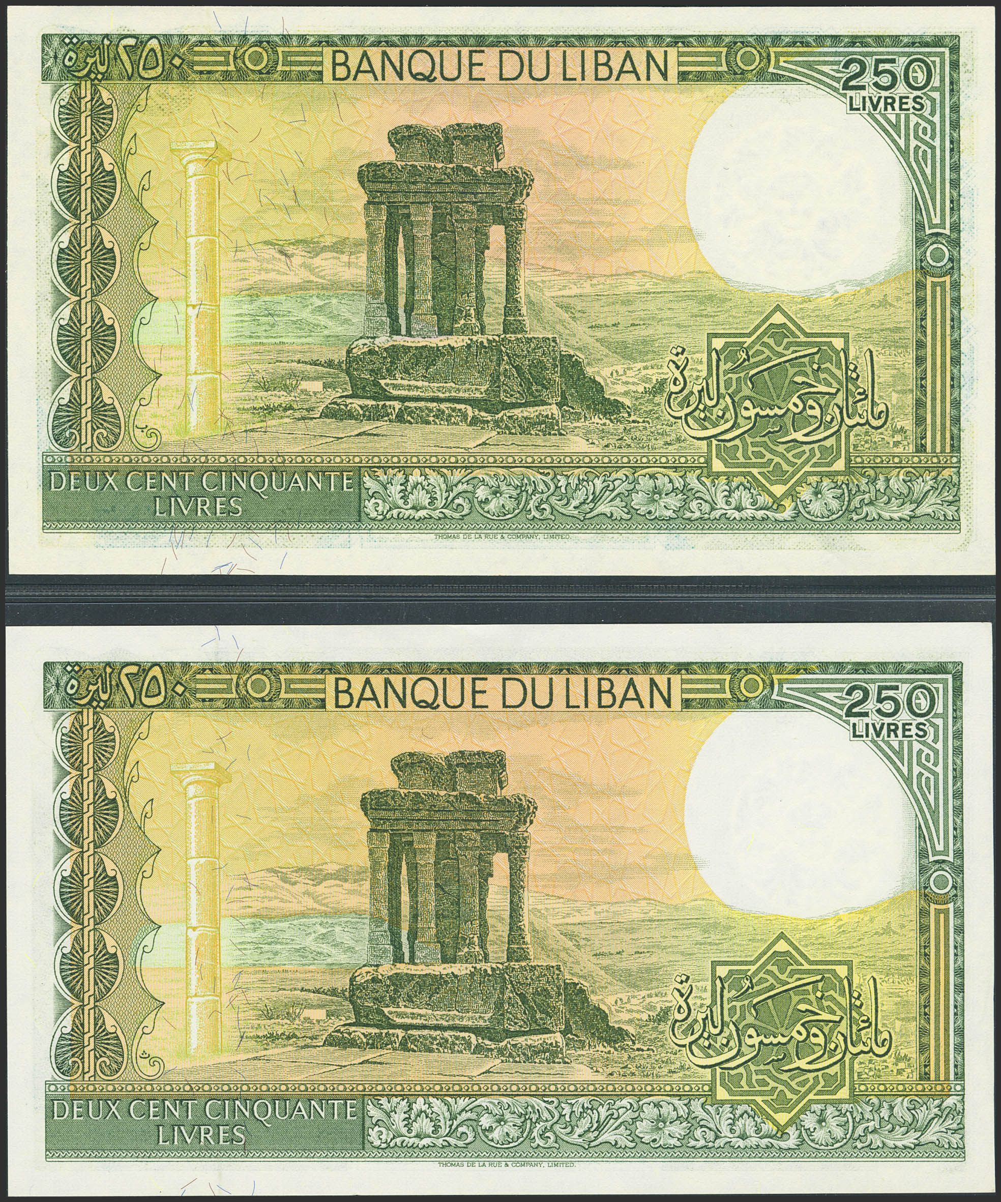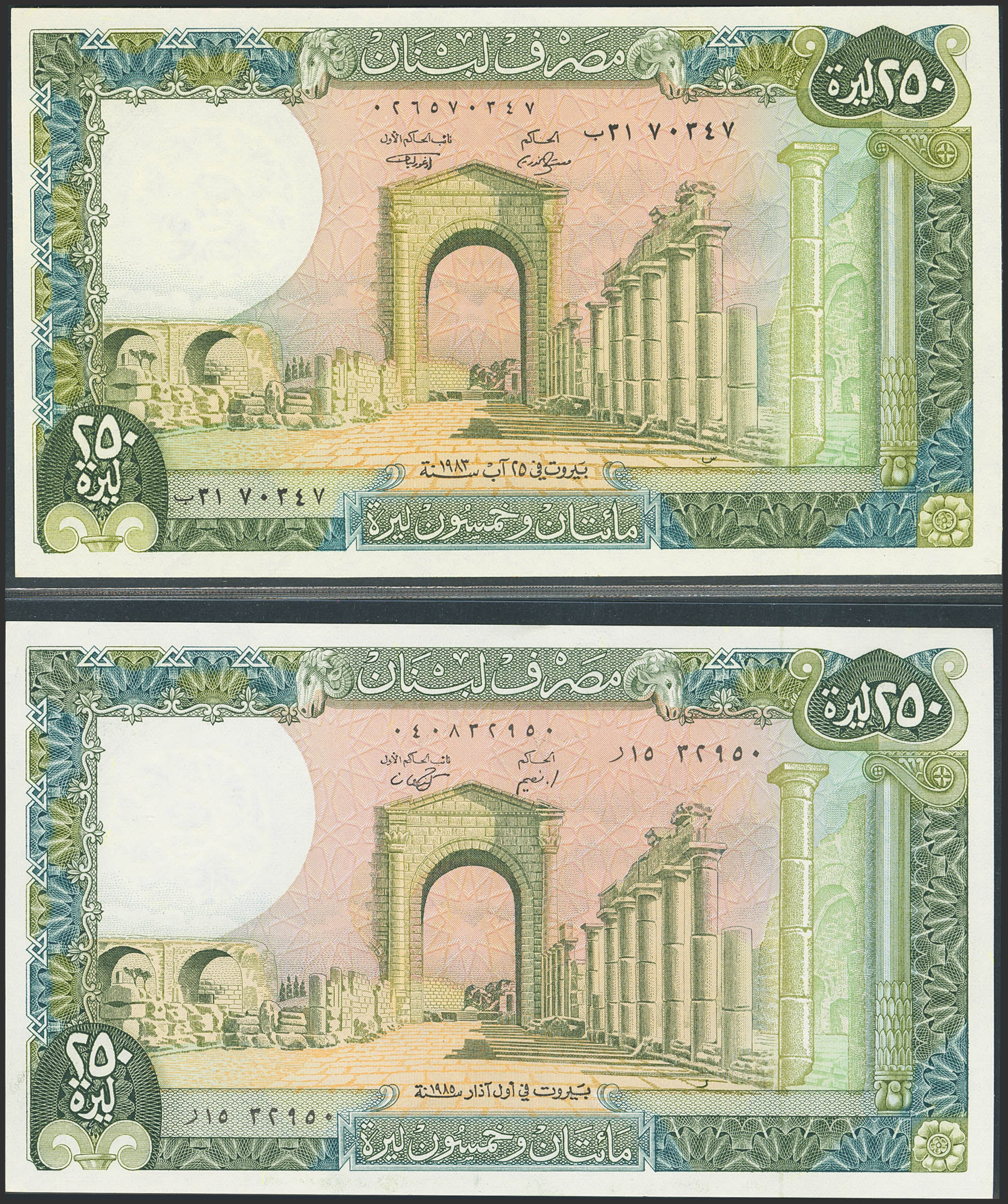 LEBANON. Lot of 2 notes of 250 Livres. 1983 and 1985. Banque Du Liban. (Pick: 67b, 67c). Uncirculated.
