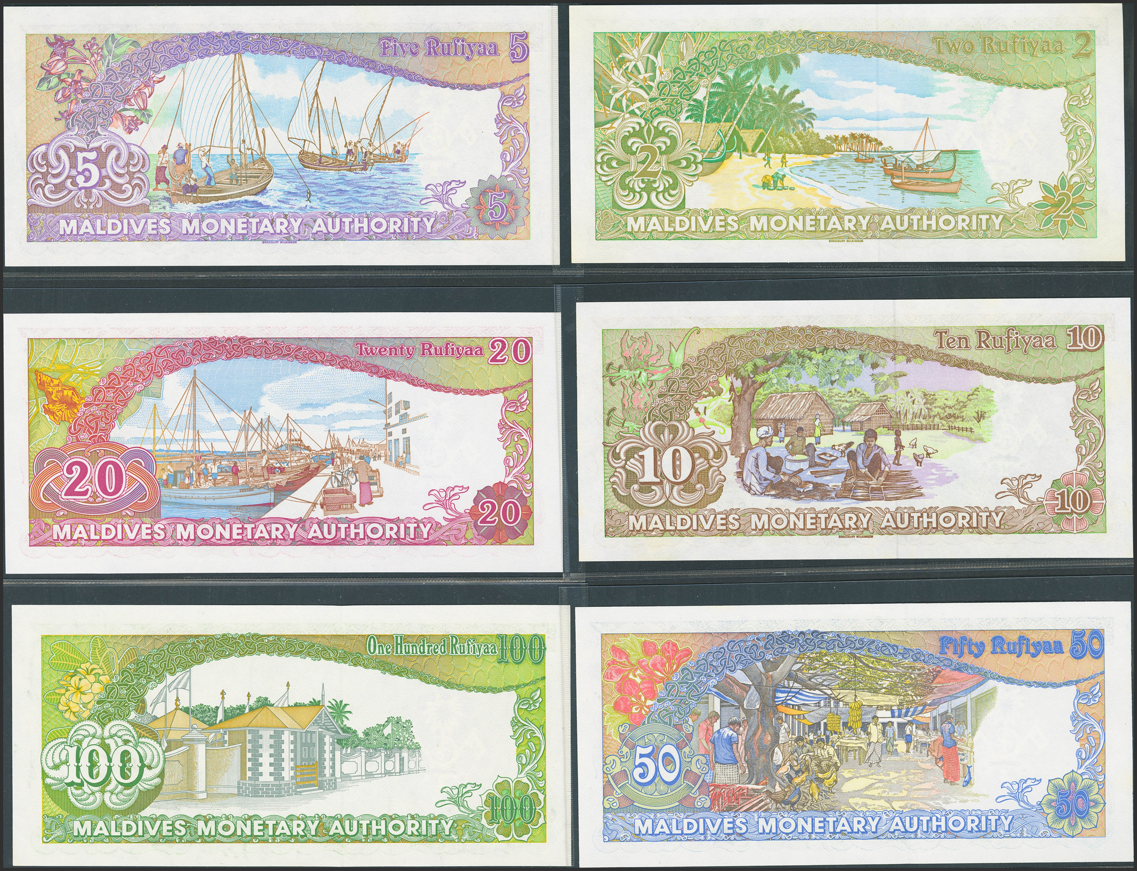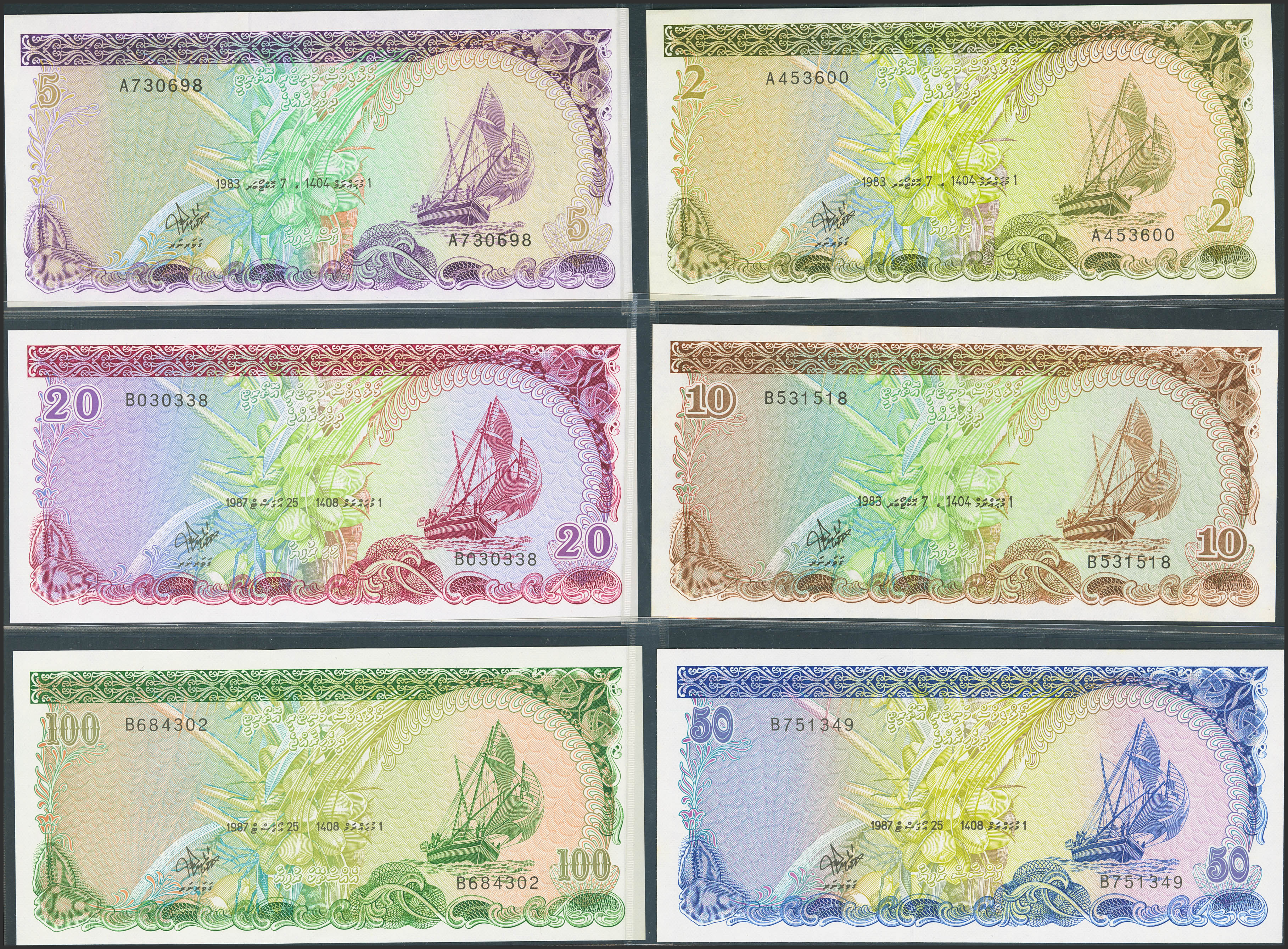 MALDIVES. Lot of 6 notes of Rufiyaa. 1983, 1987. Maldives Monetary Authority. (Pick: 9a, 10a, 11a, 12b, 13b, 14b). Uncirculated.