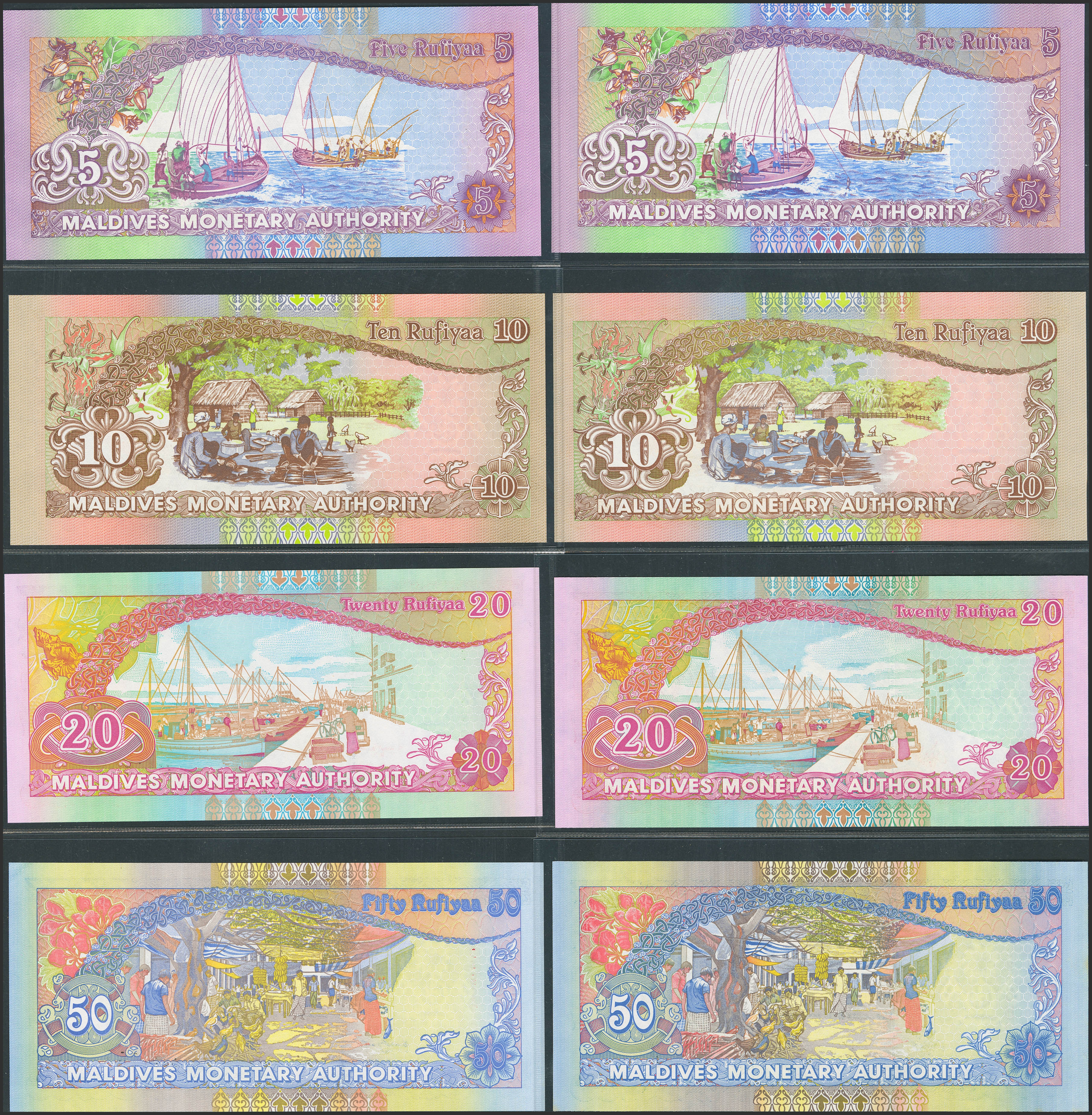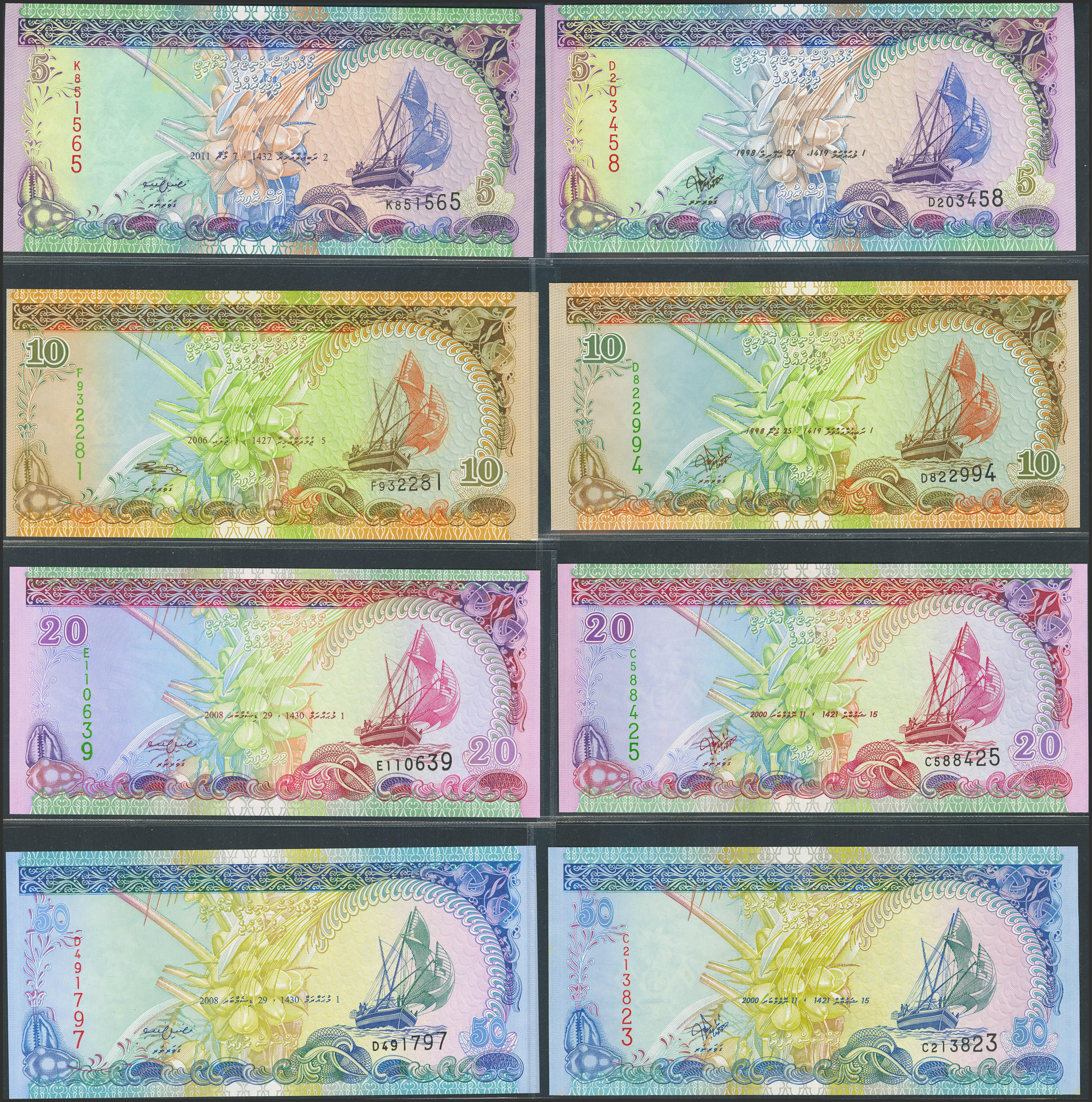 English MALDIVES. Lot of 8 notes of Rufiyaa. 1998-2011. Maldives Monetary Authority. (Pick: 18a, 18e, 19a, 19c, 20a, 20c, 21a, 21b). Uncirculated.