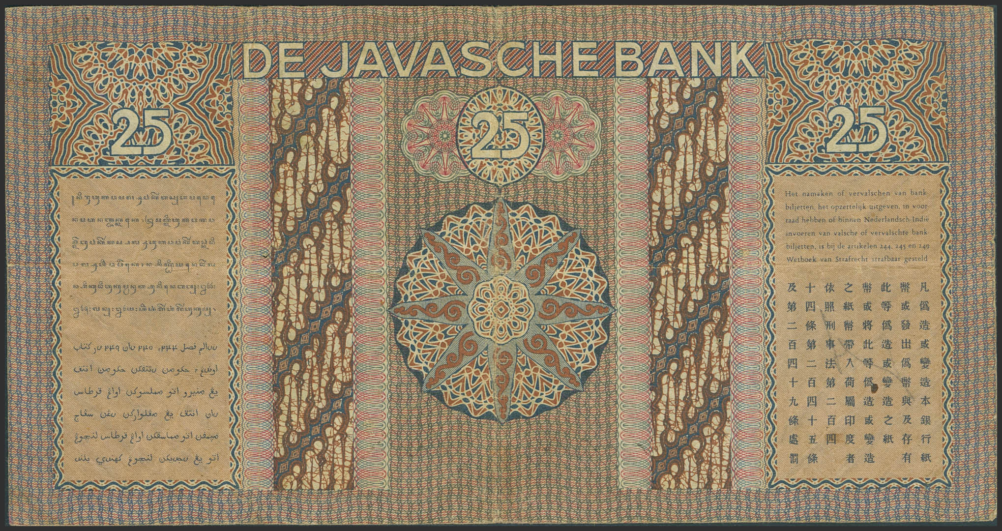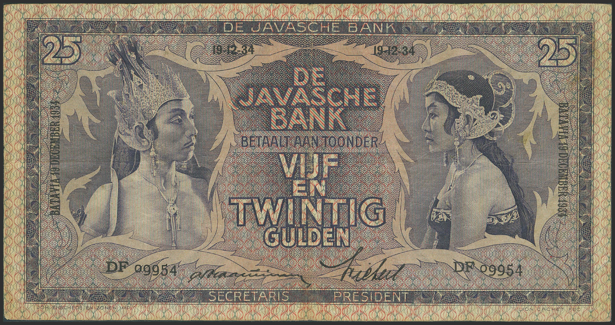 NETHERLANDS INDIES. 25 Gulden. December 19, 1934. Javasche Bank. (Pick: 80a). Very Fine, pinholes.