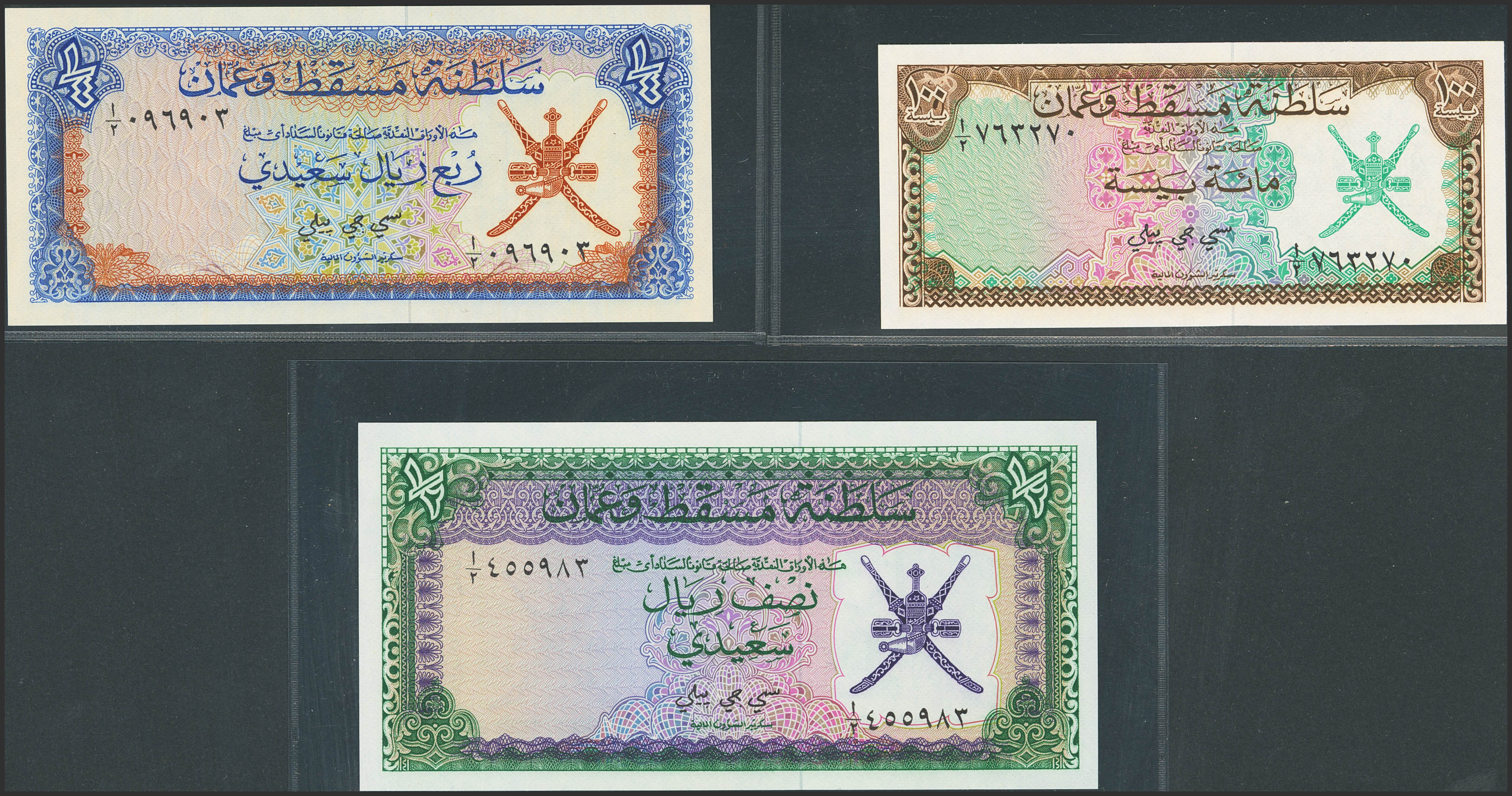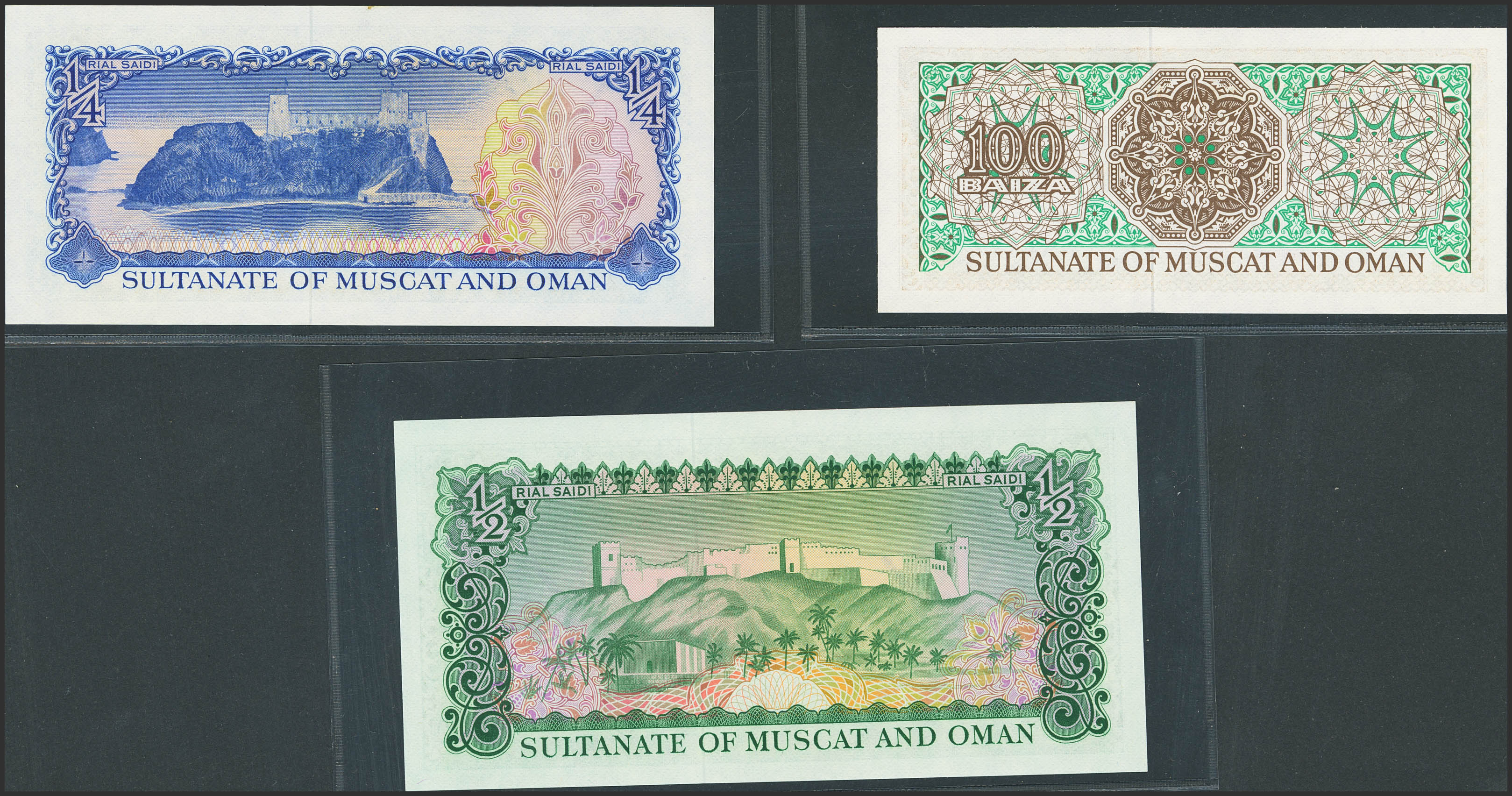 OMAN. Lot of 3 notes from 100 Baiza at 0´5 Rial Saidi. (1970ca). Sultanate of Muscat and Oman. (Pick: 1a, 2a, 3a). Uncirculated.