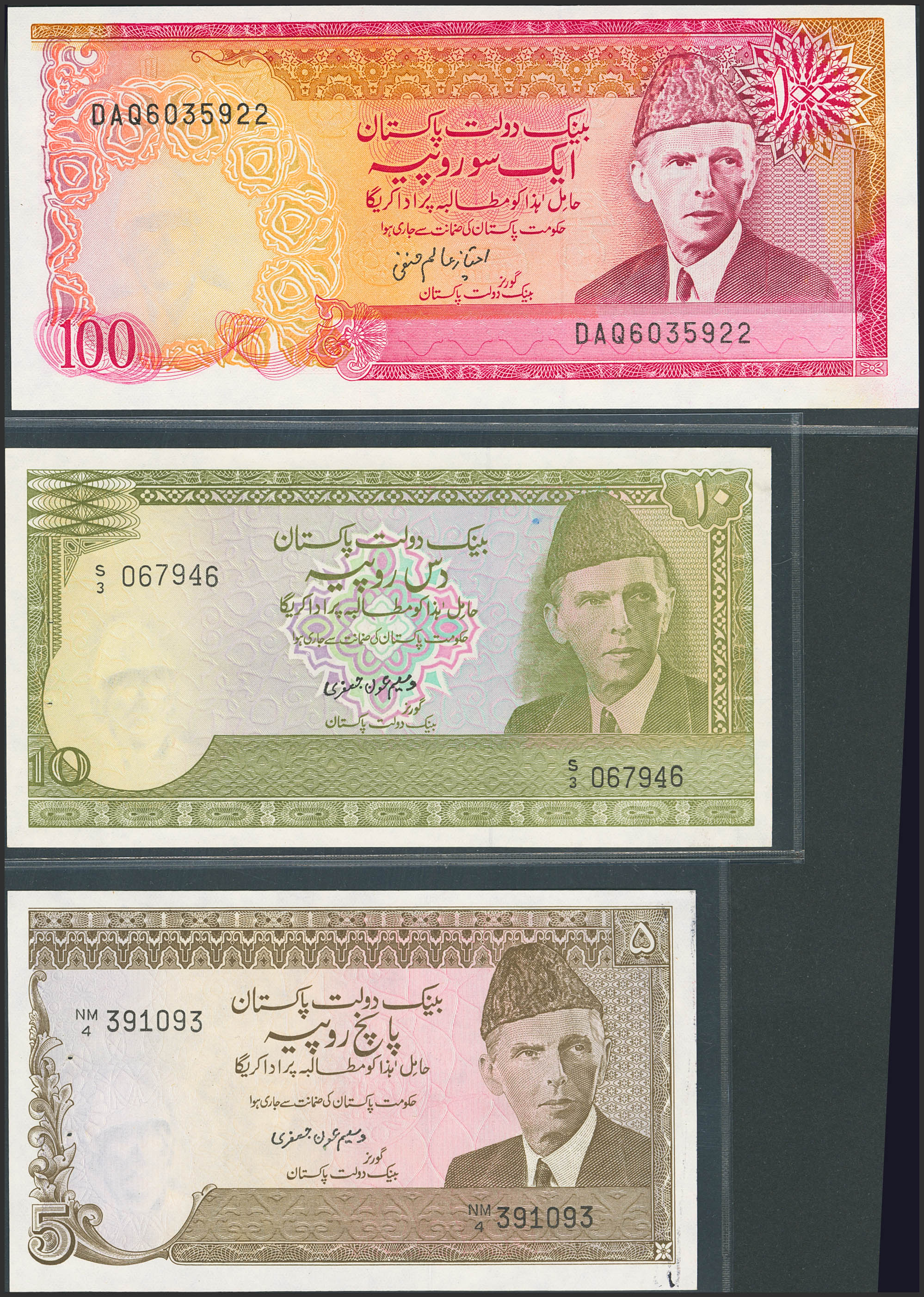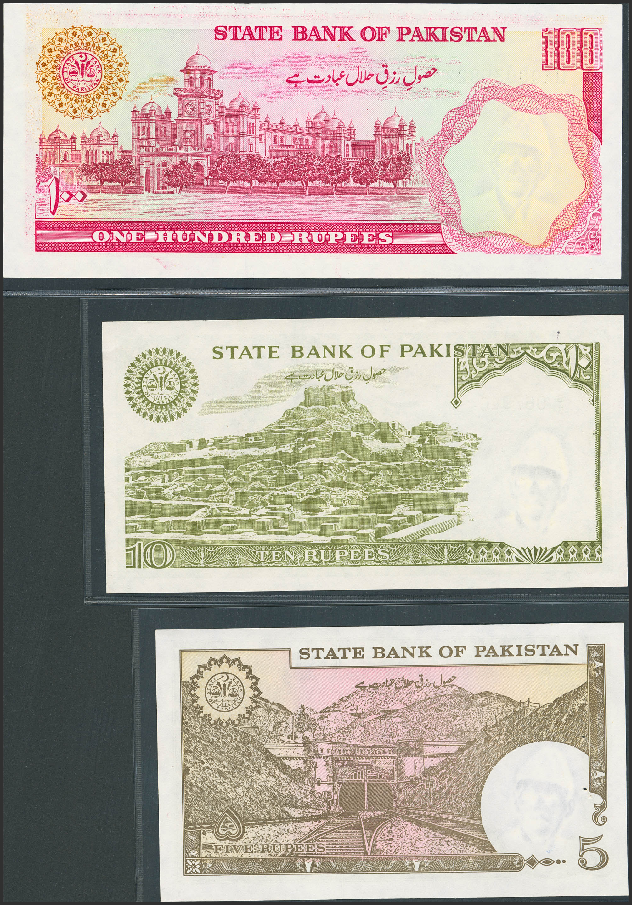 PAKISTAN. Lot of 3 notes of 5, 10 and 100 Rupees. State Bank. (Pick: 38, 39, 41). Less than Uncirculated (2) and Uncirculated (1), staple holes at issue.