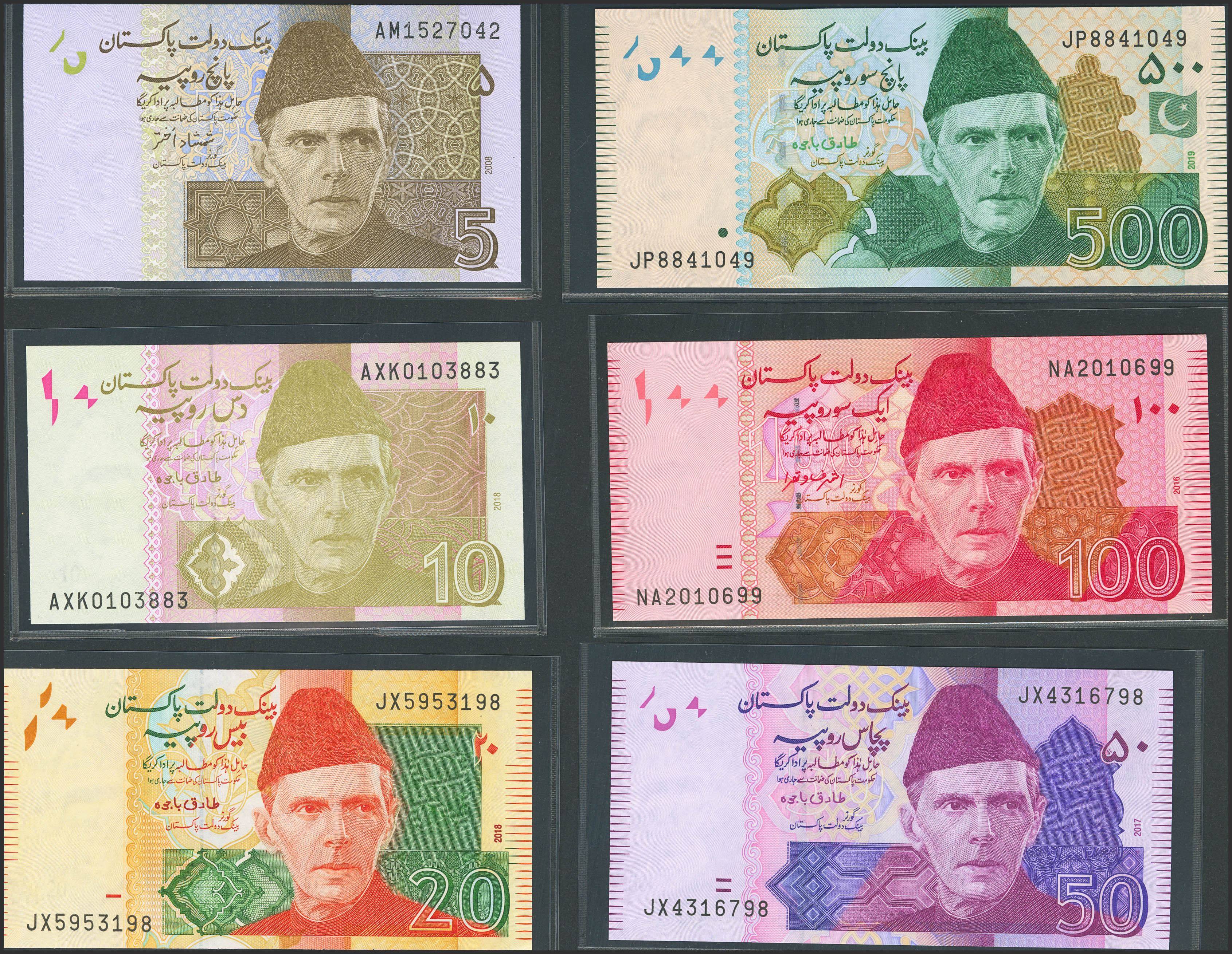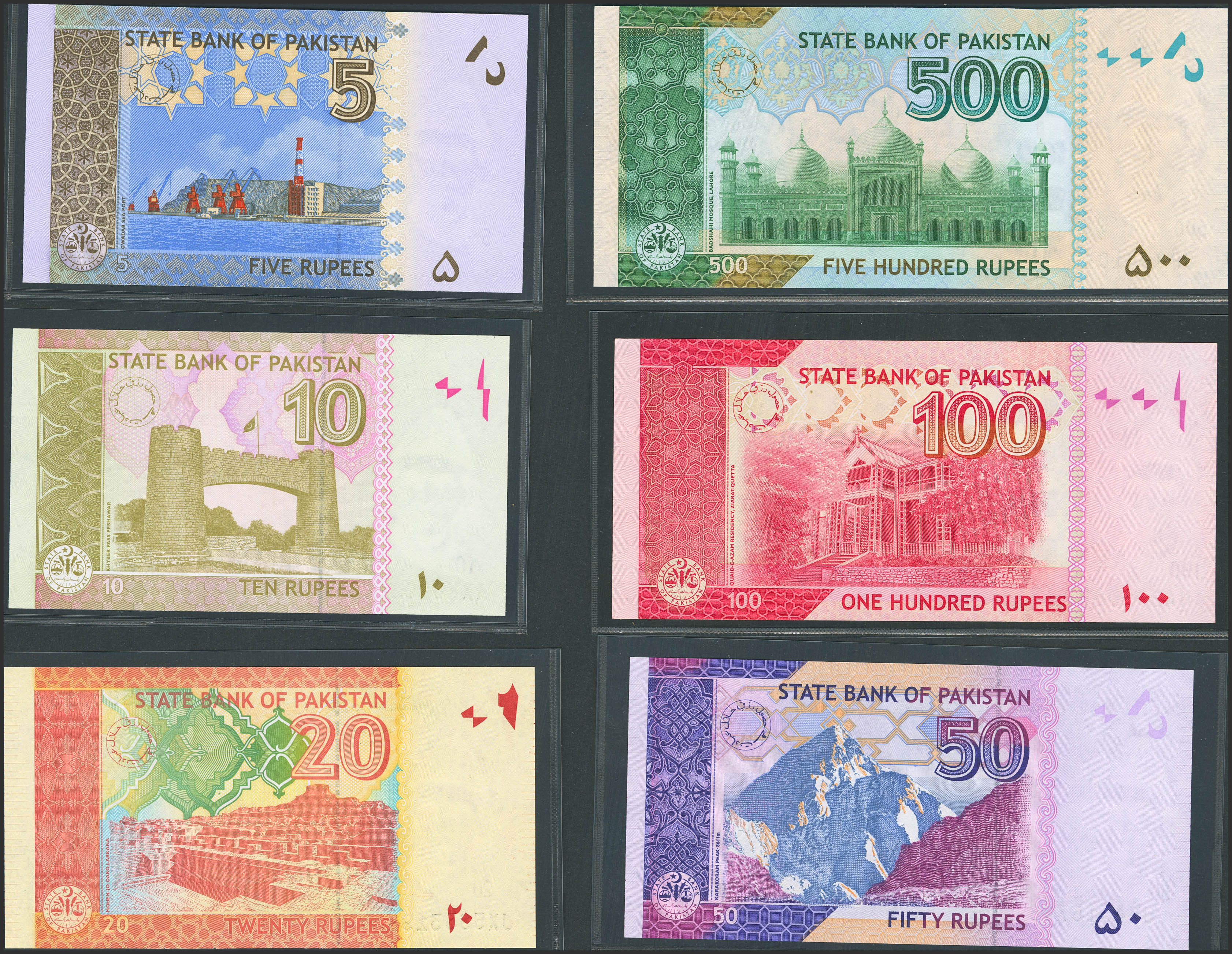 PAKISTAN. Lot of 6 notes from 5 at 500 Rupees. (2005ca). State Bank. (Pick: 53a, 45m, 55l, 47k, 48k, 49Ak). Uncirculated.