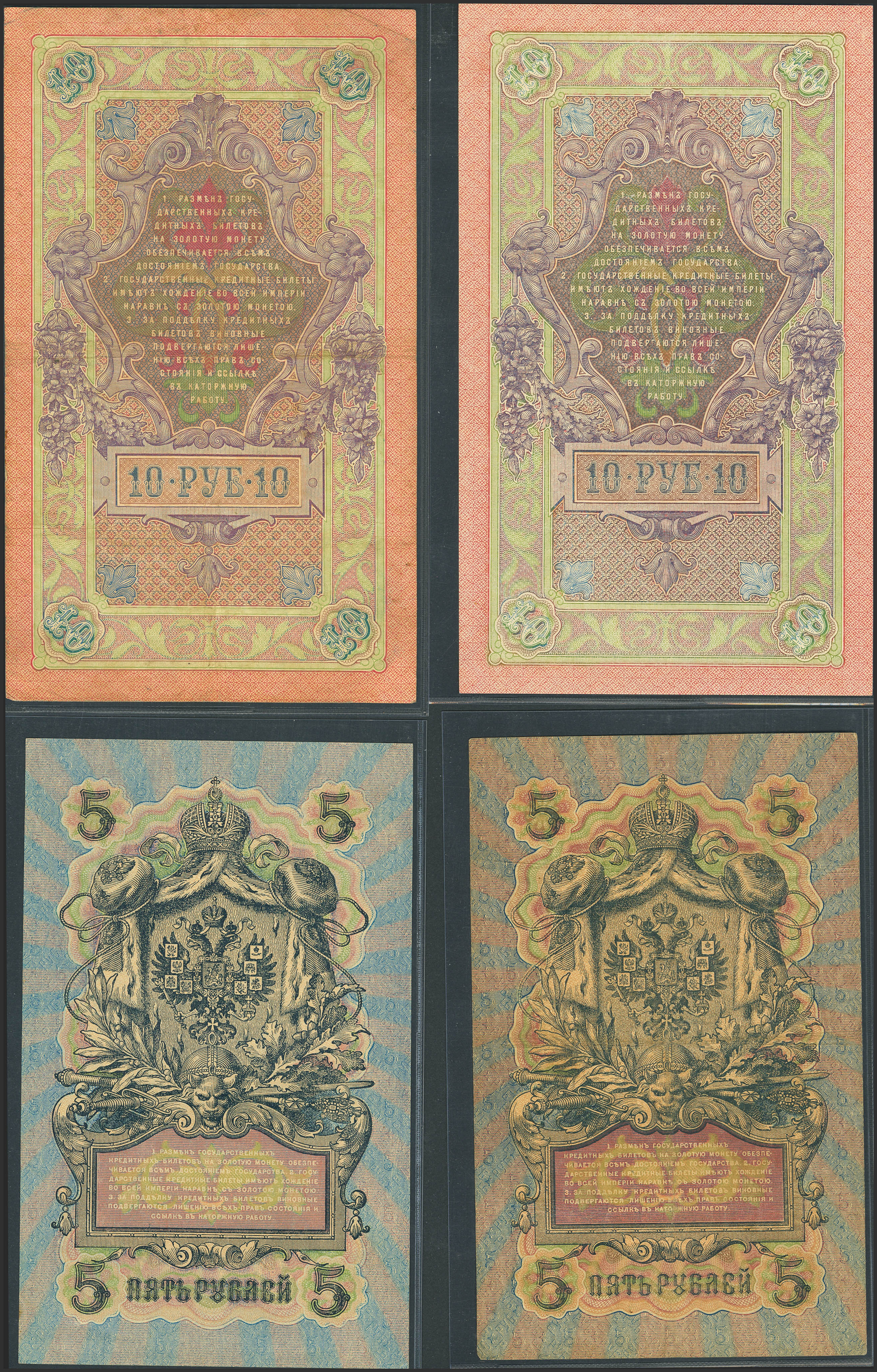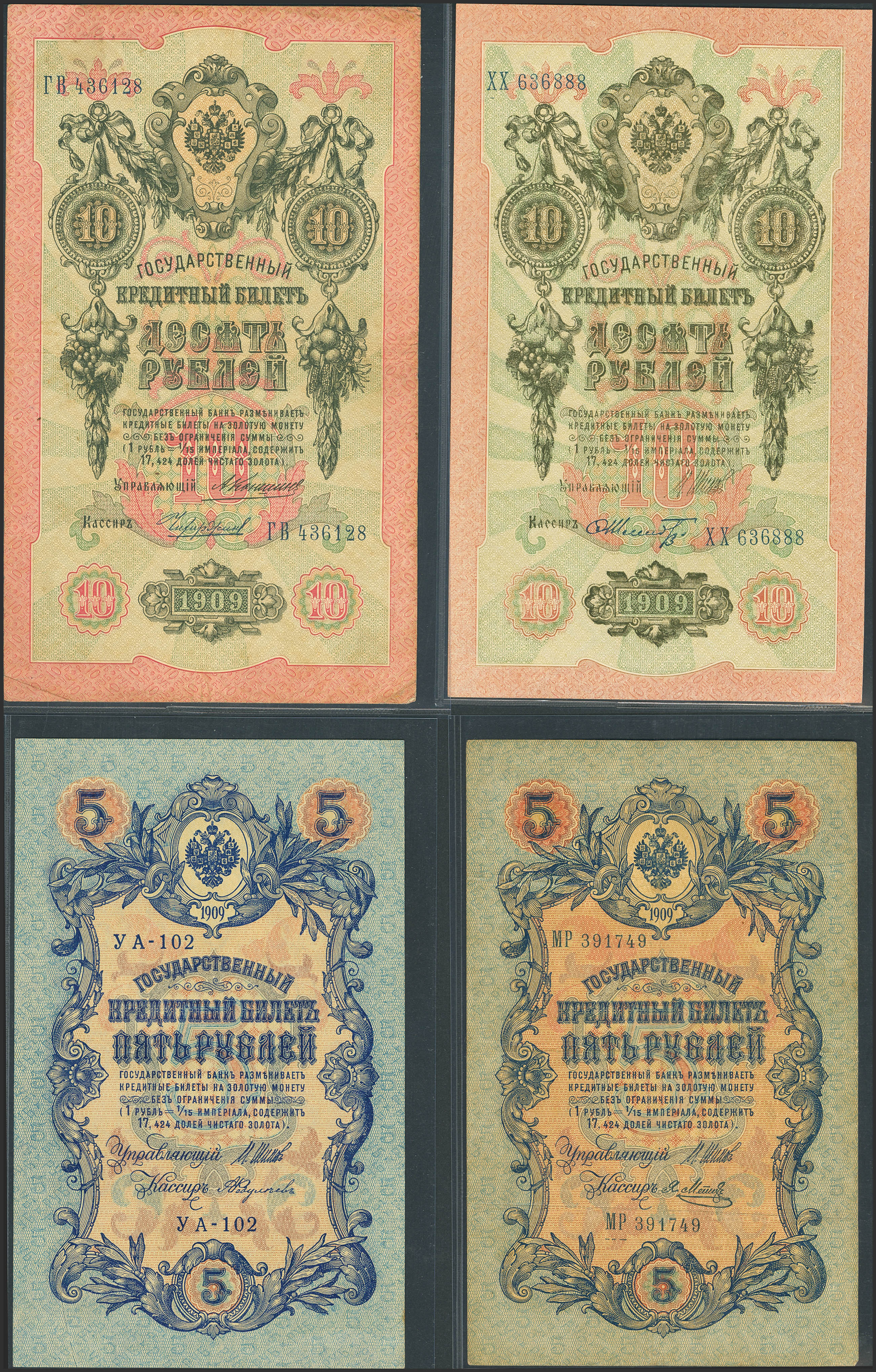 RUSSIA-EMPIRE. Lot of 4 notes of 5 and 10 Rubley. 1909. Gosudarstvenniy Bank. Different signatures. (Pick: 10b(2), 11b, 11c). Less than Uncirculated (2) and Very Fine (2).