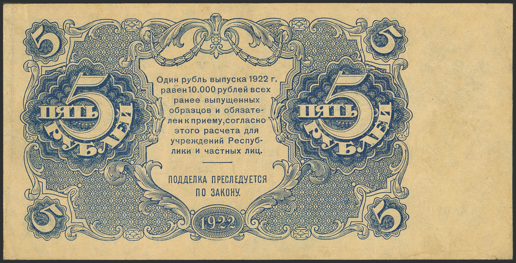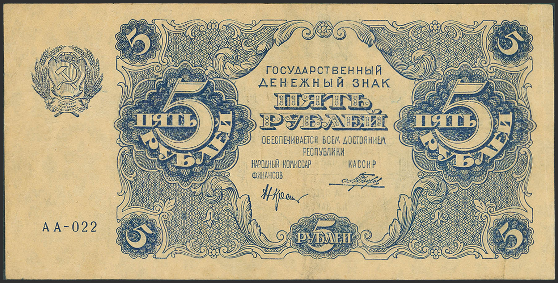 RUSSIA-RSFSR. 5 Rubley. 1922. Narodniy Komissariat Finantsov. Right Signature of Porokhov. (Pick: 129). Extremely Fine.