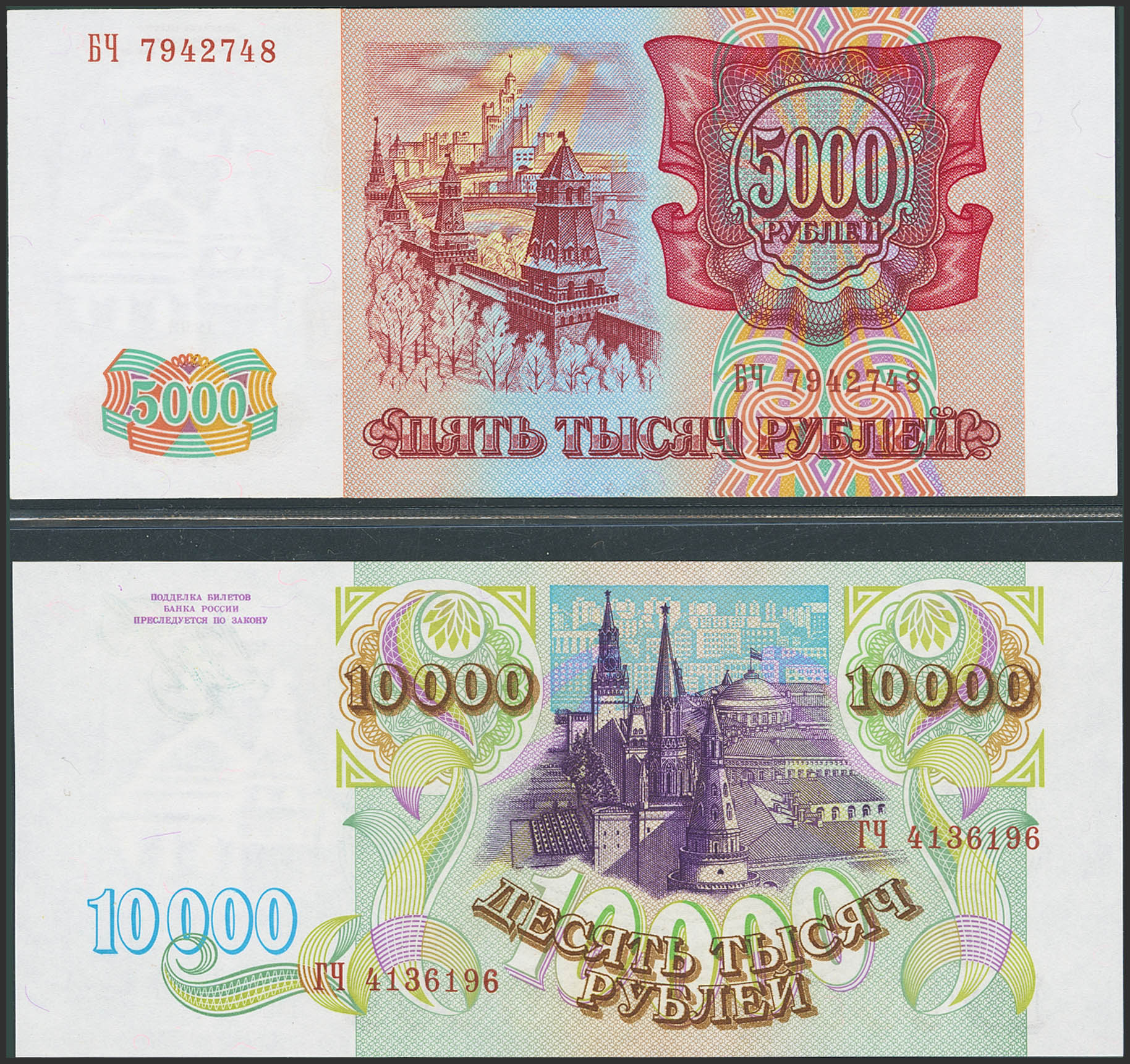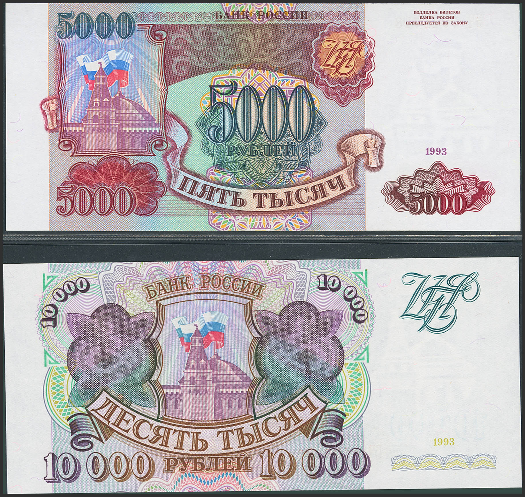 RUSSIA-FEDERATION. Lot of 2 notes from 5000 and 10000 Rubles. 1993. Bank Rossii. (Pick: 258a, 259a). Uncirculated.
