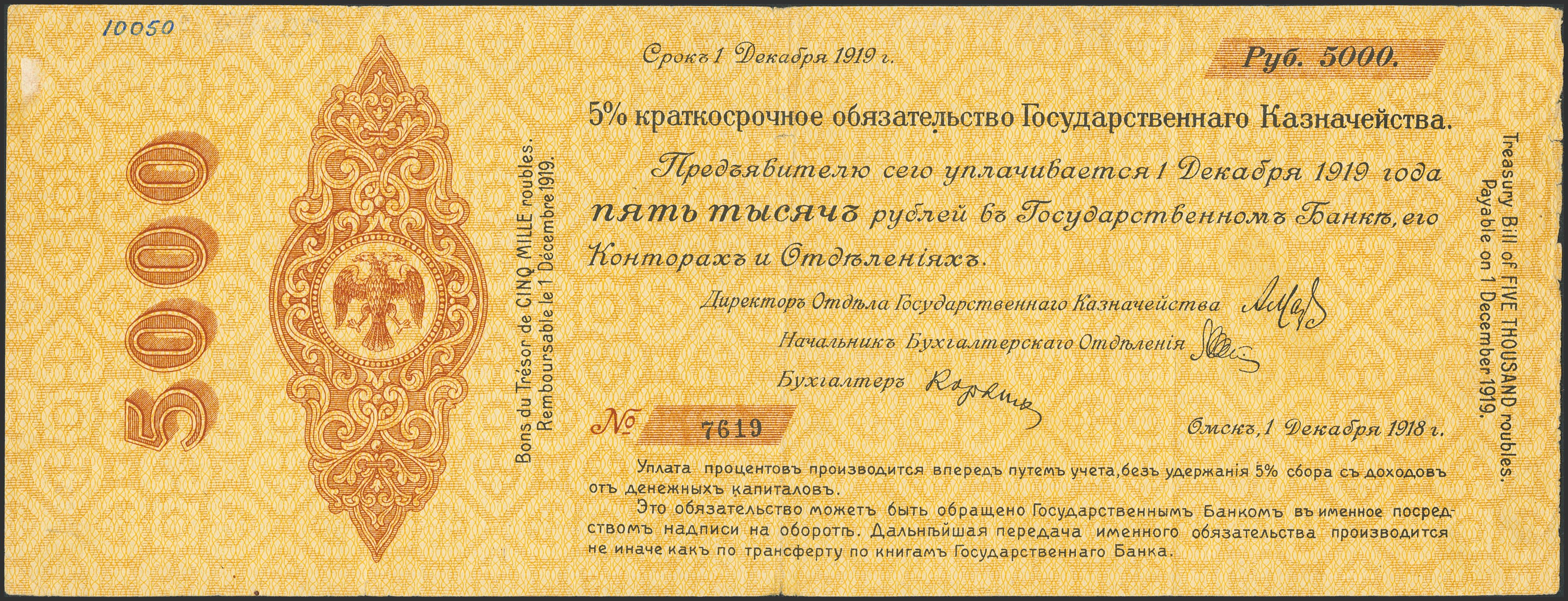RUSSIA-SIBERIA AND URALS. 5000 Rubley. 1 December 1918. Treasury. Omsk. (Pick: S833). Tears and pinholes. More than Very Fine.
