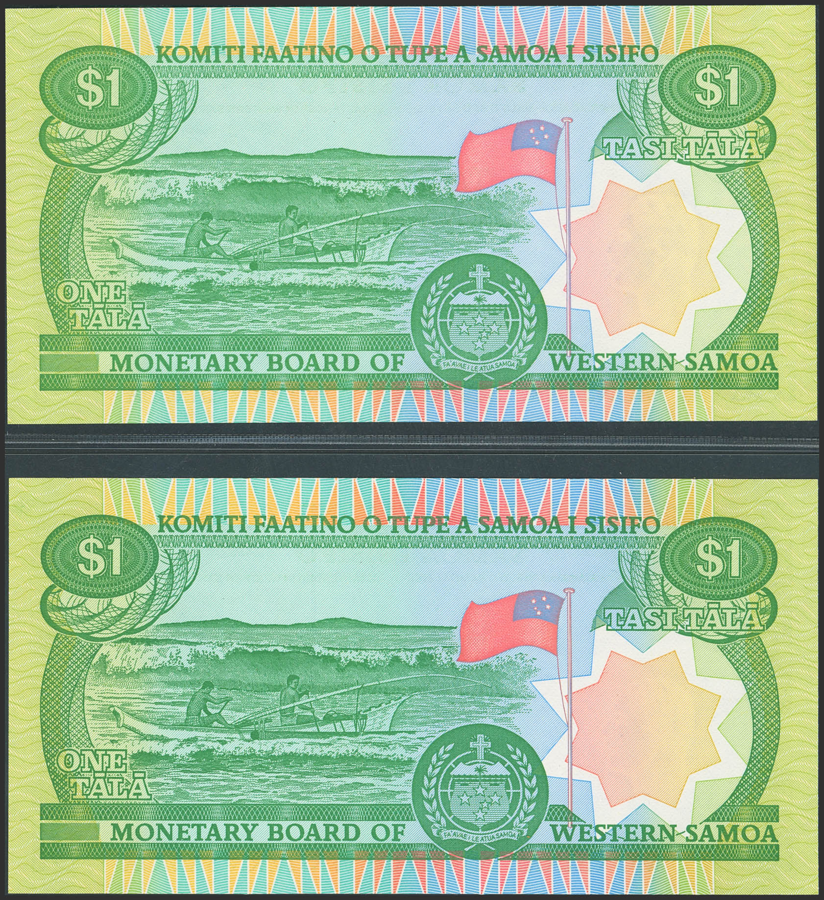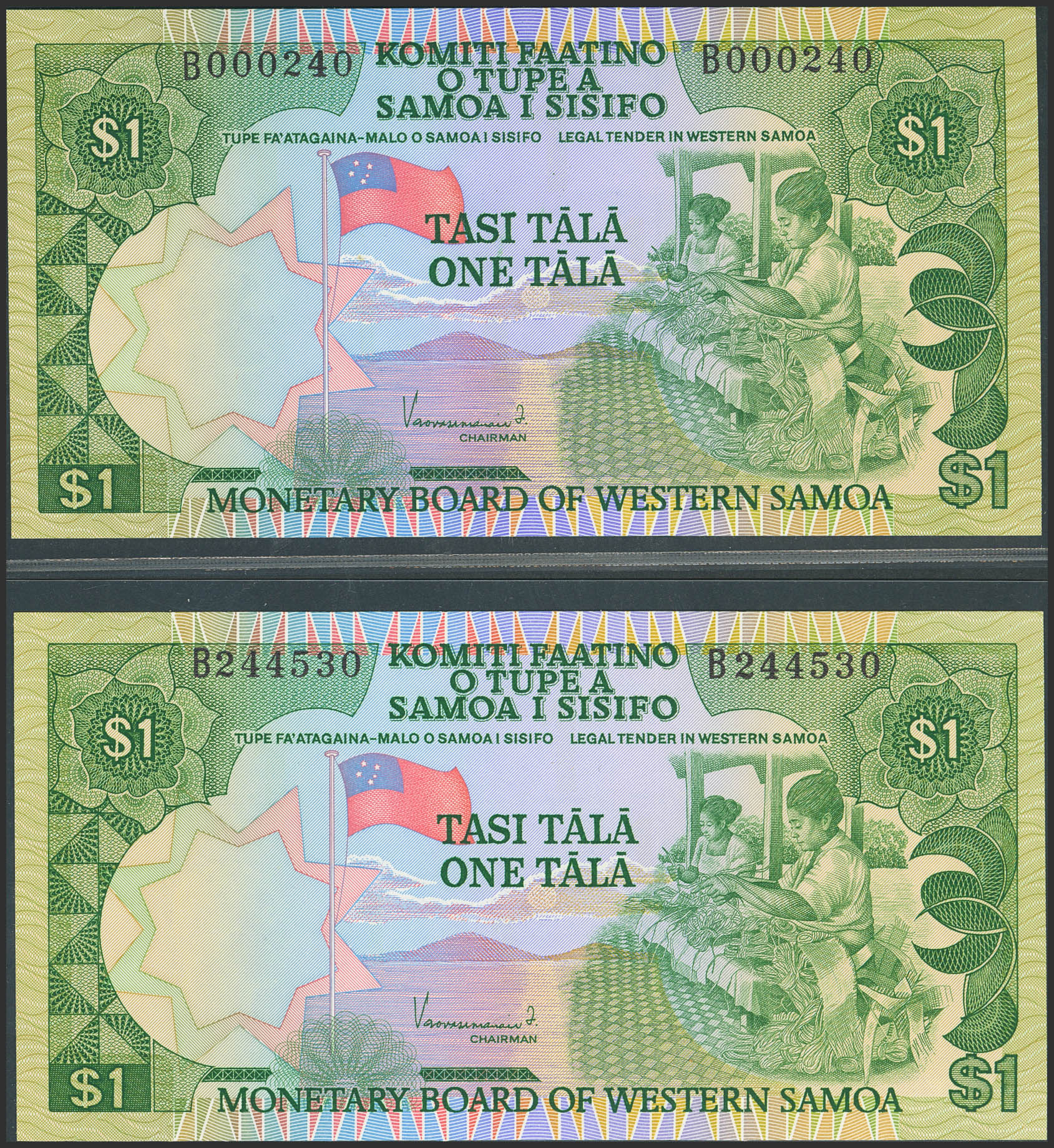 English SAMOA. Lot of 2 notes of 1 Tala. (1980ca). Monetary Board. Both with series B, one of them with a low serial number. (Pick: 19a). Uncirculated and Less than Uncirculated.
