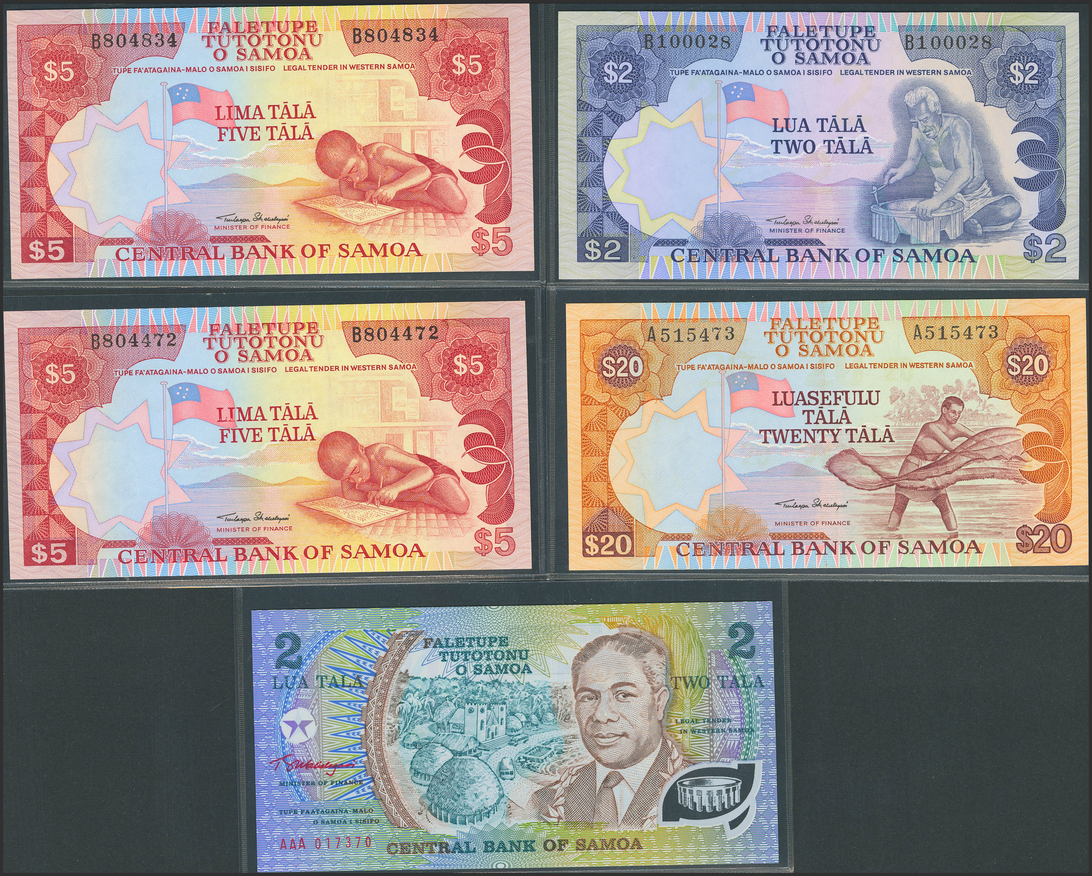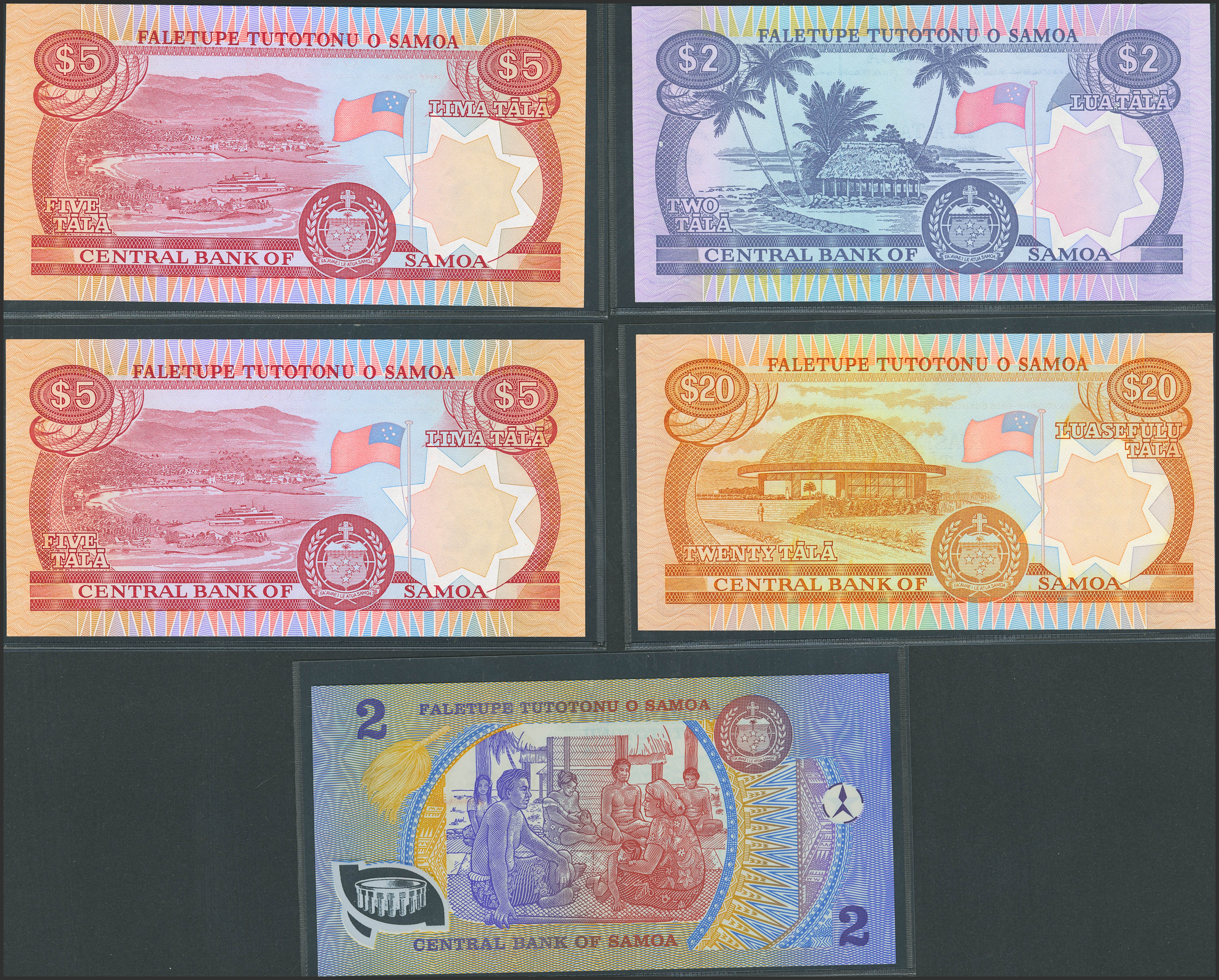 SAMOA. Lot of 5 notes of 2, 5 and 20 Tala. (1985ca). Central Bank. Legal Tender in Western Samoa. (Pick: 25, 26(2), 28, 31a). Almost Uncirculated (1) and Uncirculated (3).