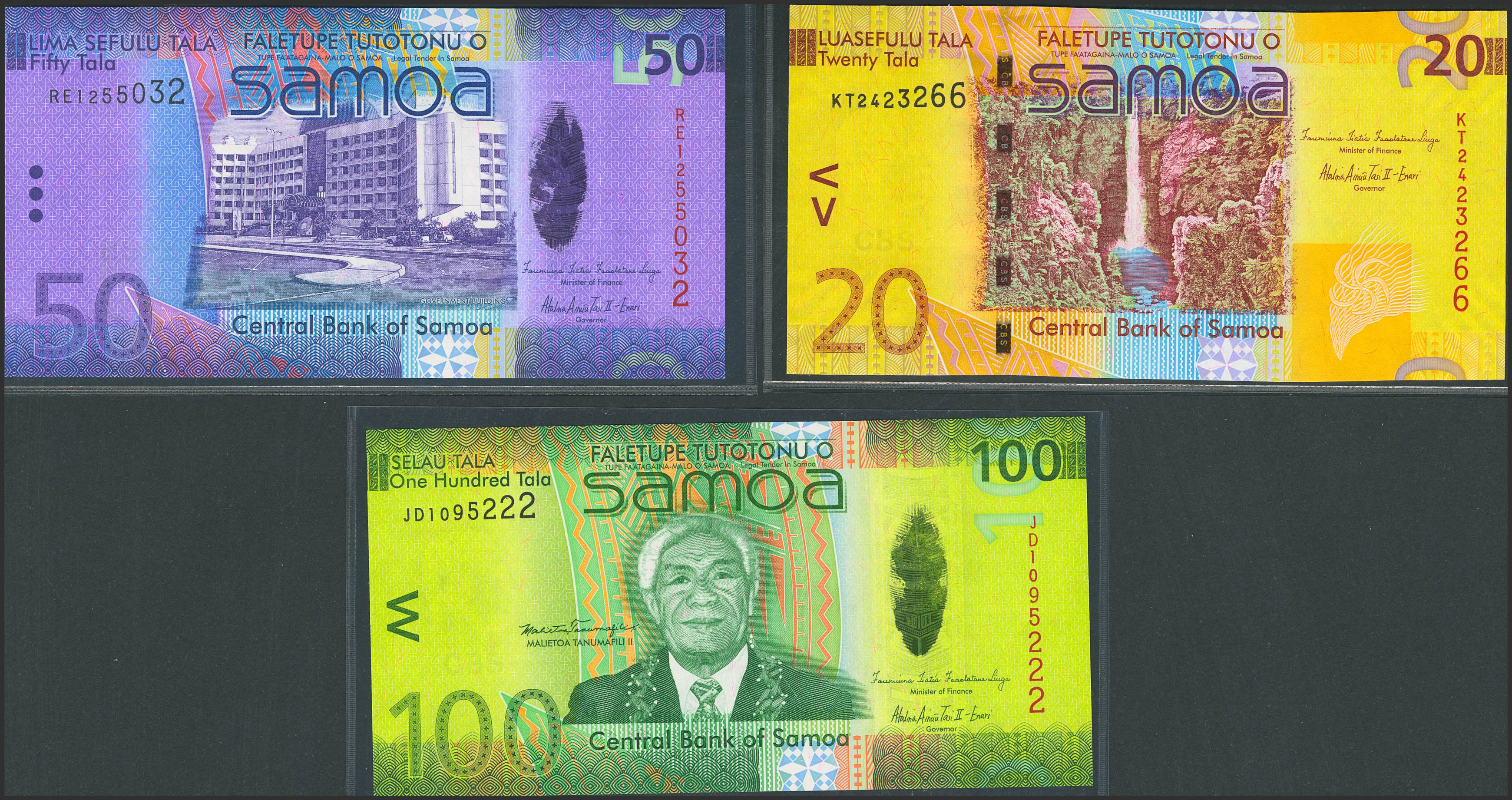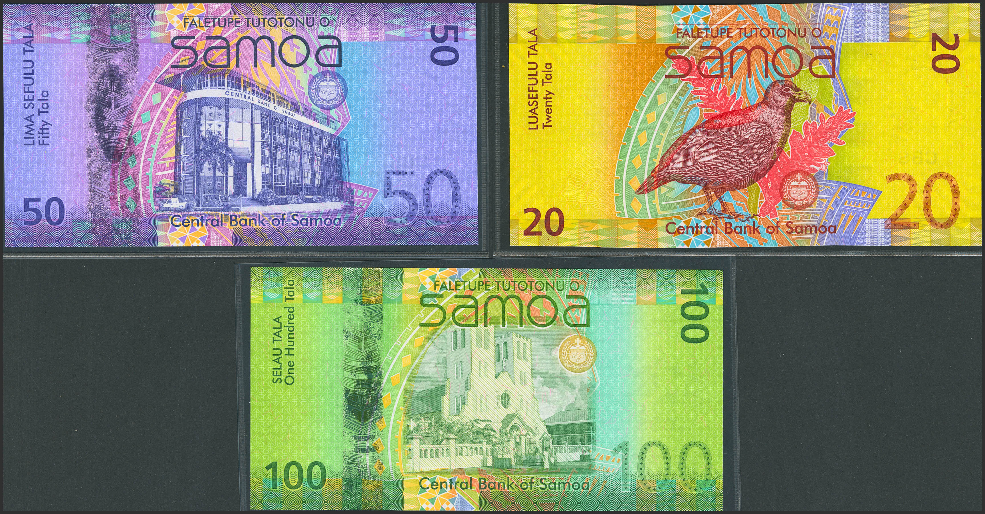 SAMOA. Lot of 3 notes of 20, 50 and 100 Tala. (2012ca). Central Bank. (Pick: 40b, 41b, 44a). Uncirculated.