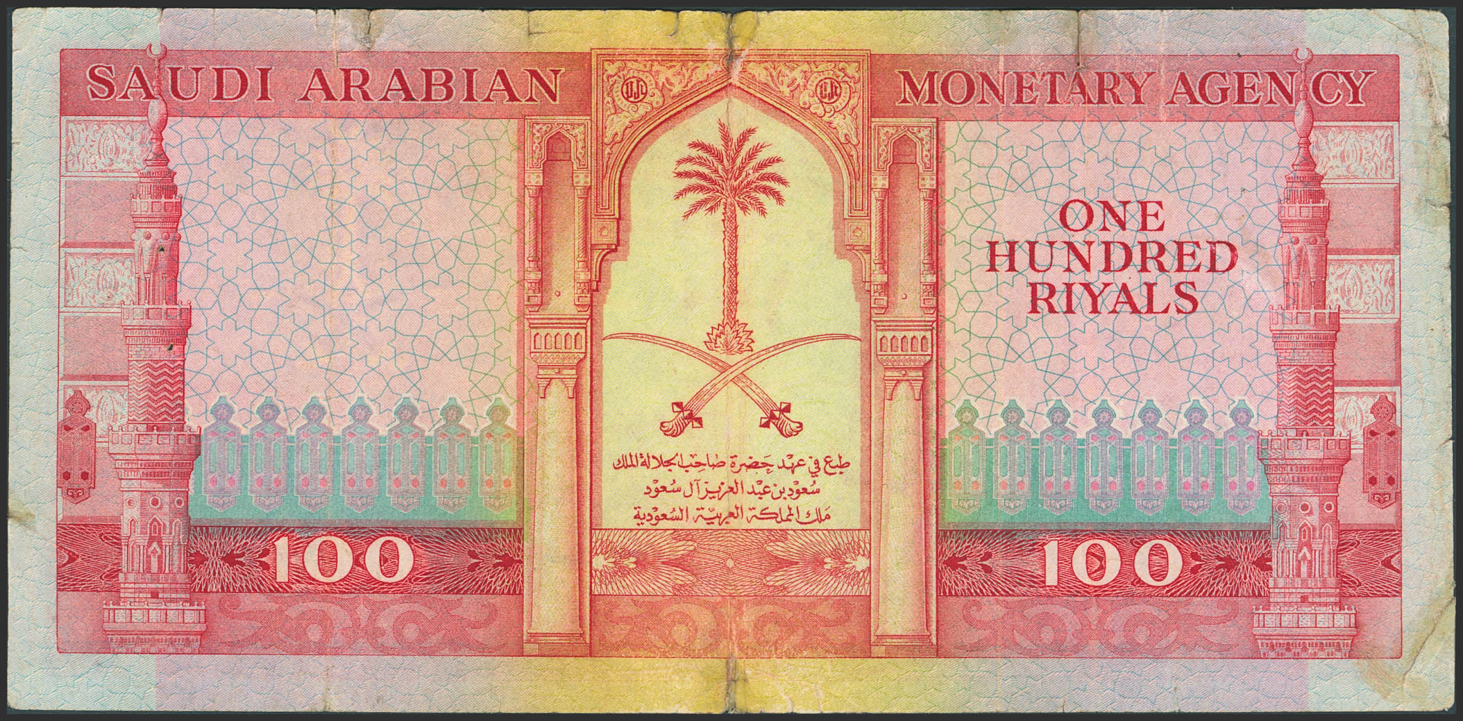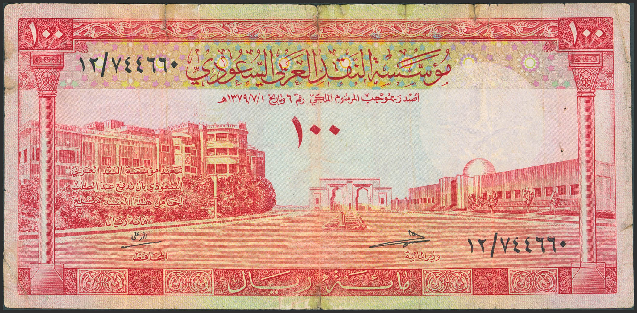 SAUDI ARABIA. 100 Riyals. 1961. Saudi Arabian Monetary Agency. (Pick: 10a). Fine, glue crudely applied over tears.