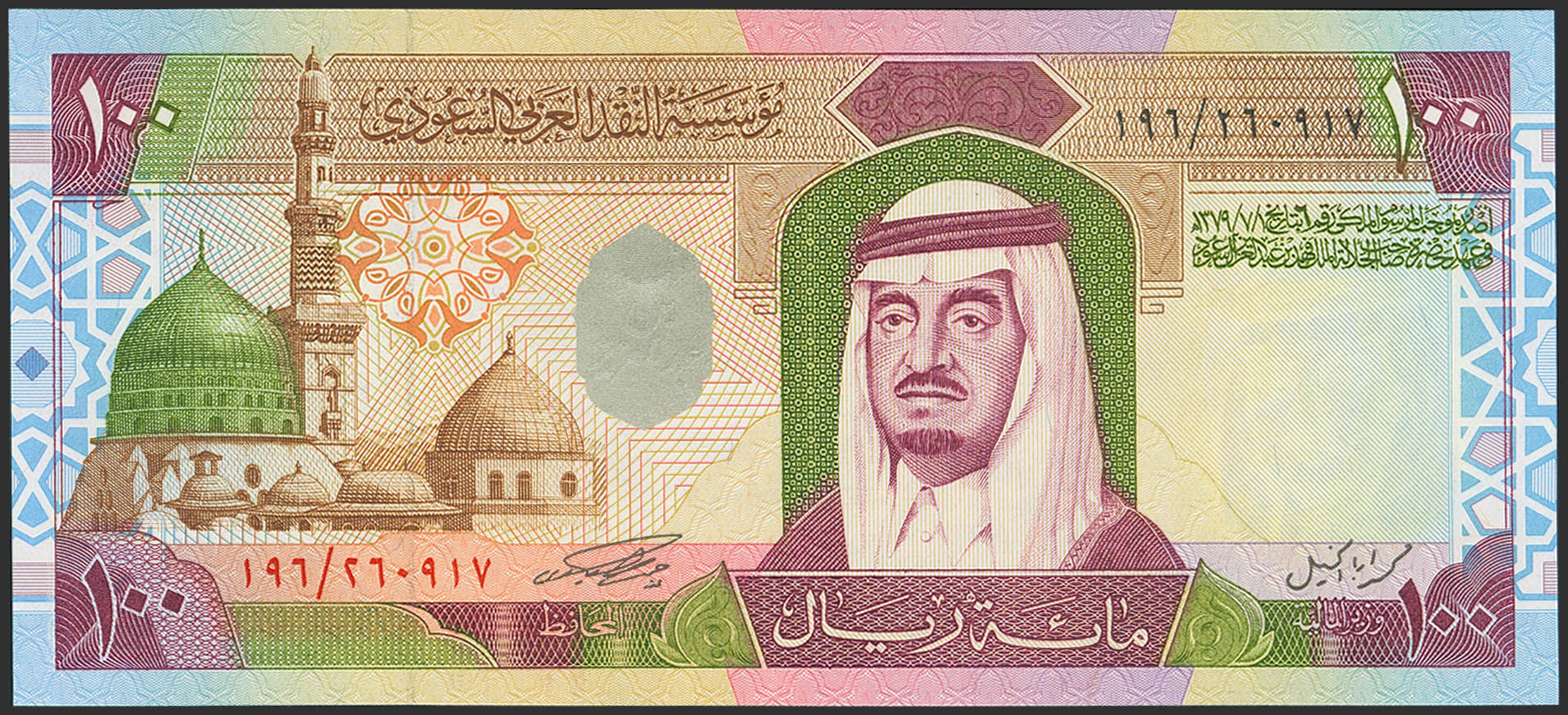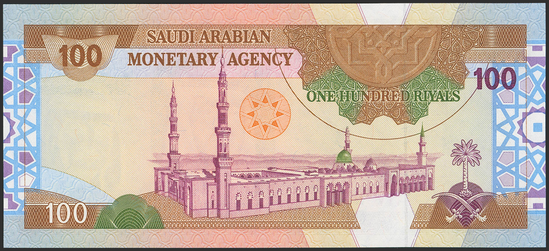 English SAUDI ARABIA. 100 Riyals. 1961. Saudi Arabian Monetary Agency. With abbreviation for acting in the signature. (Pick: 25a). Uncirculated.