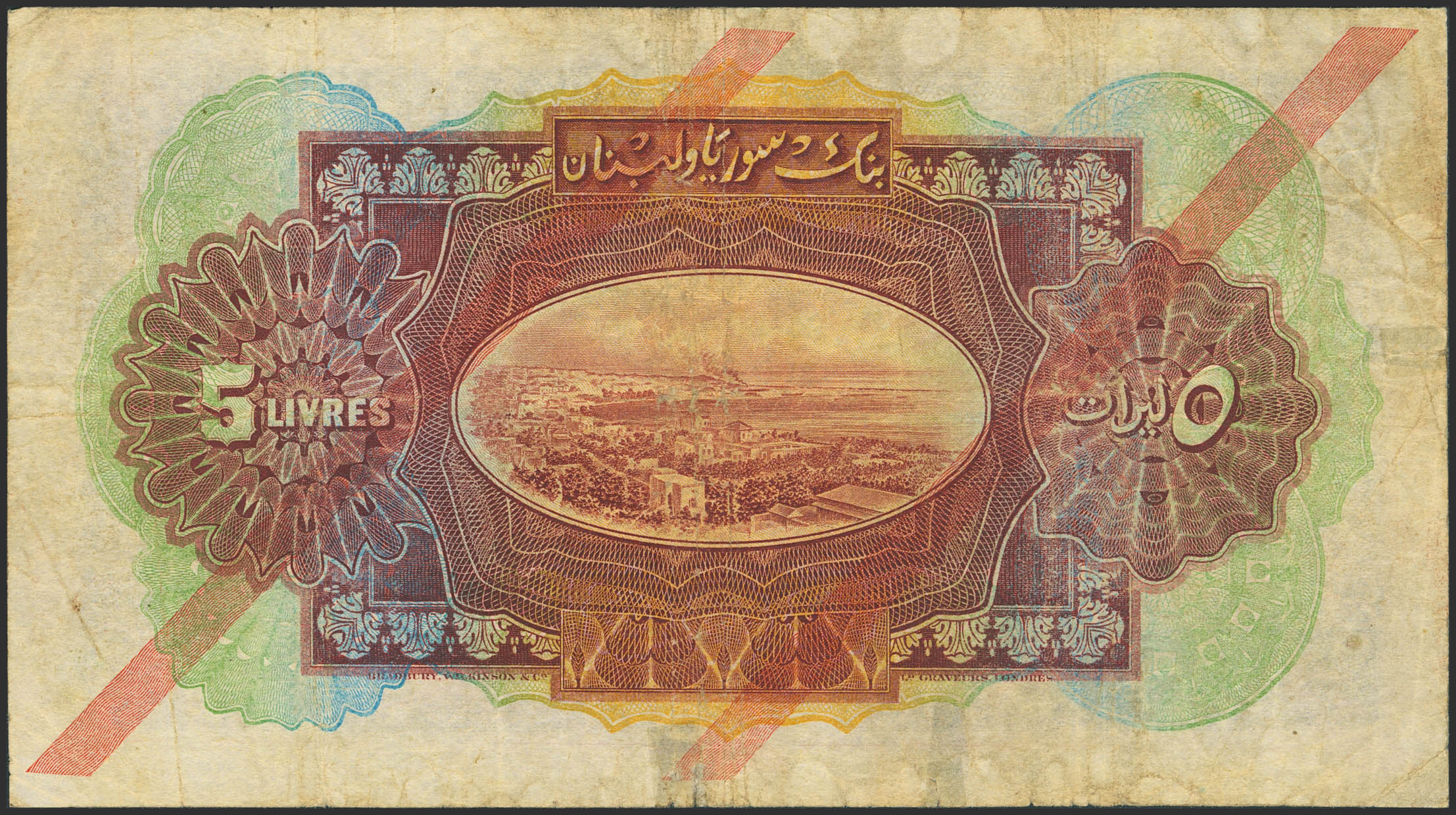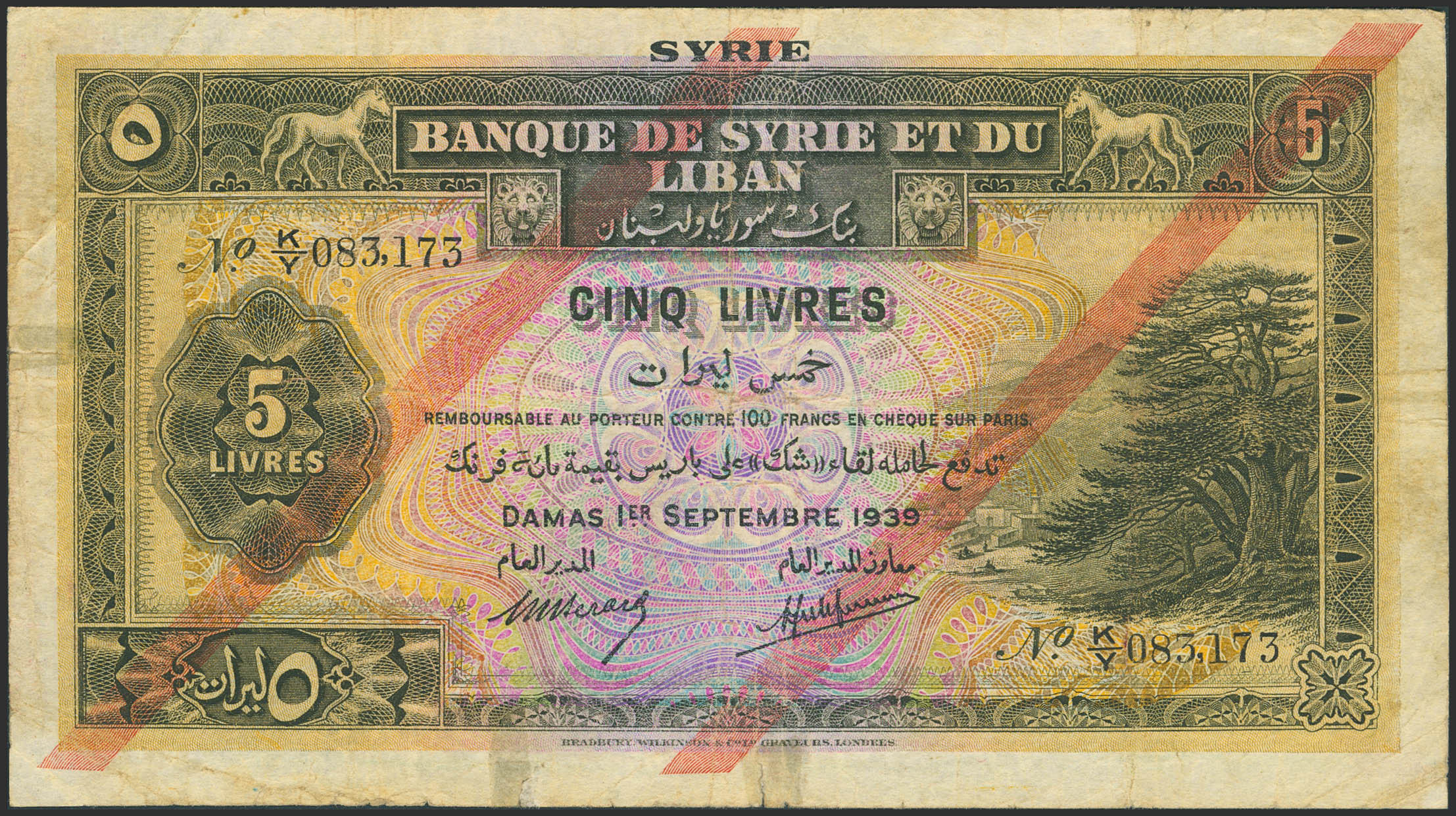 SYRIA. 5 Livres. 1 September 1939. Banque de Syrie et du Liban. (Pick: 41c). Fine / Very Fine, residue of tape over tears.