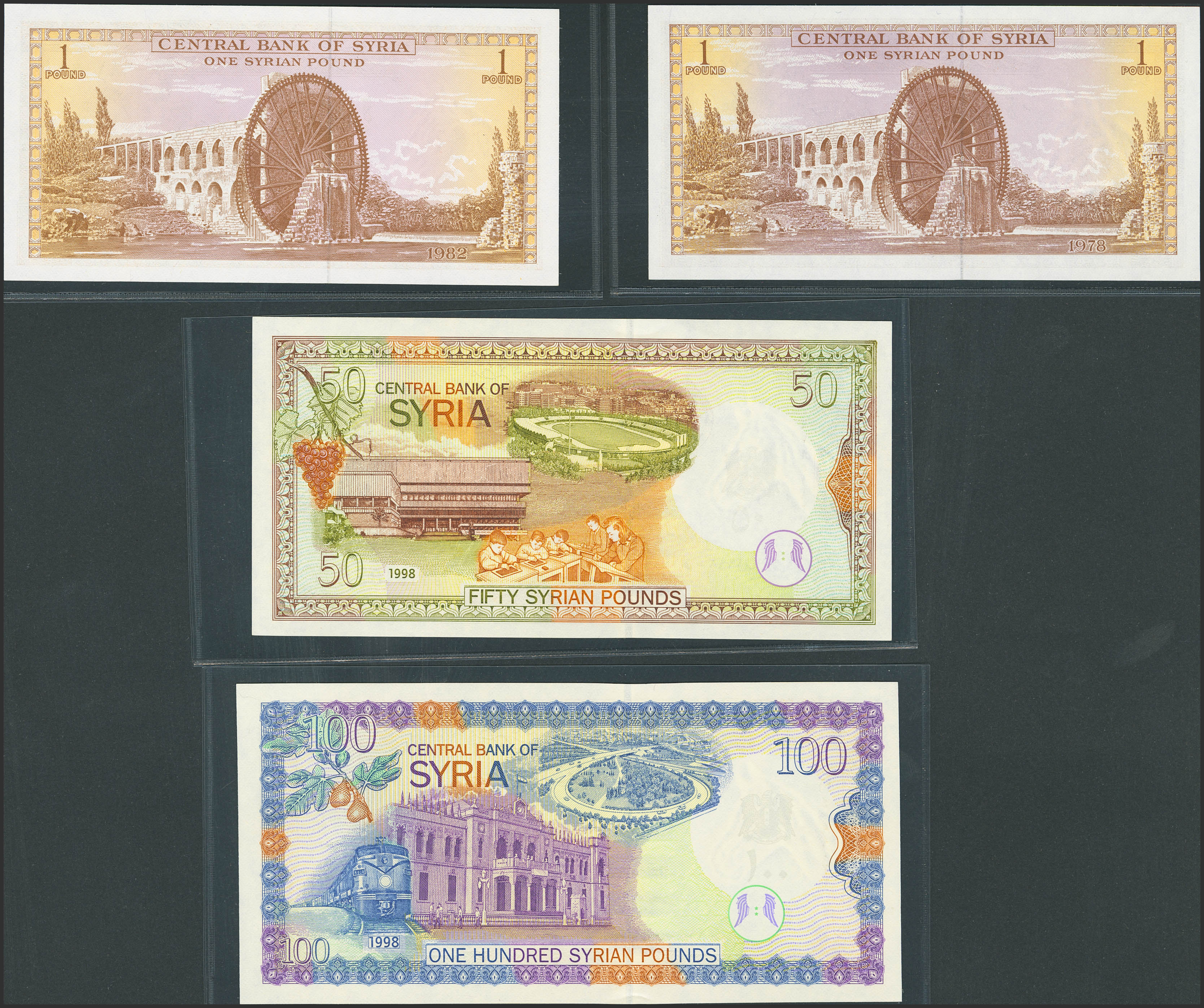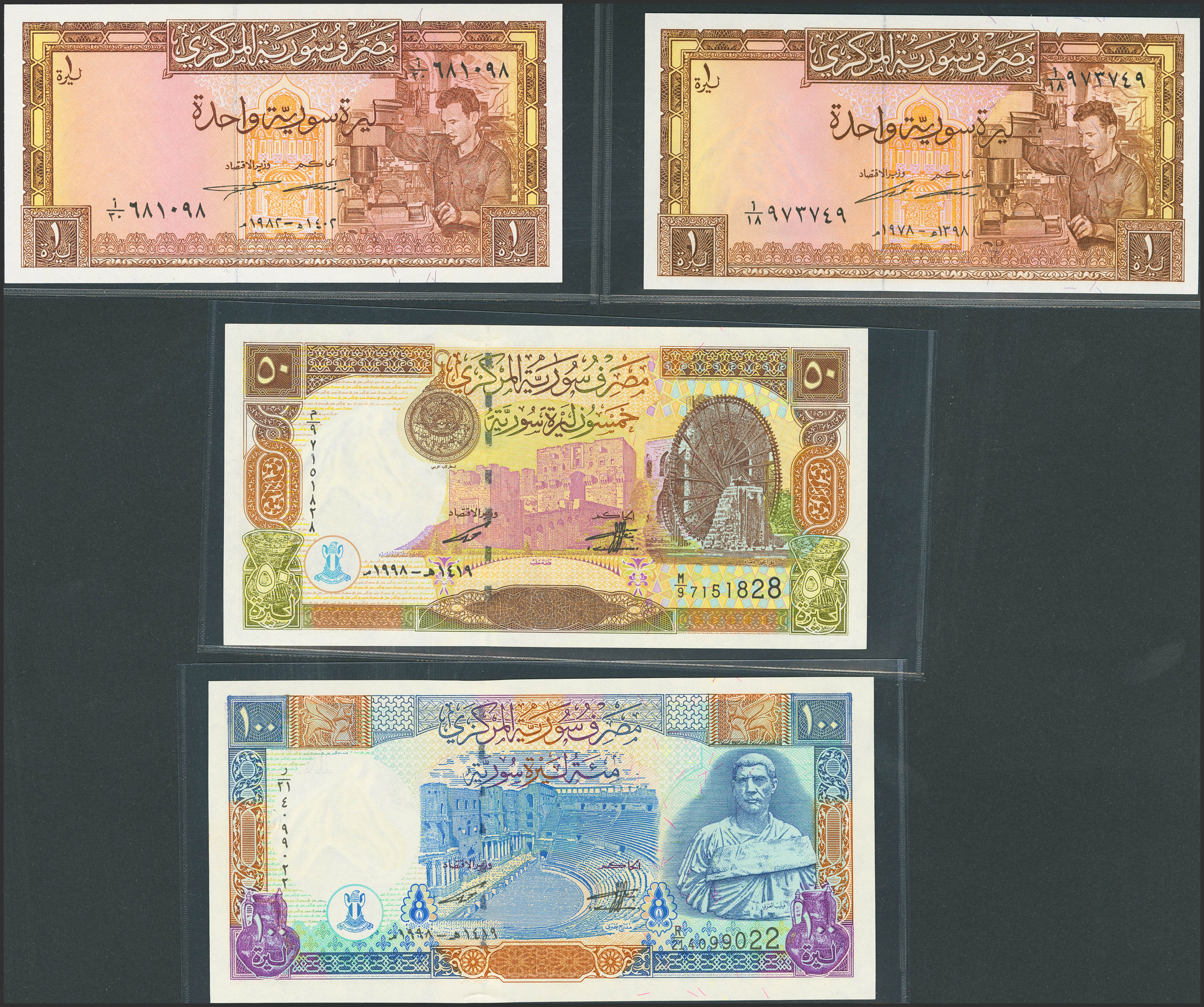 SYRIA. Lot of 4 notes from 1 Syrian Pound-100 Syrian Pounds. 1978-1998. Central Bank. (Pick: 93d, 93e, 107, 108). Uncirculated.