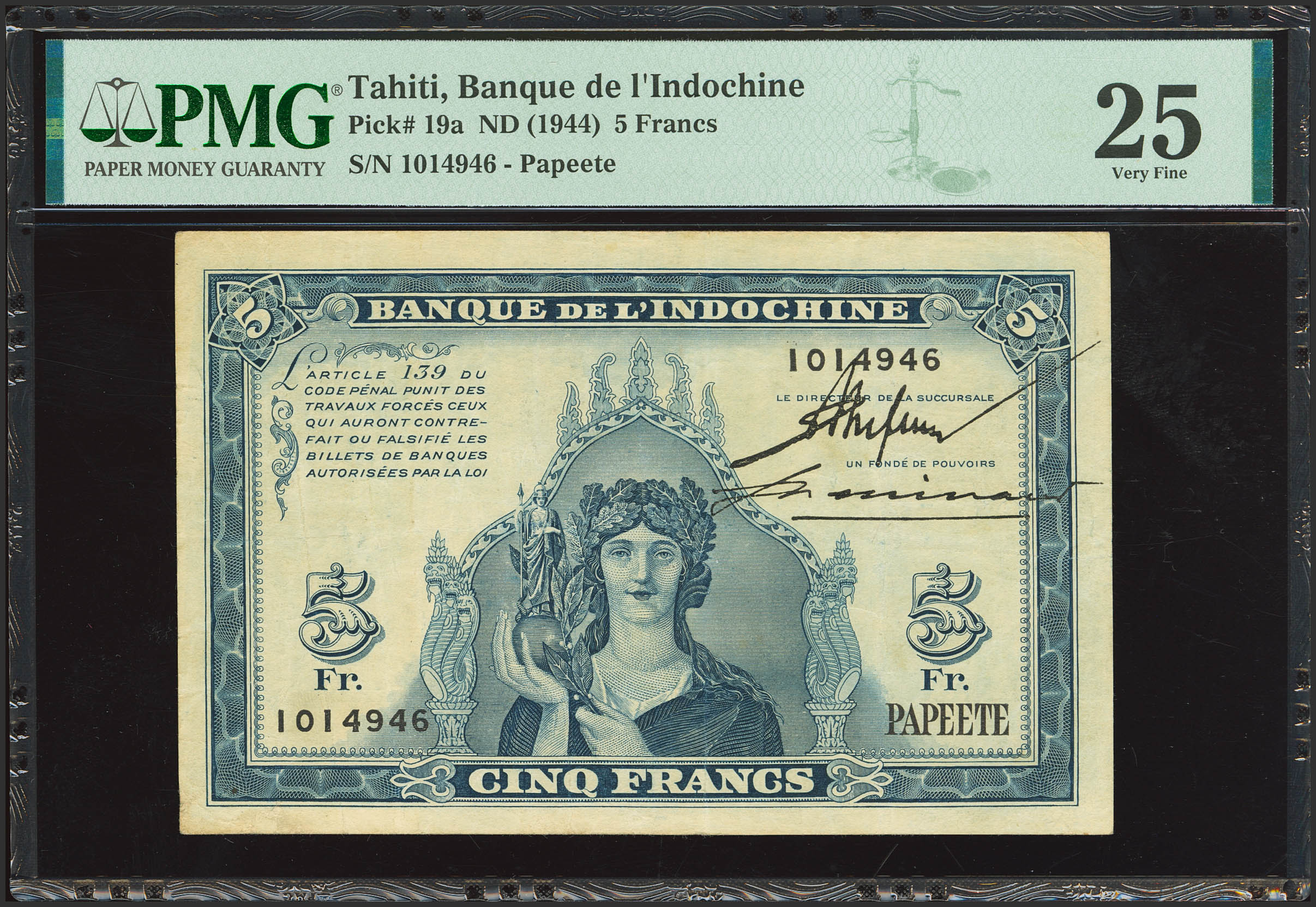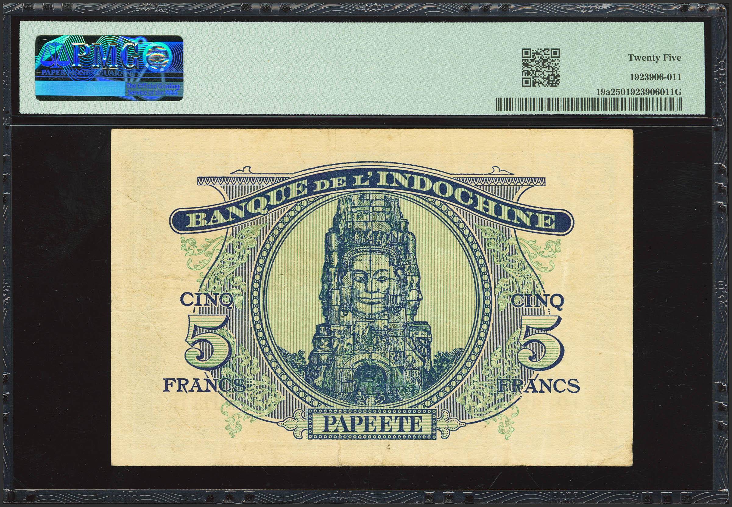 TAHITI. 5 French. (1945ca). Banque de L'Indochine, papeete. (Pick: 19a). PMG25.