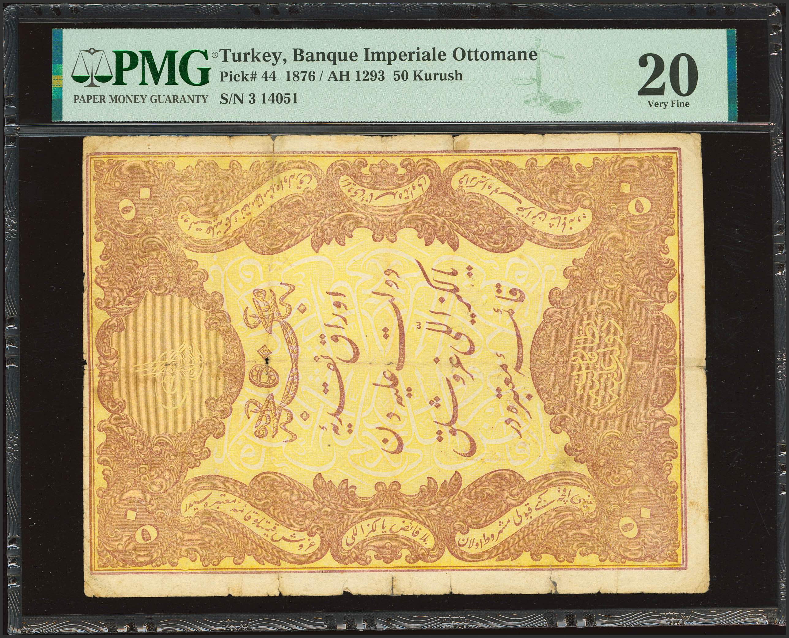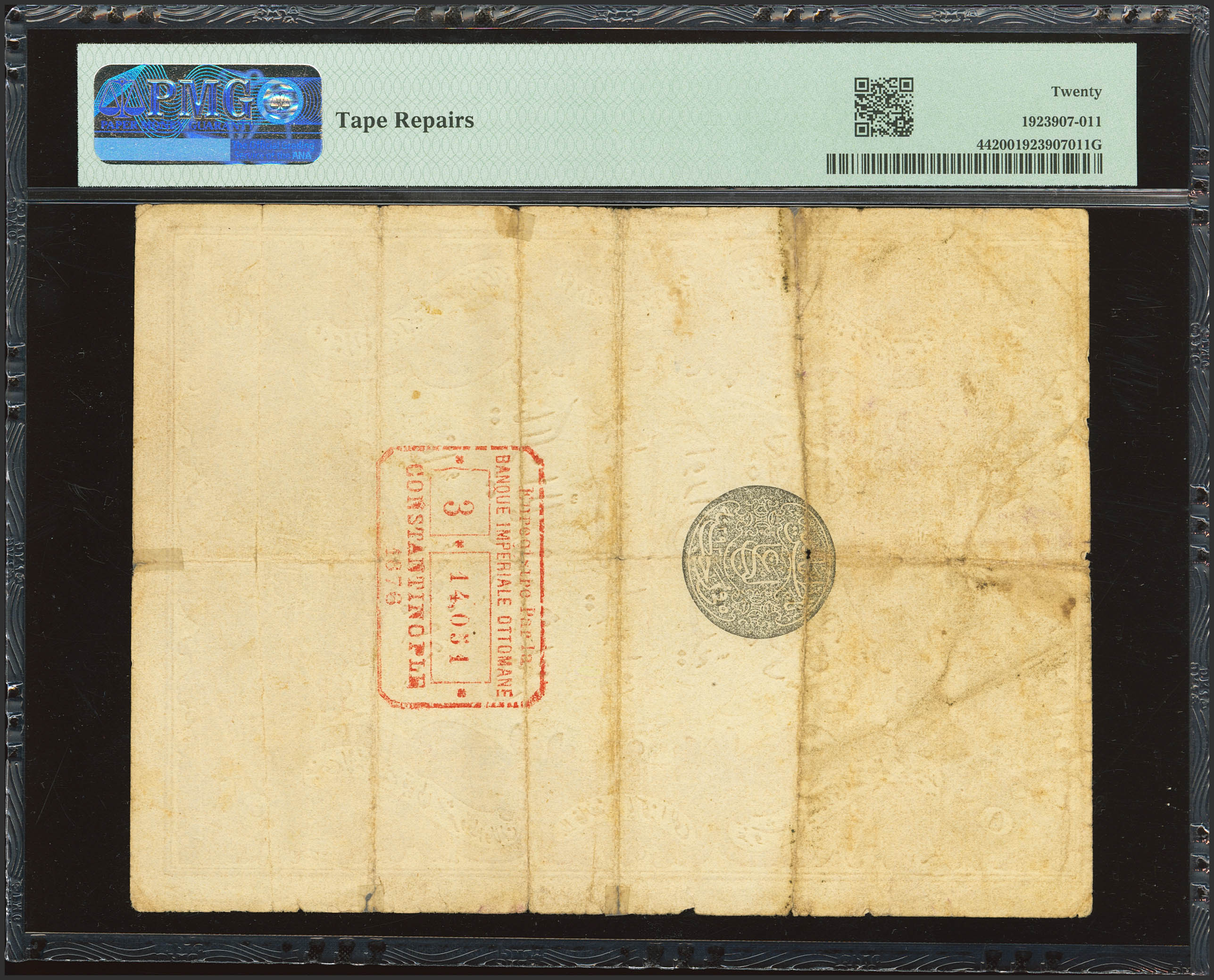 English TURKEY. 50 Kurus. 1876. Banque Imperiale Ottomane. Toughra of Murad V on front and Seal of Galip on Back. (Pick: 44). PMG20 (tape repairs).