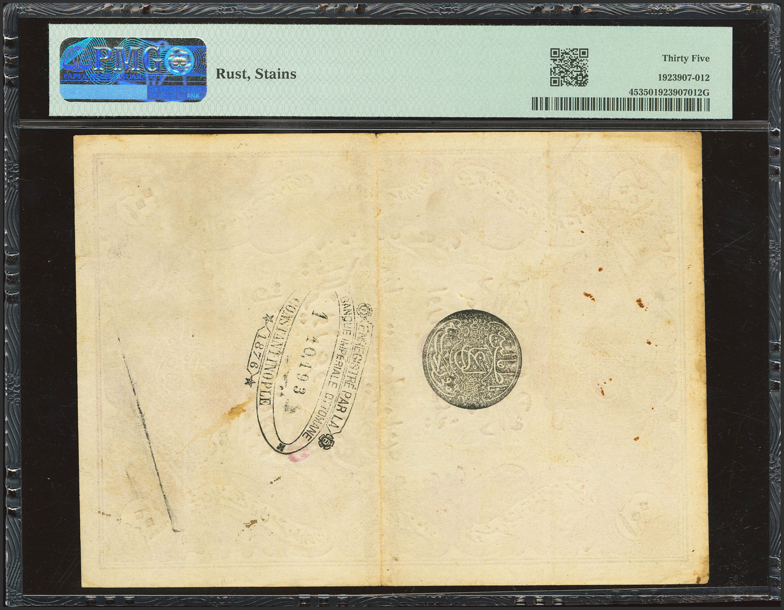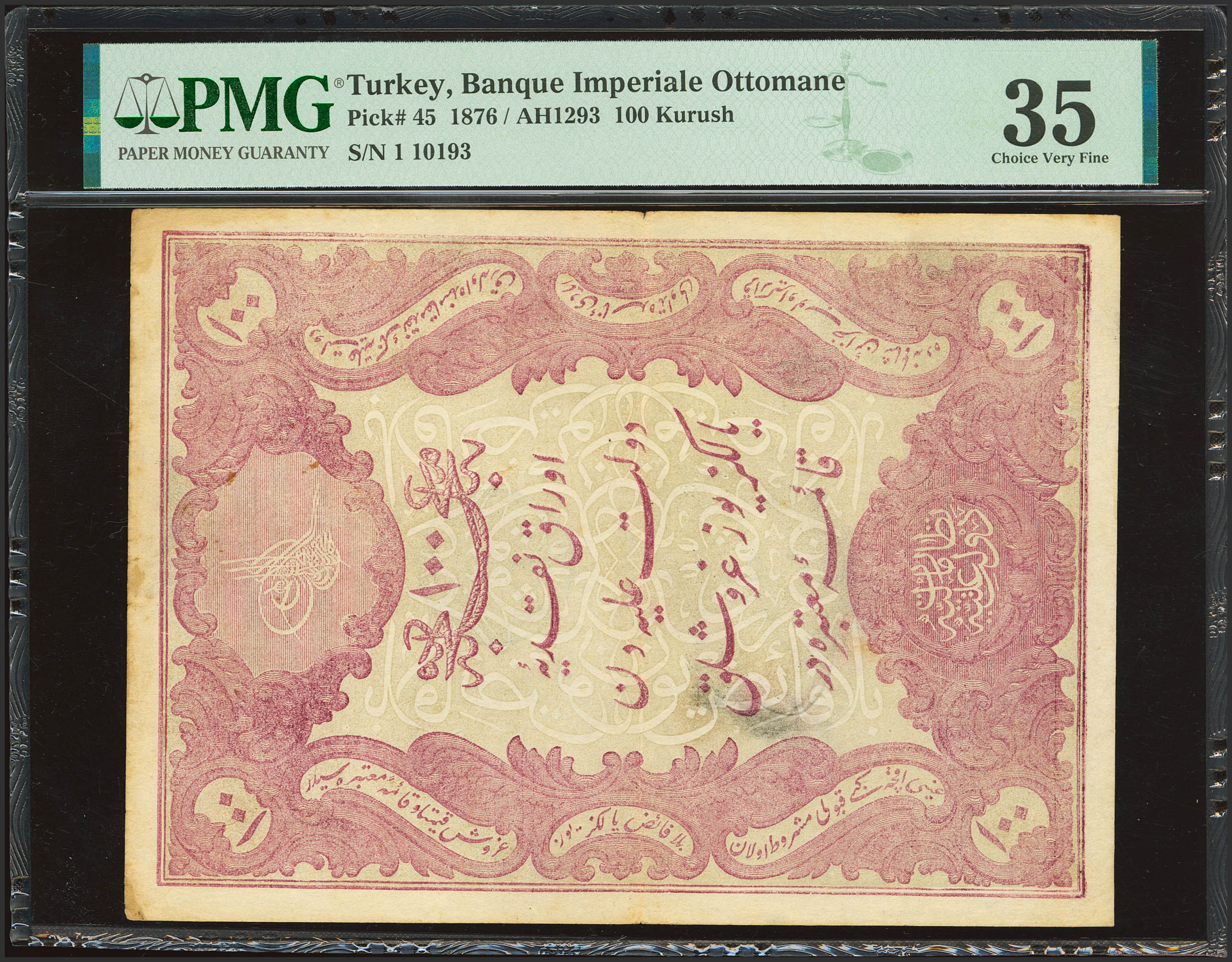 TURKEY. 100 Kurus. 1876. Banque Imperiale Ottomane. Toughra of Murad V on front and Seal of Galip on Back. (Pick: 45). PMG35 (rust, stains).