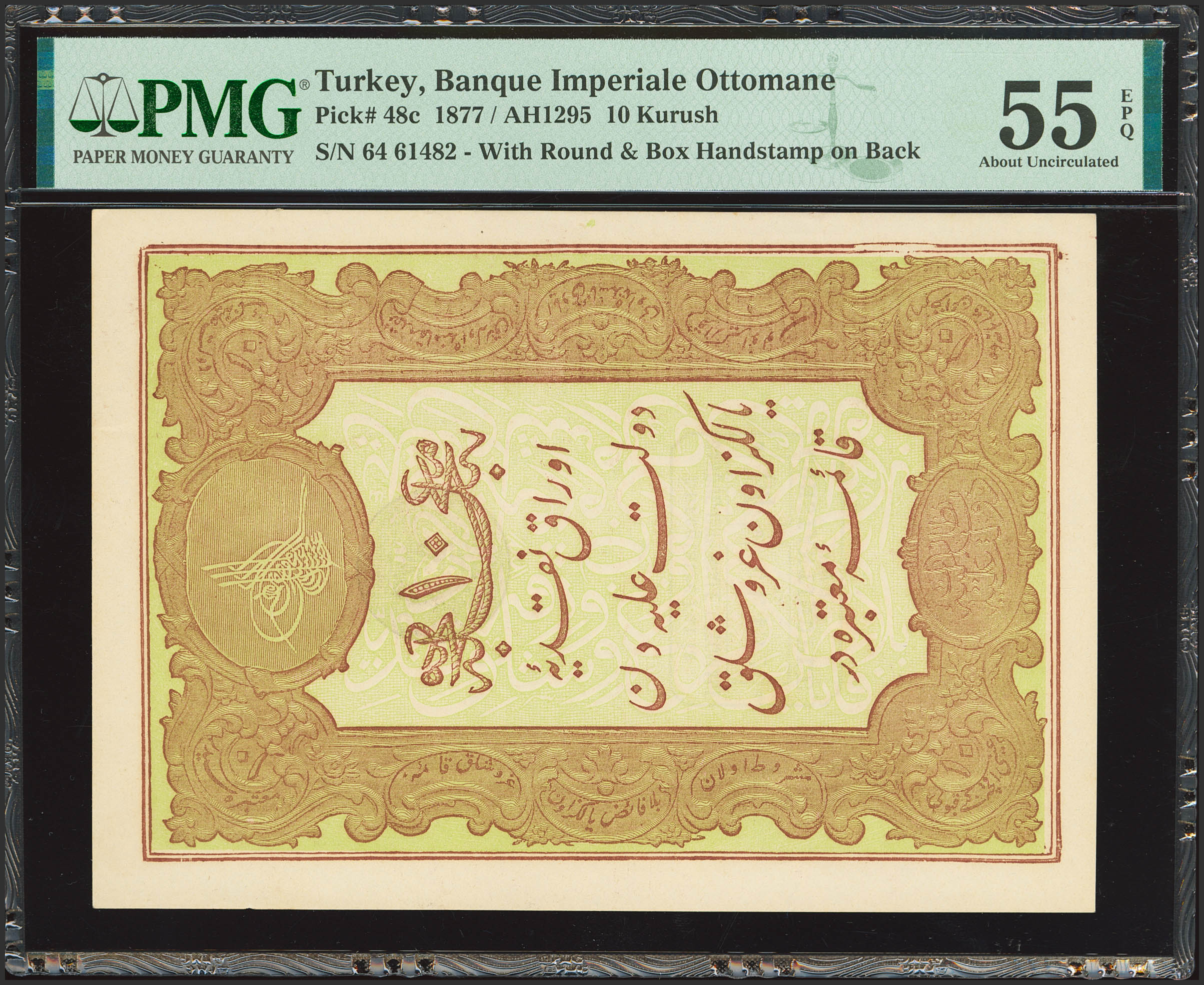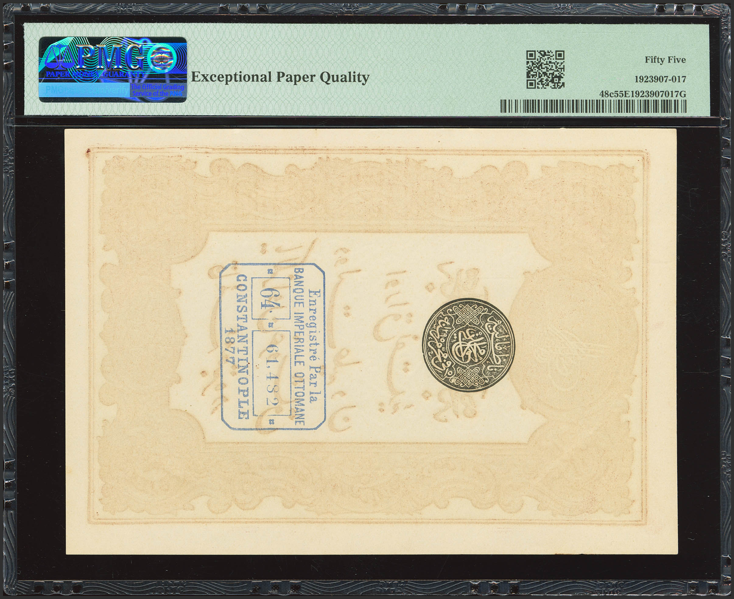 English TURKEY. 10 Kurus. 1877. Banque Imperiale Ottomane. Toughra of Abdul Hamid II on front and Seal of Mehmed Kani on back. (Pick: 48c). PMG55EPQ.
