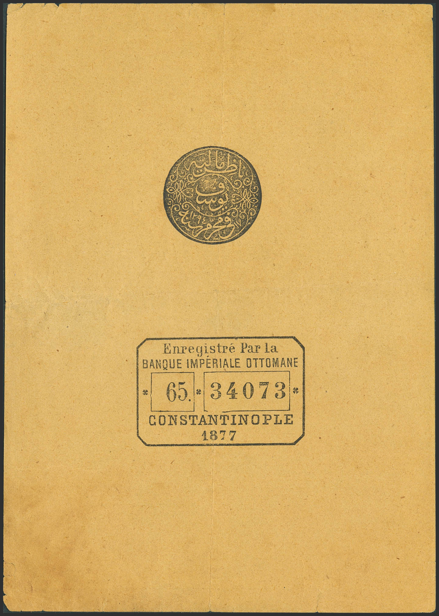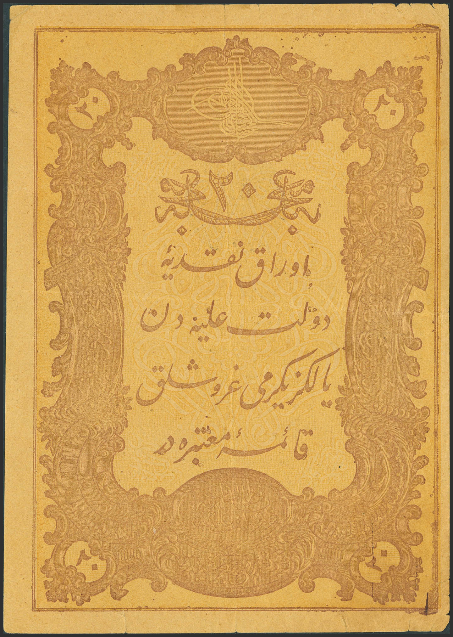 TURKEY. 20 Kurus. 1877. Banque Imperiale Ottomane. Toughra of Abdul Hamid II on front and Seal of Yusef on back. (Pick: 49b). Extremely Fine.