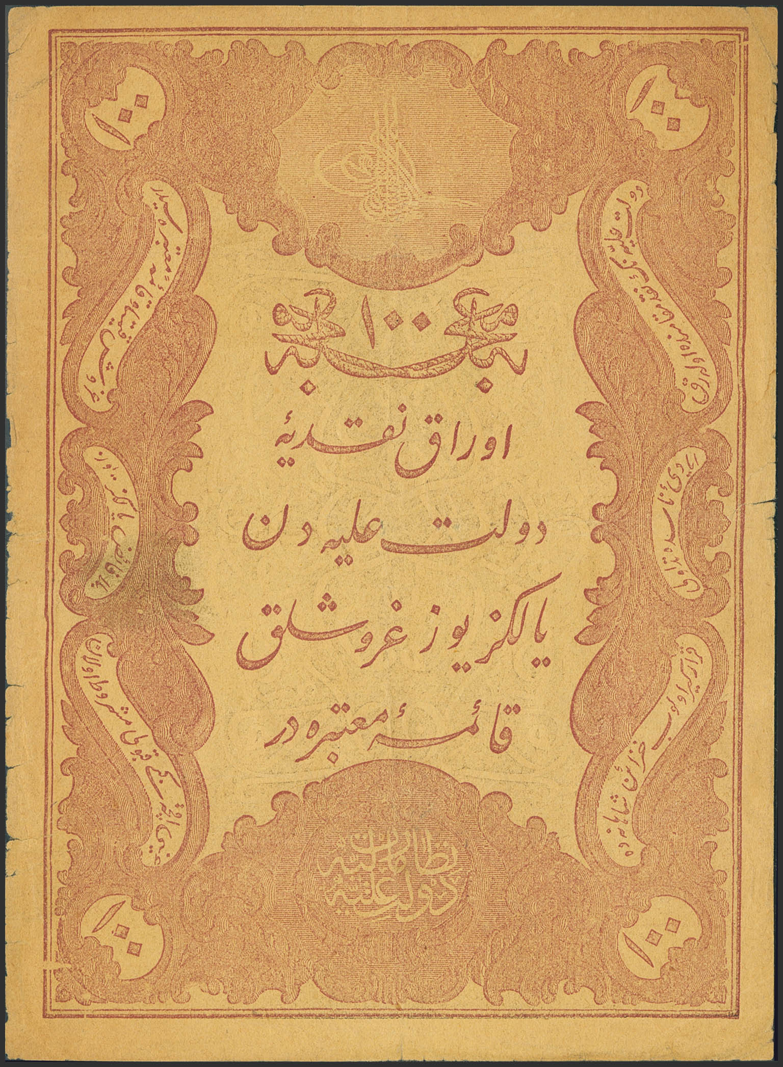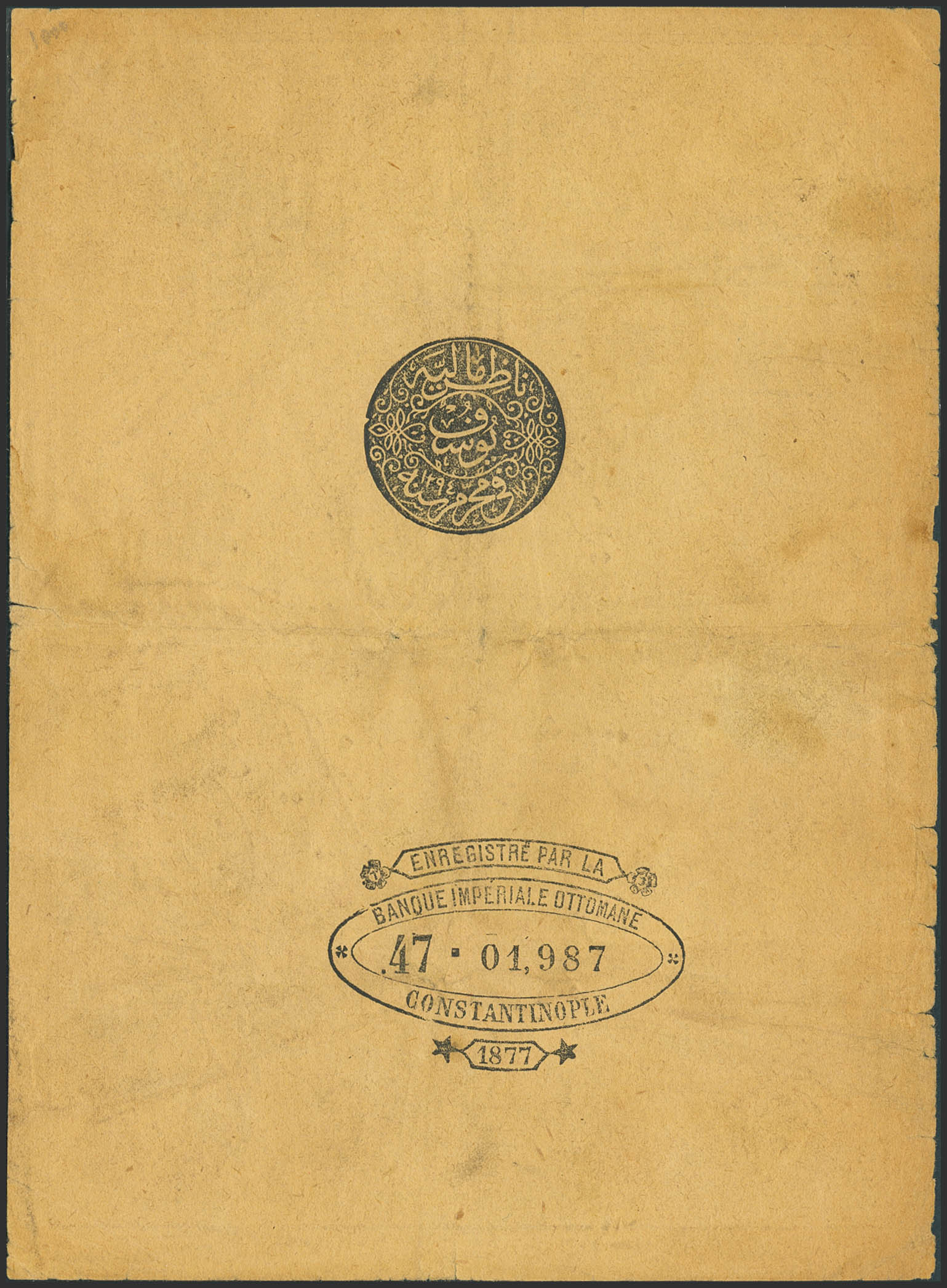 English TURKEY. 100 Kurus. 1877. Questionable Authenticity. Banque Imperiale Ottomane. Toughra of Abdul Hamid II on front and Seal of Yusef on back. (Pick: 51b). Very Fine.