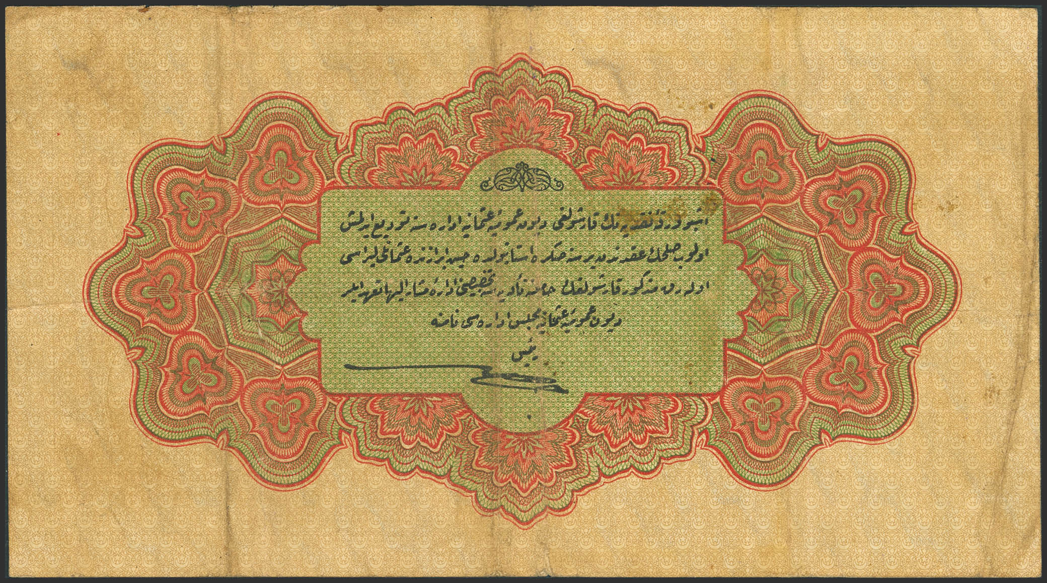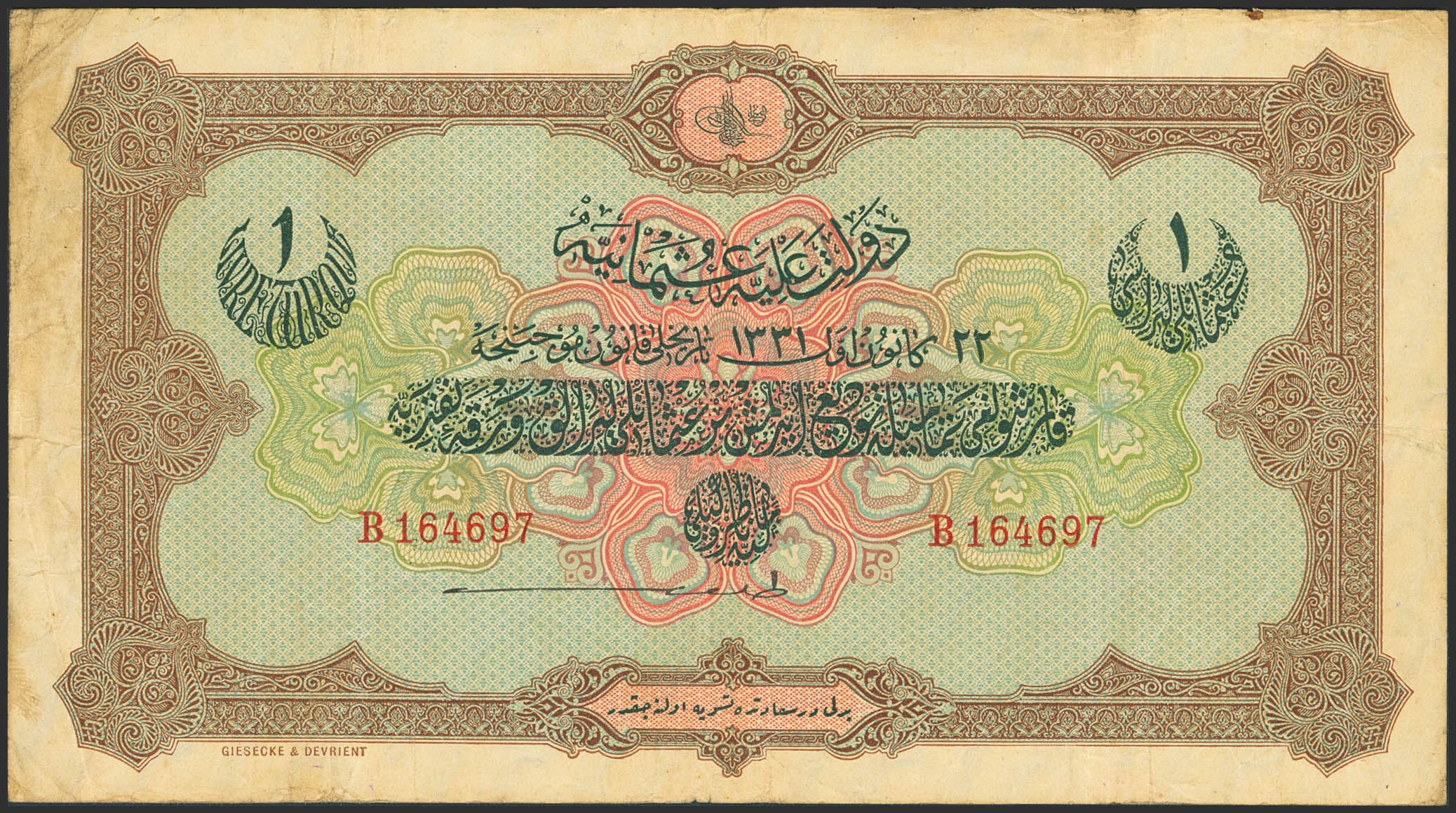 TURKEY. 1 Book. 4 January 1916. Dette Publique Ottomane. Hook Pattern watermark. Cahid signature on back. (Pick: 83). Very Fine, dirty.