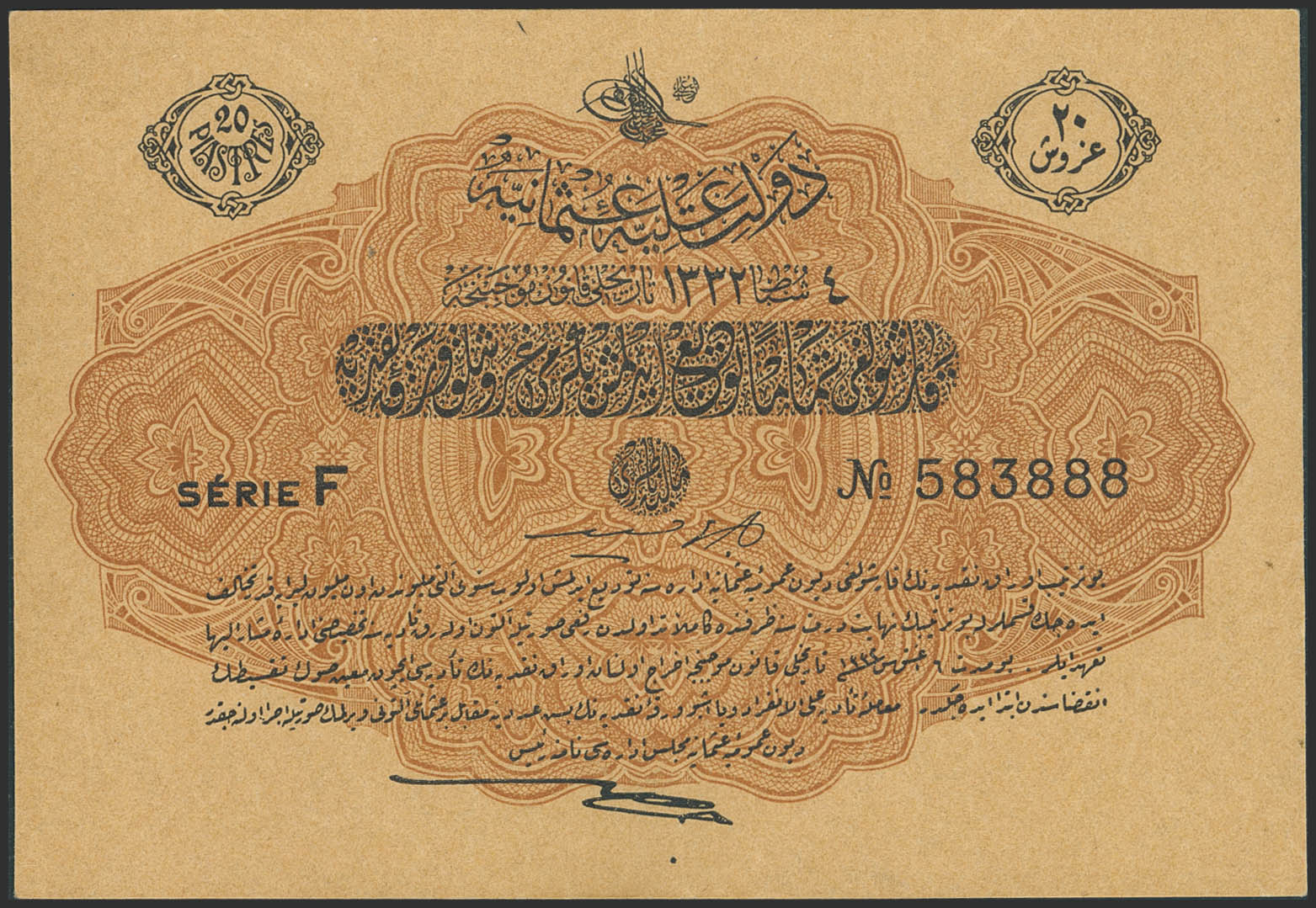TURKEY-OTTOMAN EMPIRE. 20 Piastres. 17 February 1917. Ottoman Public Debt. (Pick: 97). Almost Uncirculated.