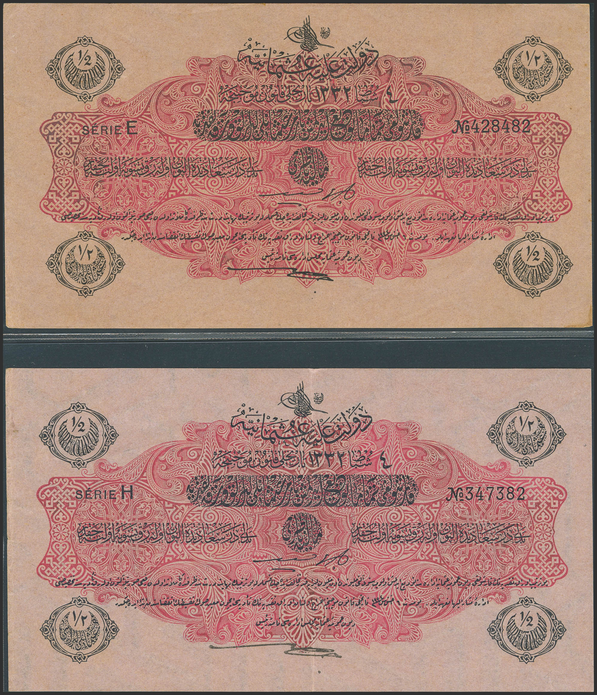 English TURKEY-OTTOMAN EMPIRE. Lot of 2 notes of ½ Livres. 17 February 1917. Ottoman Public Debt. (Pick: 98). Less than Uncirculated and Almost Uncirculated.