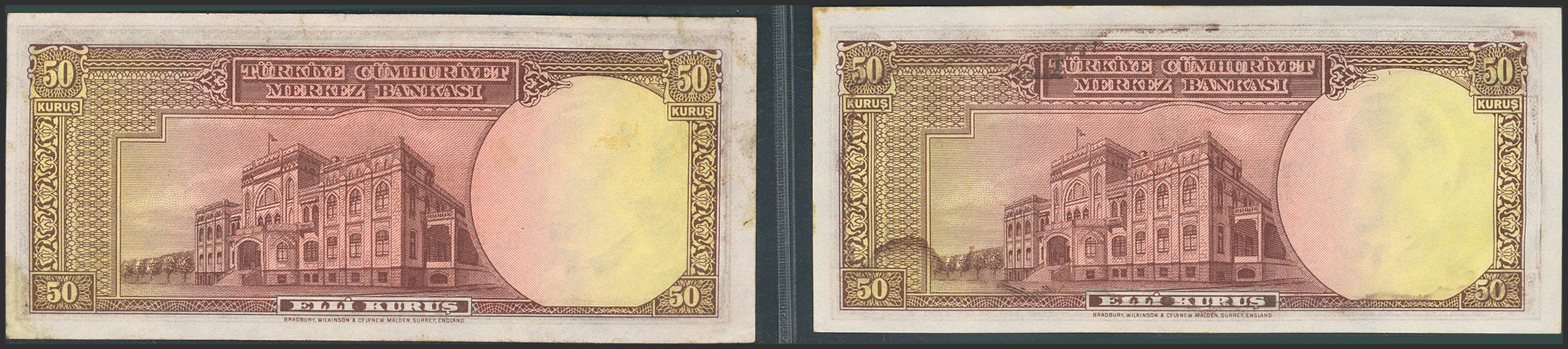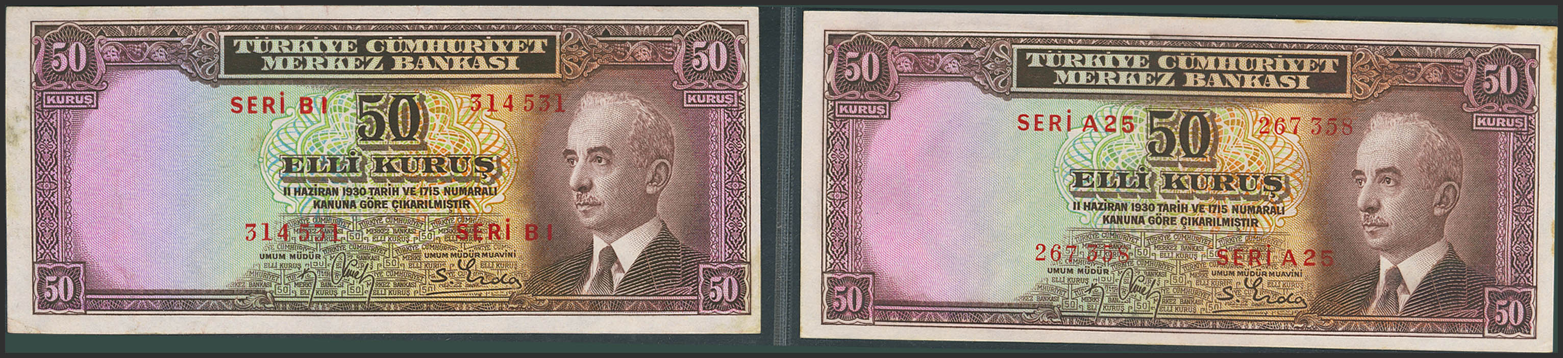 TURKEY-REPUBLIC. Lot of 2 notes of 50 Kurus. 1930. Central Bank of the Republic. (Pick: 133). Rust. Less than Uncirculated and Almost Uncirculated.