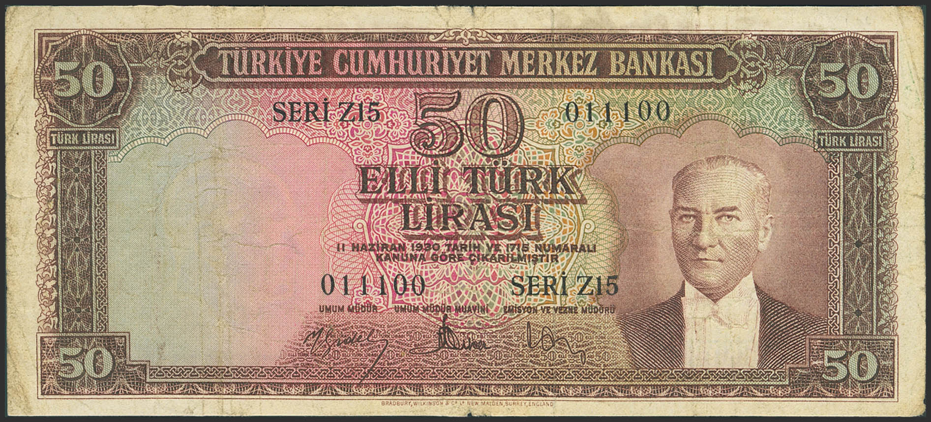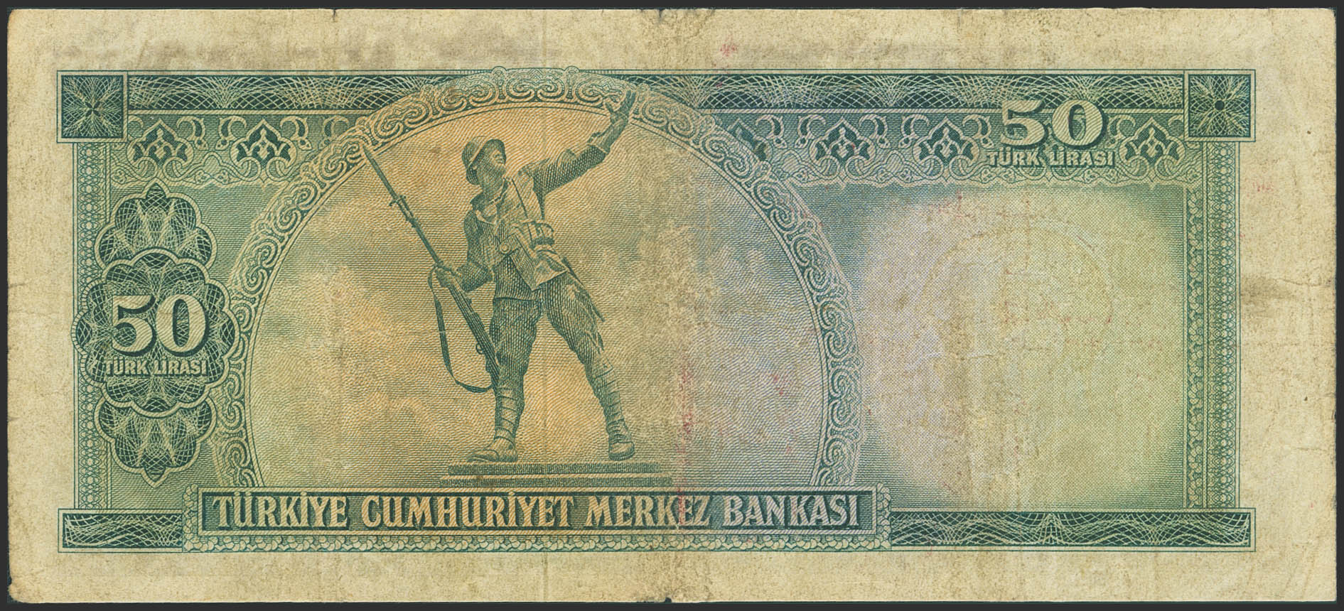 TURKEY-REPUBLIC. 50 Lirasi. (1951ca). Central Bank of the Republic. (Pick: 165a). Washed, flattened and tears. Fine.