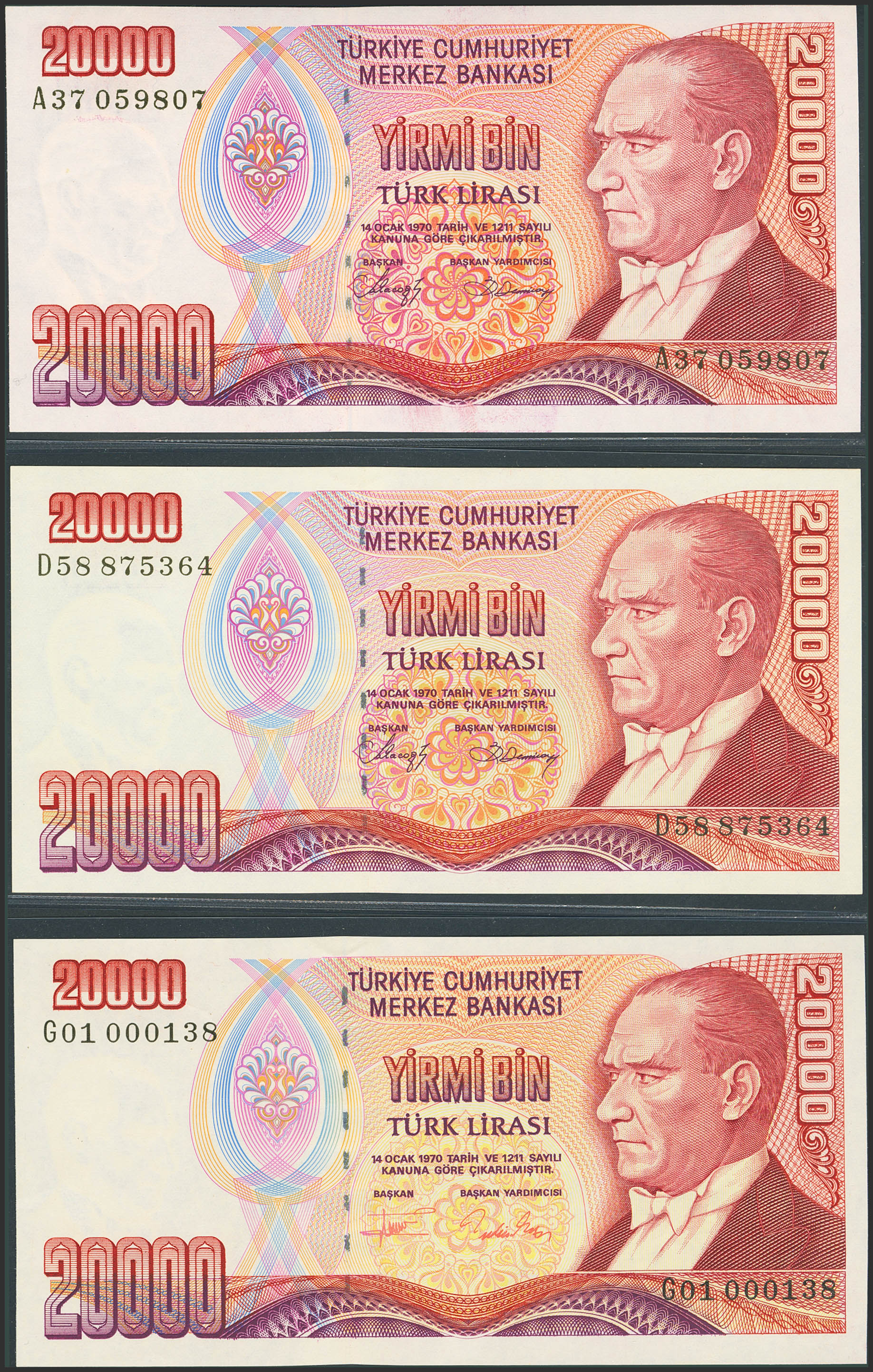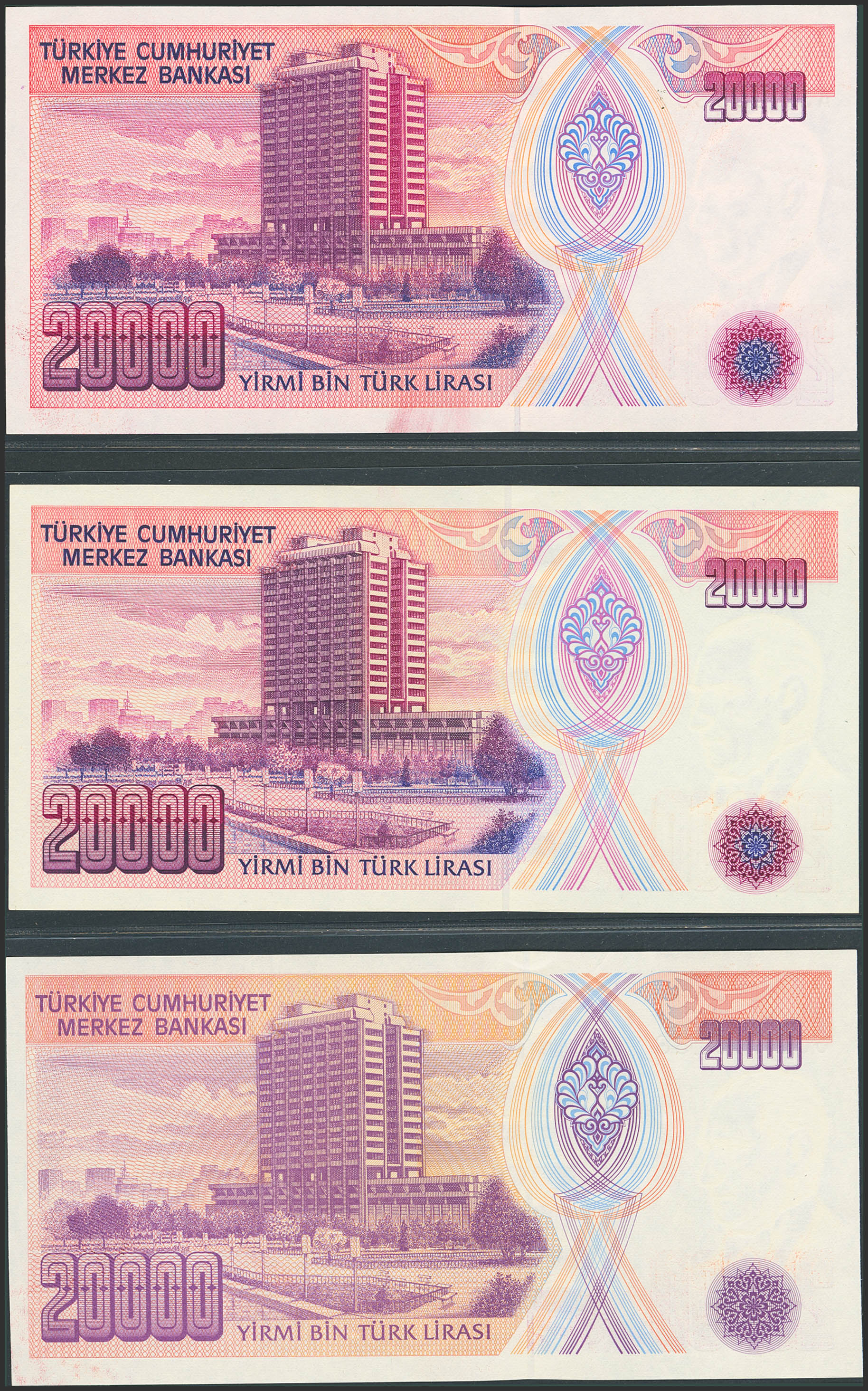 TURKEY-REPUBLIC. Lot of 3 notes of 20000 Lirasi. (1984ca). Central Bank of the Republic. (Pick: 201a, 201b, 202). Less than Uncirculated (1) and Uncirculated (2).