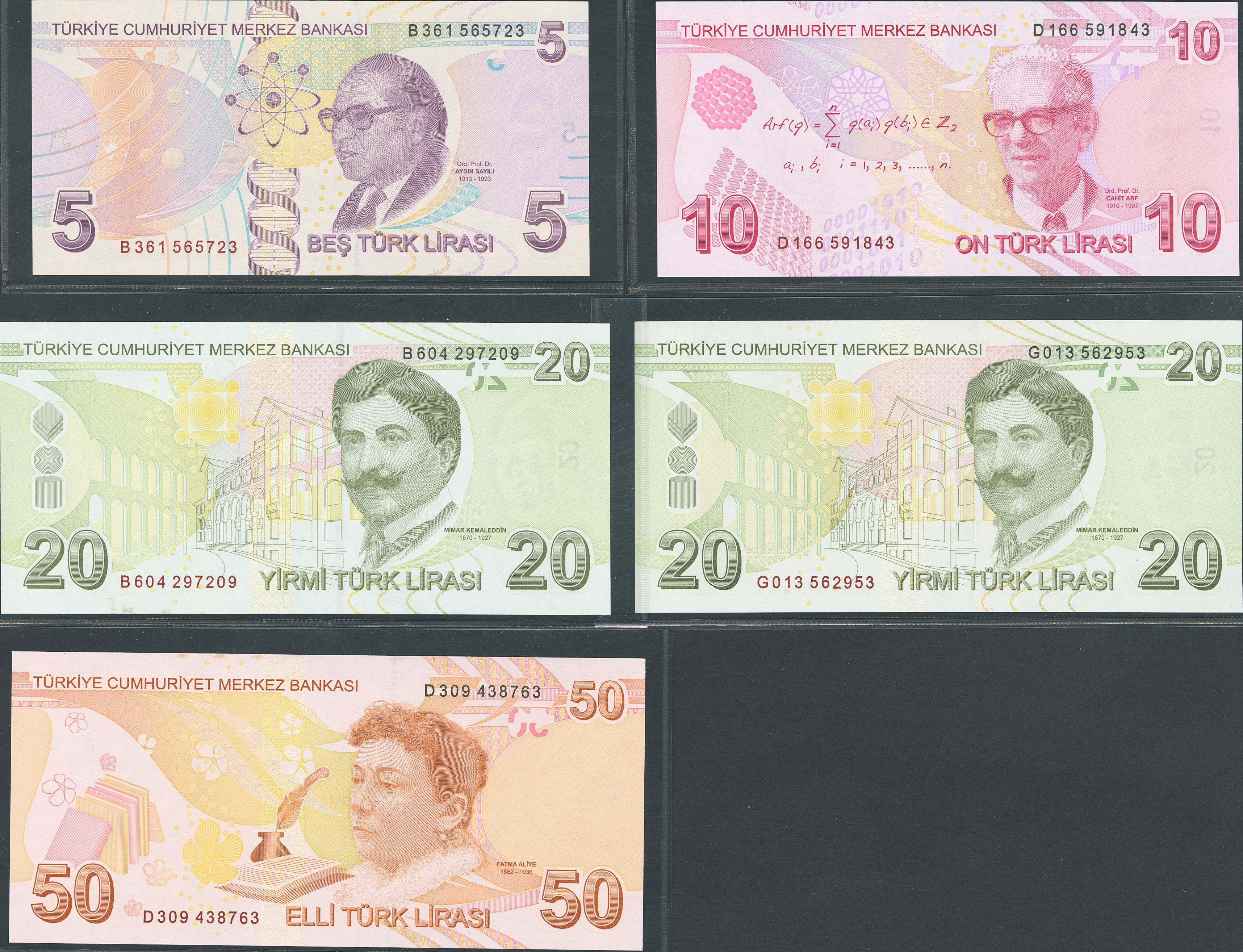 TURKEY-REPUBLIC. Lot of 5 notes from 5 at 50 Lirasi. 2009. Central Bank of the Republic. (Pick: 222b, 223d, 224b, 224f, 225d). Uncirculated.