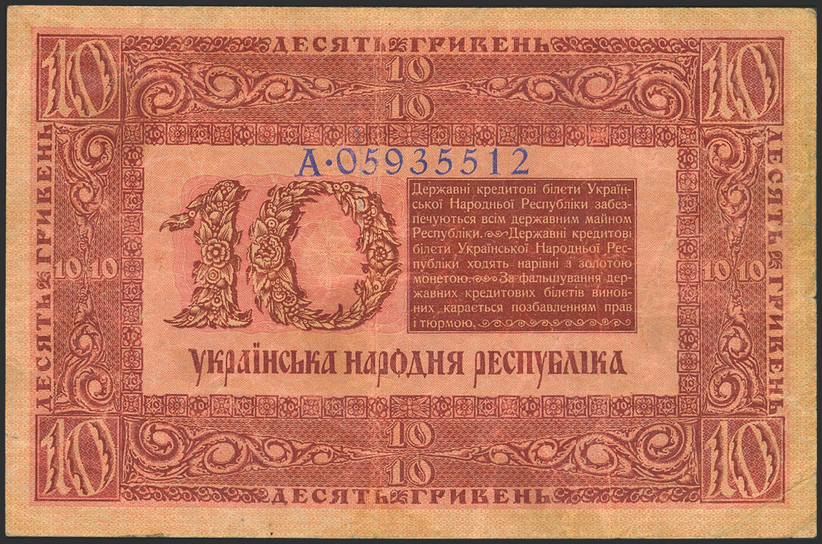 English UKRAINE. 10 Hriven. 1918. Ukraïns'ka Narodnya Respublika. (Pick: 21a). Very Fine, tears.