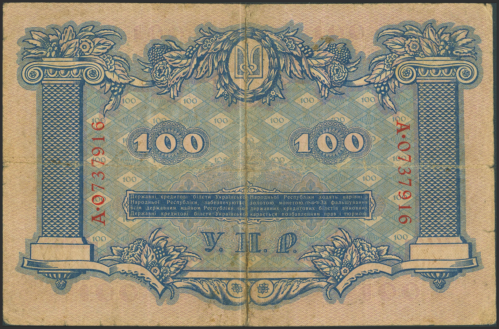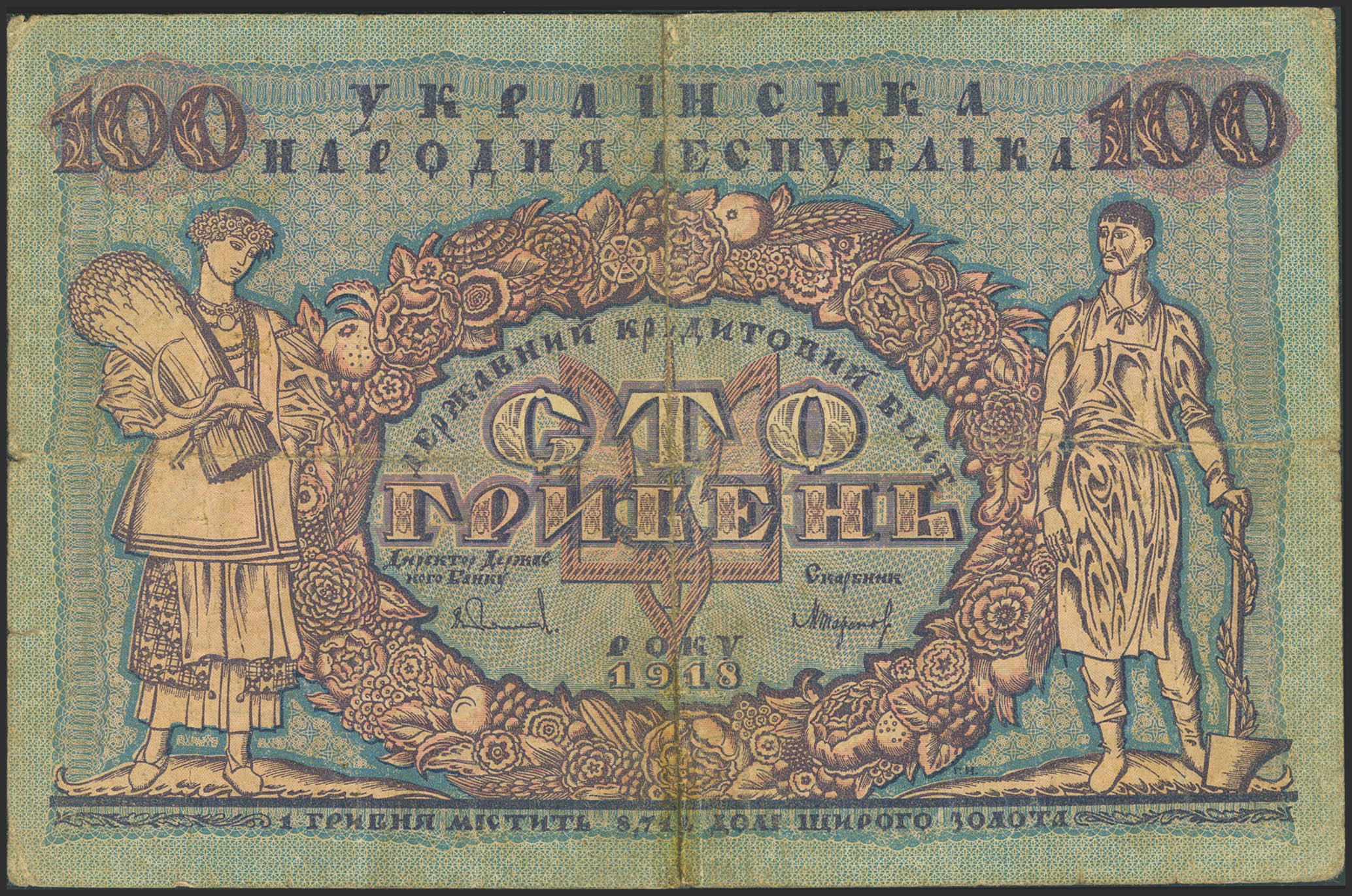 UKRAINE. 100 Hriven. 1918. Ukrainian People's Republic. (Pick: 22a). Very Fine, tears.